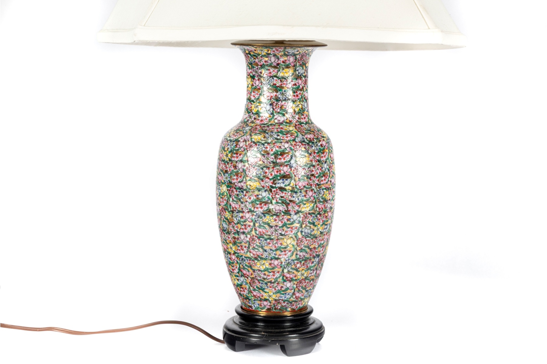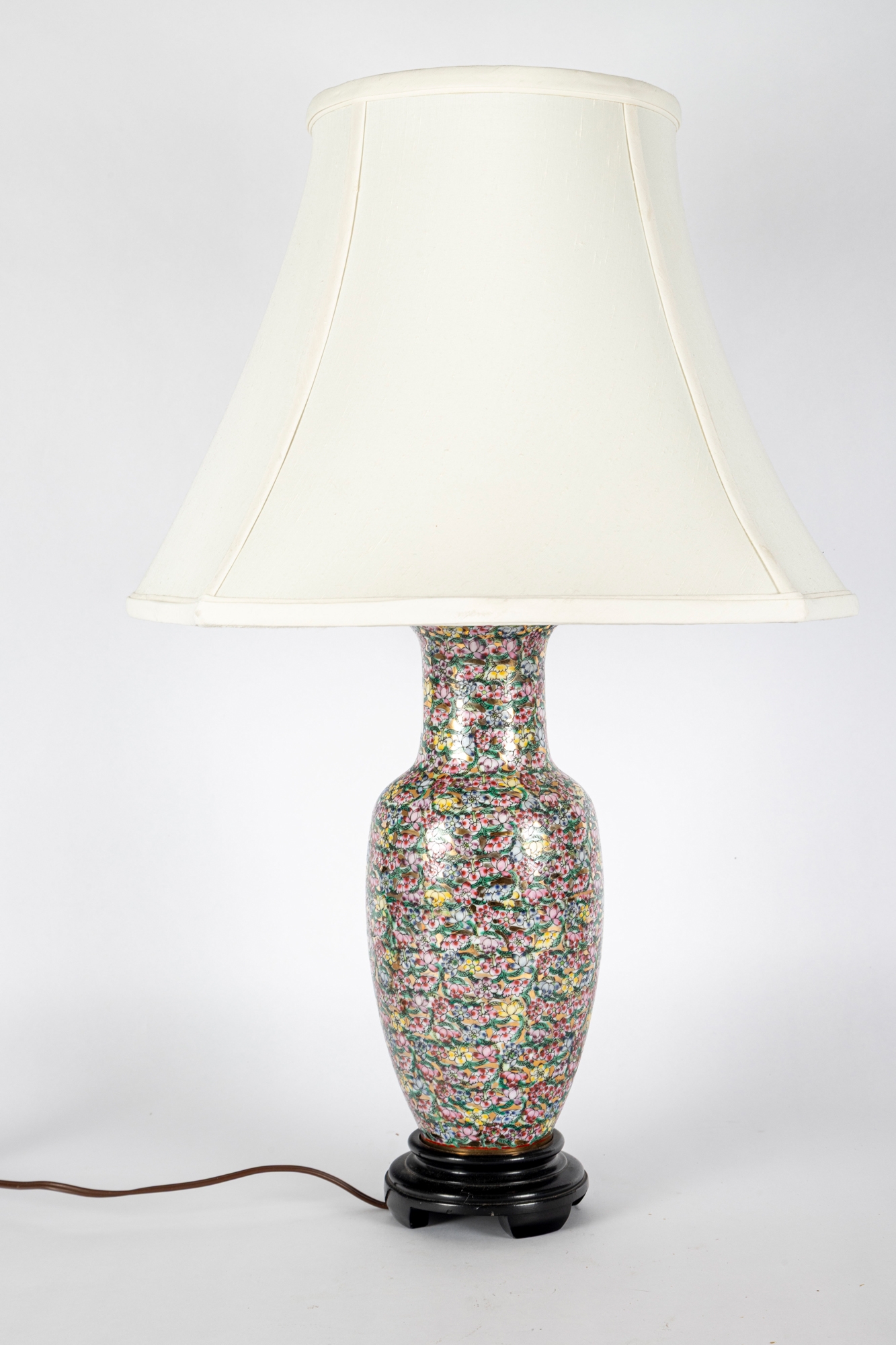 A gorgeous Chinese baluster-form porcelain vase richly decorated in the famille rose palette with dense floral and foliate motifs on a gilt ground. Now mounted as a table lamp on a carved wood base, fitted with a cream fabric shade.