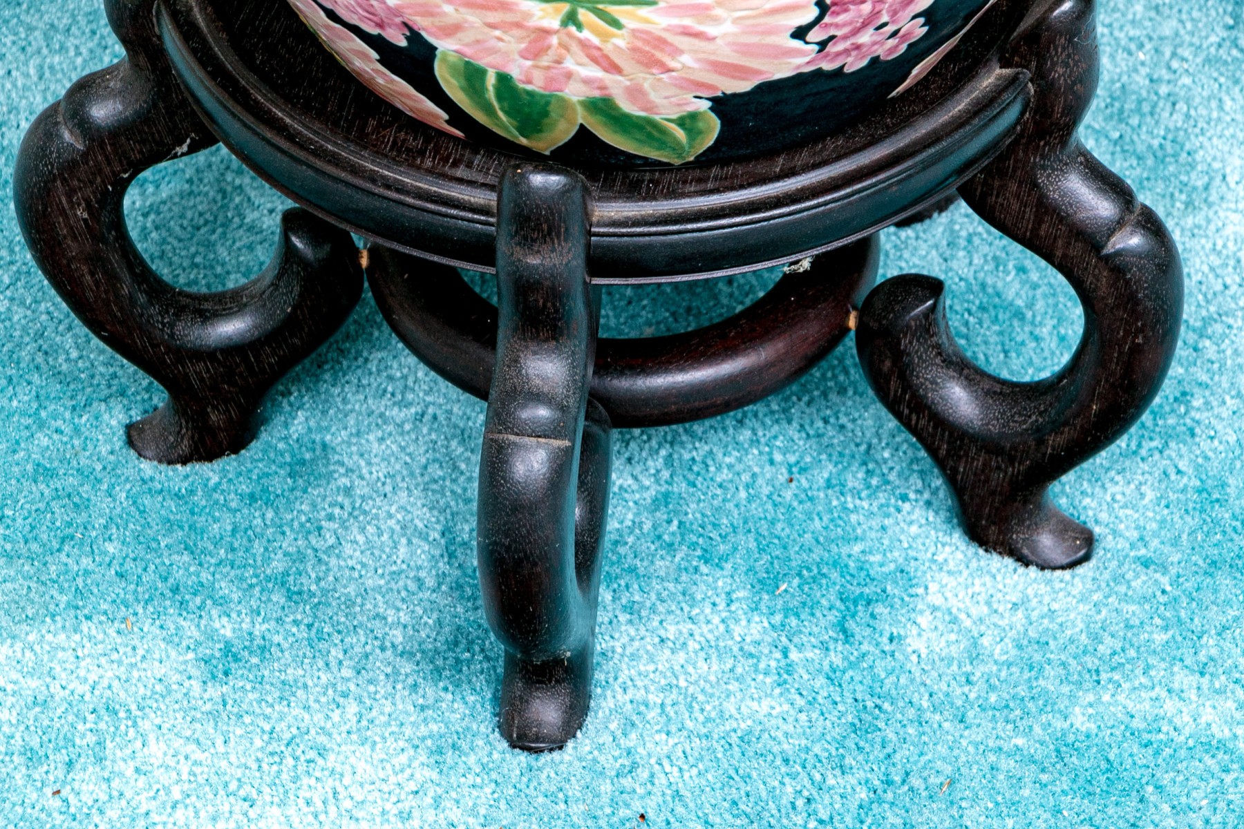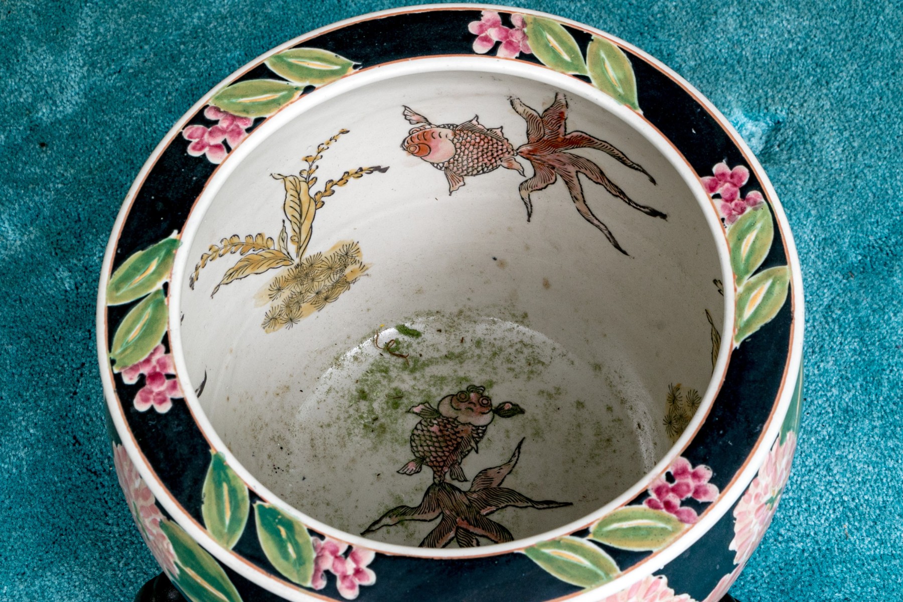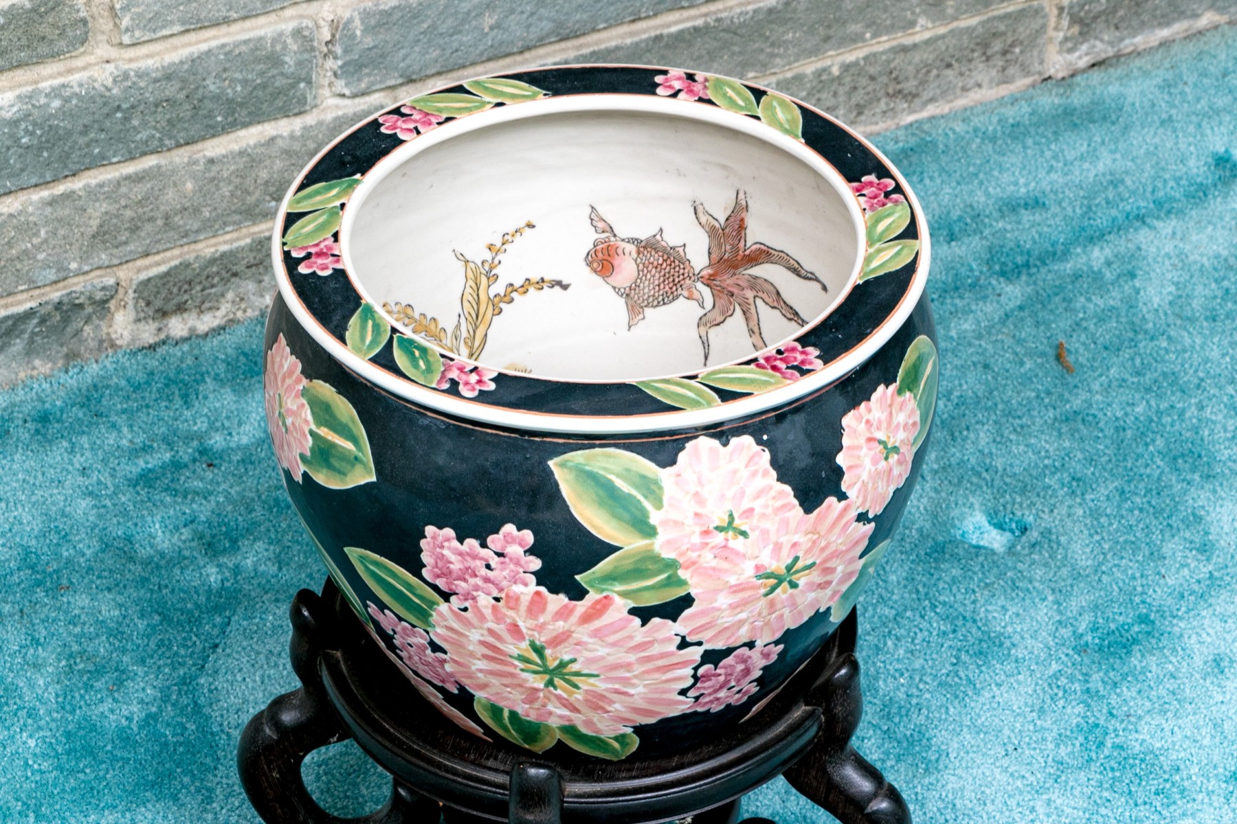 Decorated with lovely famille rose floral motifs on black ground to the exterior with Koi fish painted as swimming to the interior.