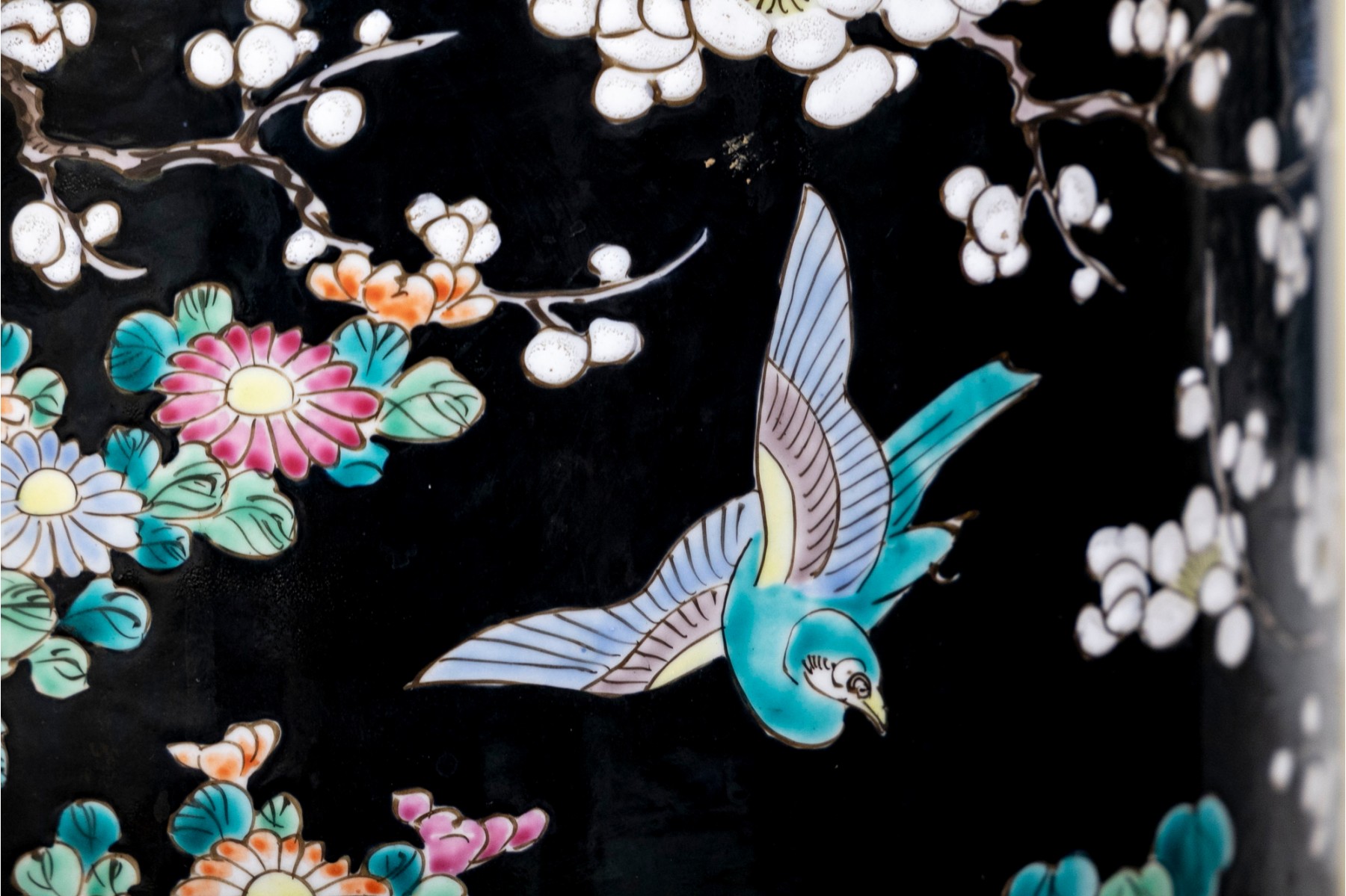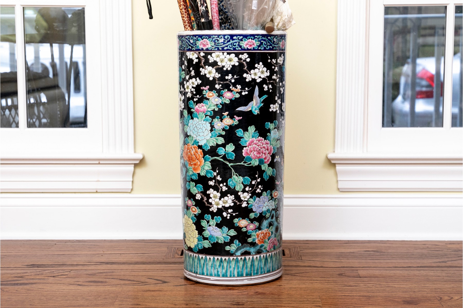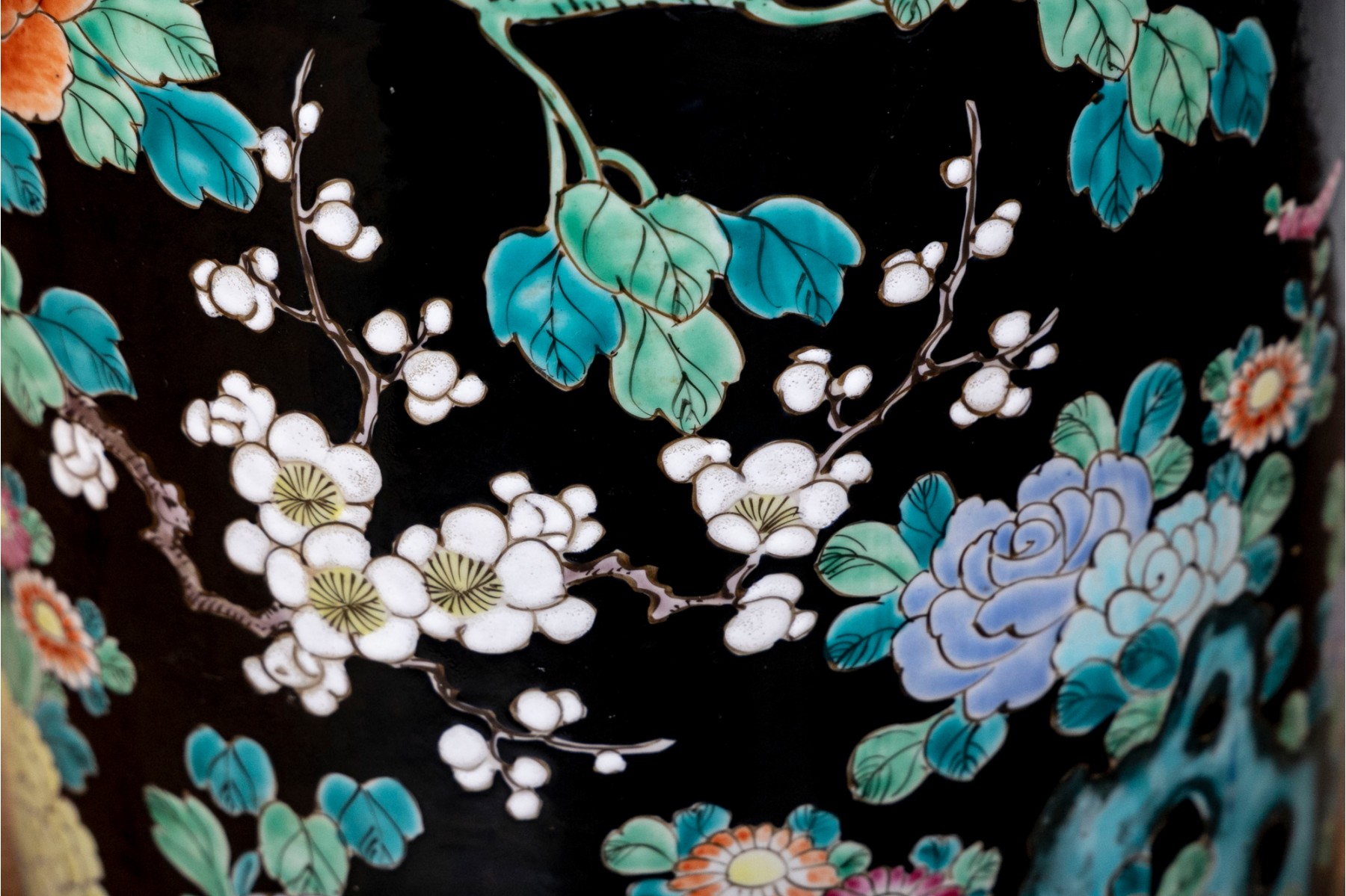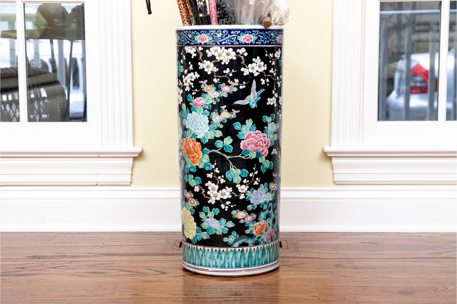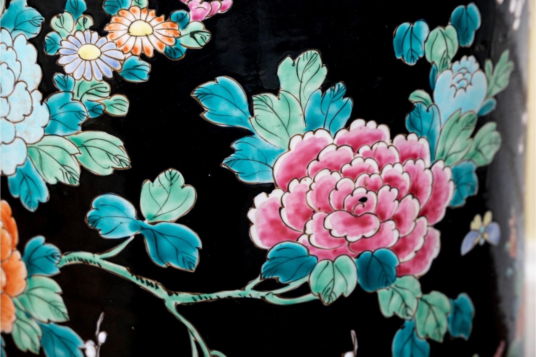 A fantastic Chinese famille rose on black ground porcelain cylindrical umbrella stand. Wonderfully decorative with floral motifs throughout.