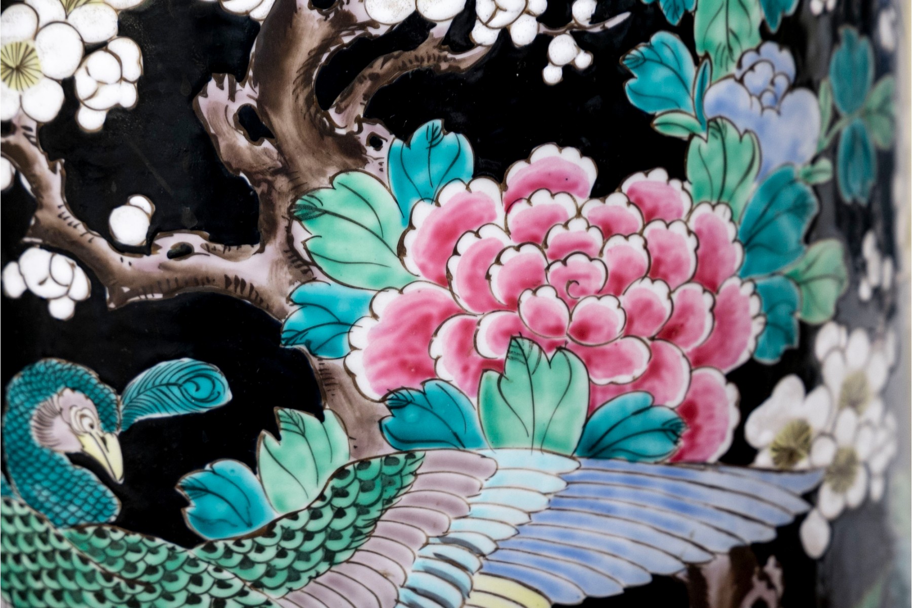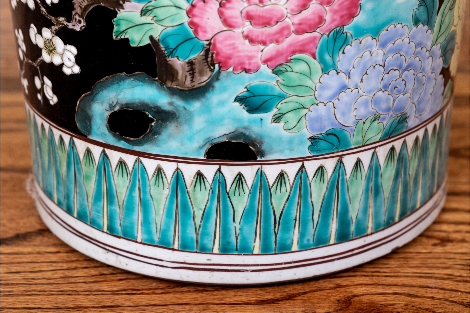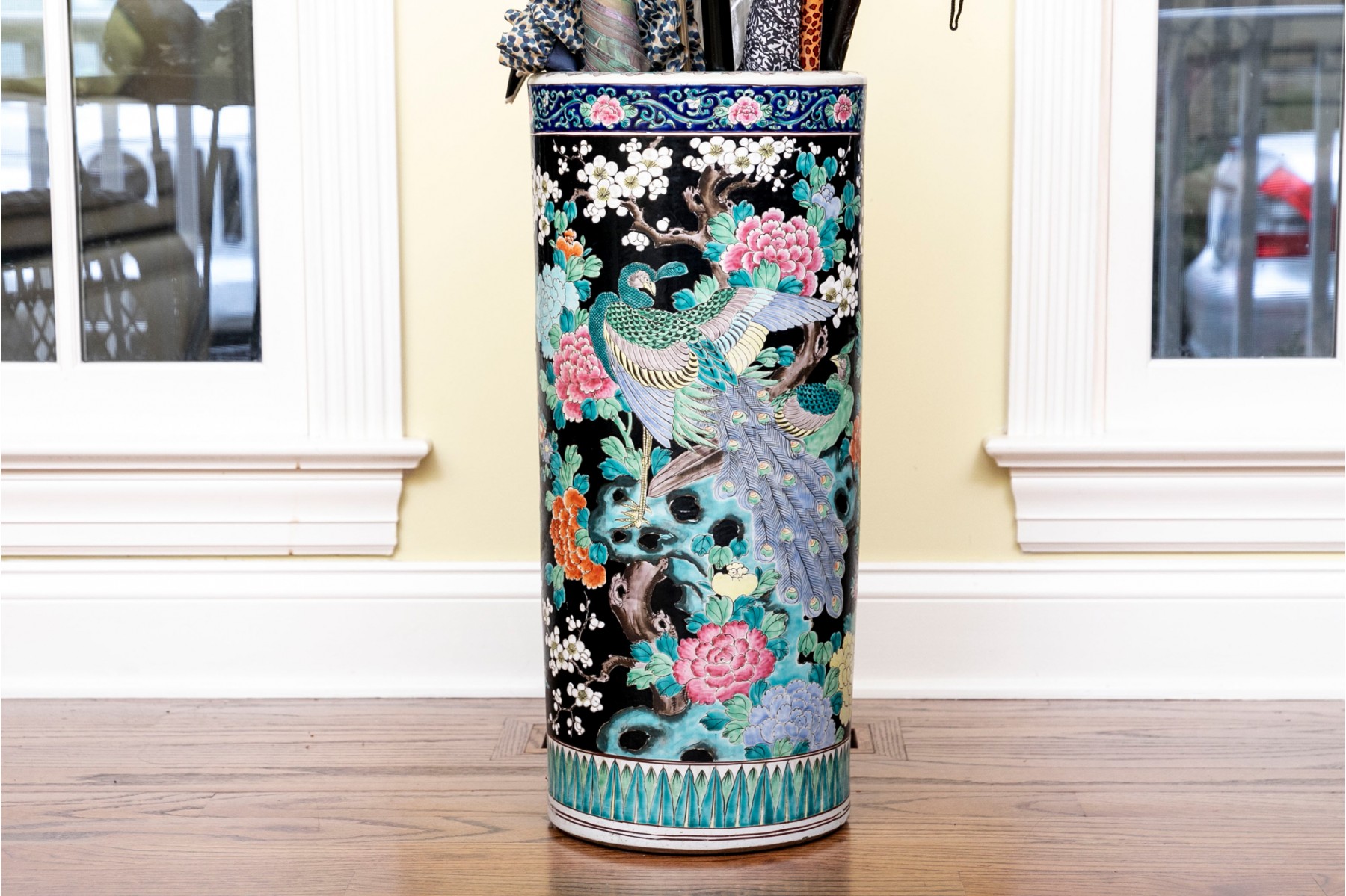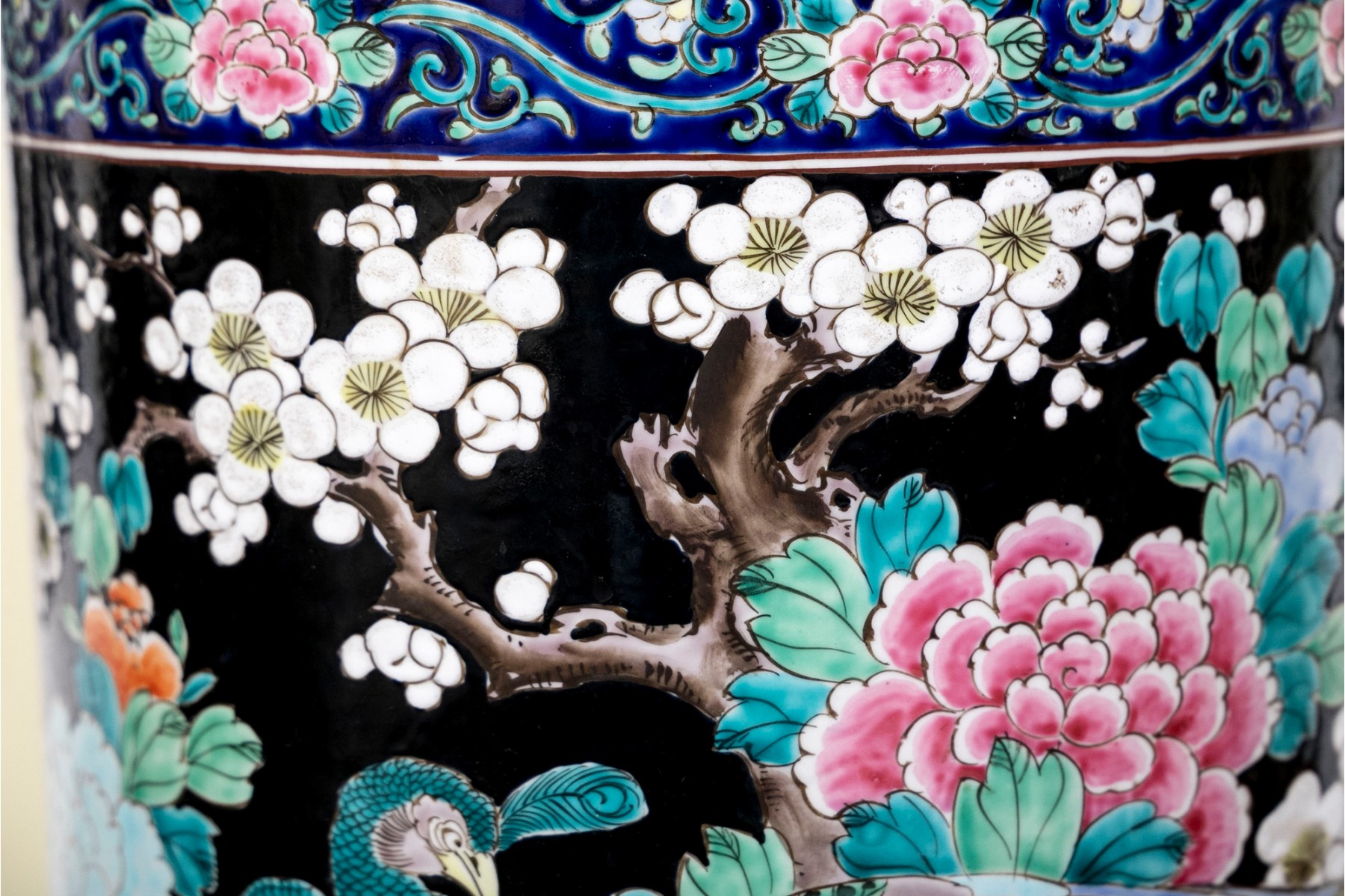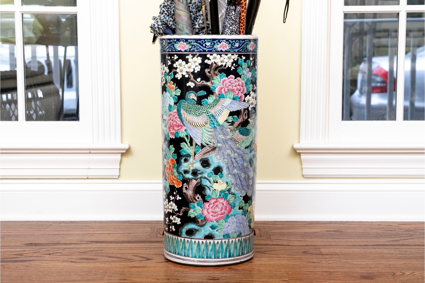 A fantastic Chinese famille rose on black ground porcelain cylindrical umbrella stand. Wonderfully decorative with floral motifs throughout.