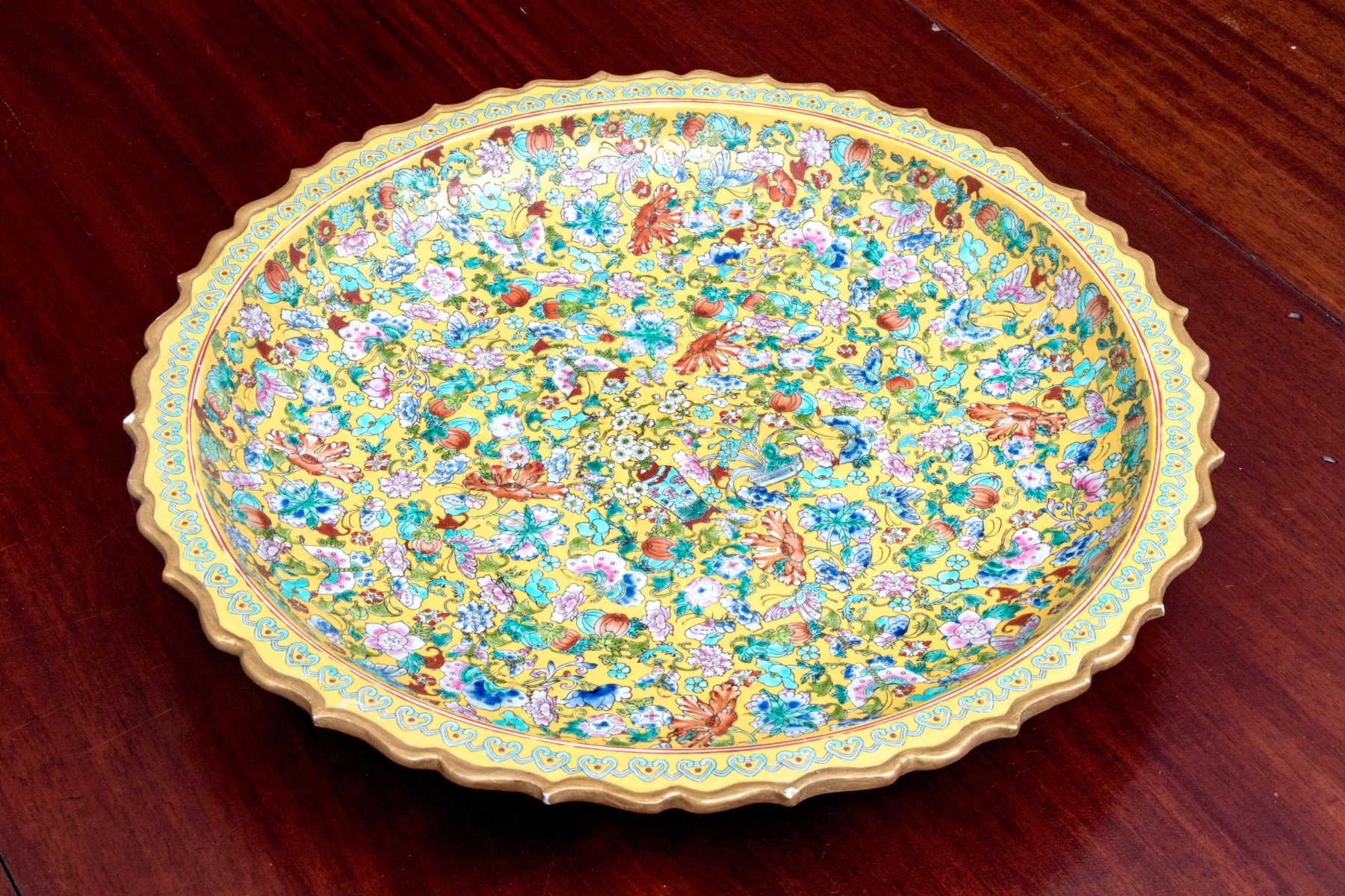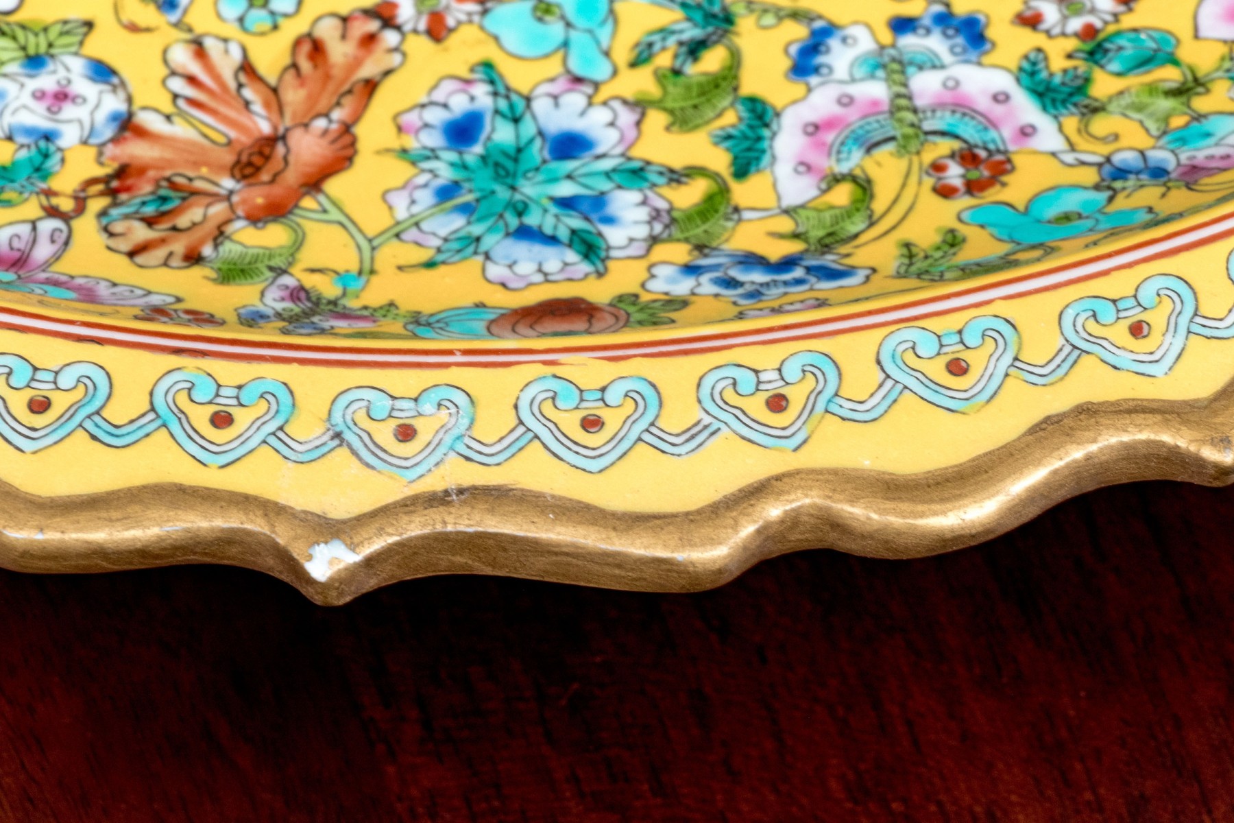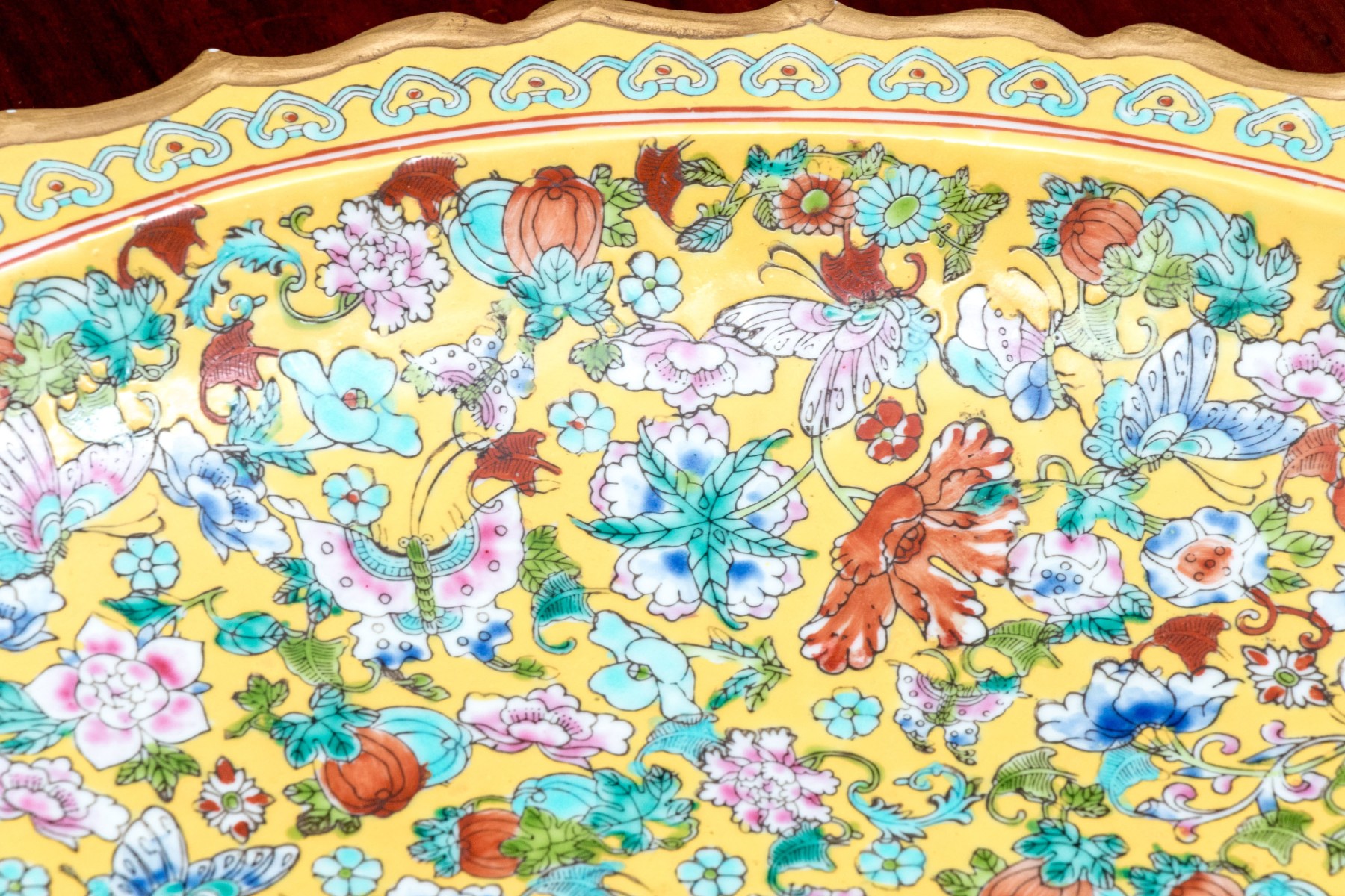 A gorgeous Chinese porcelain charger designed with a finely scalloped and gilt rim, an outer border of blue scrolled heart motifs, and a wide center reserve lavishly decorated with famille rose flowers, vases, and butterflies in vibrant orange-red, blue, pink, and green against a cheerful yellow ground.