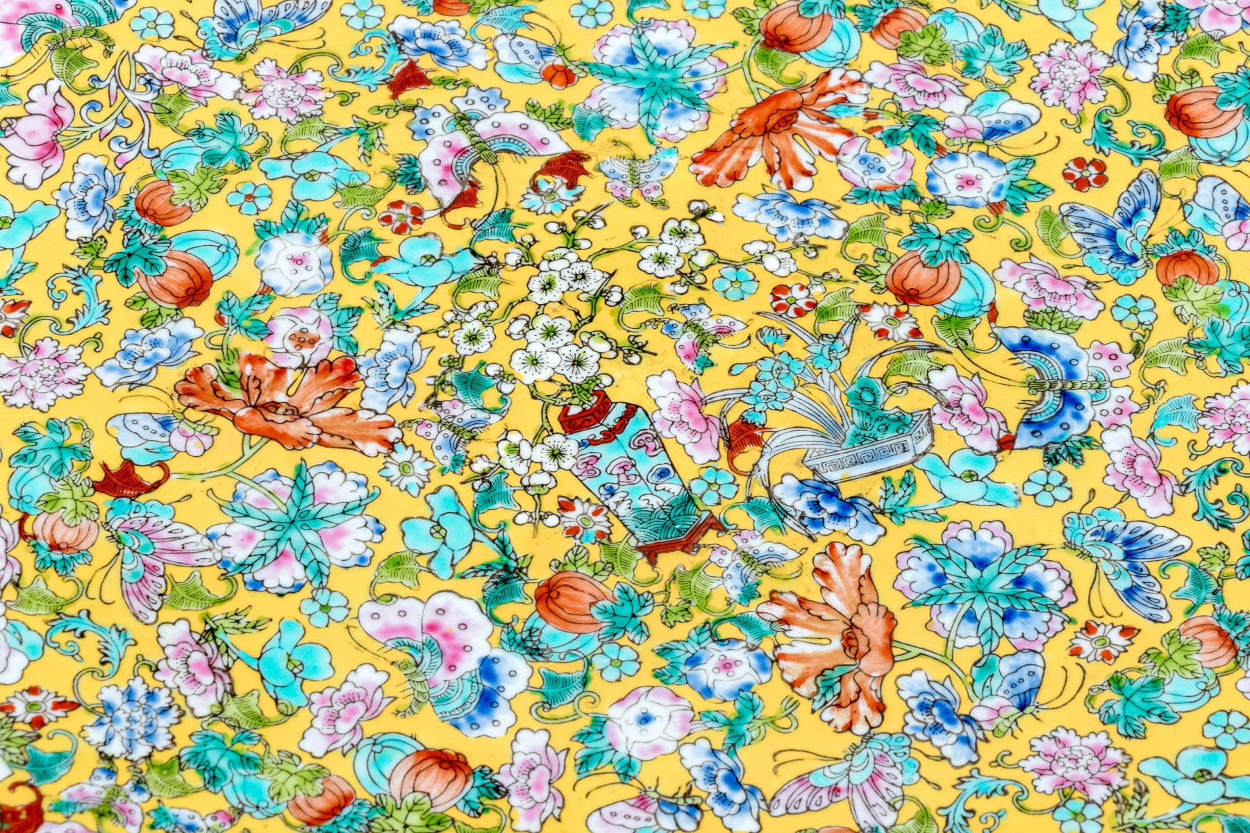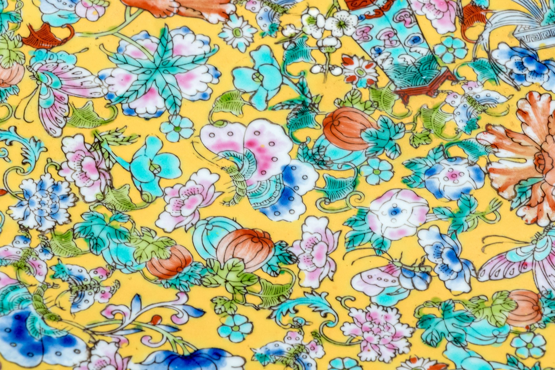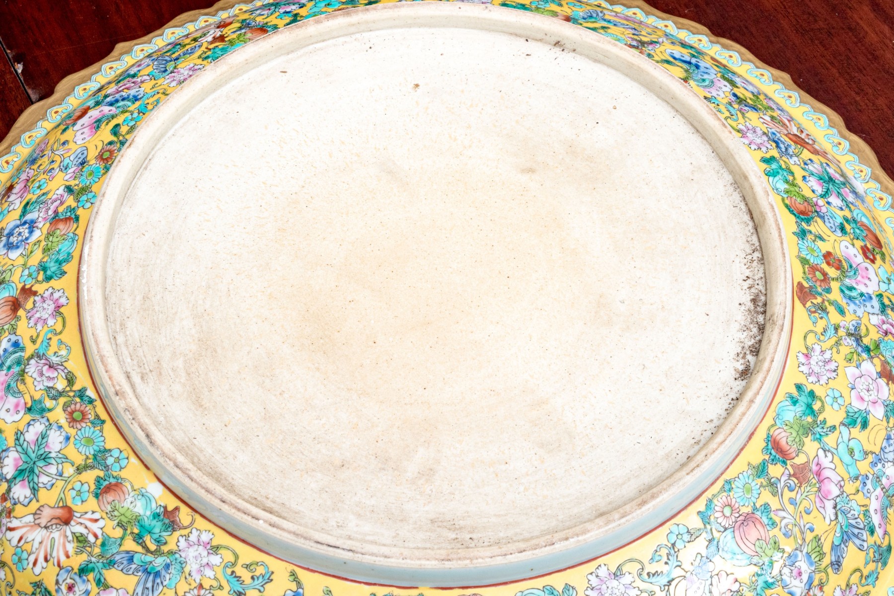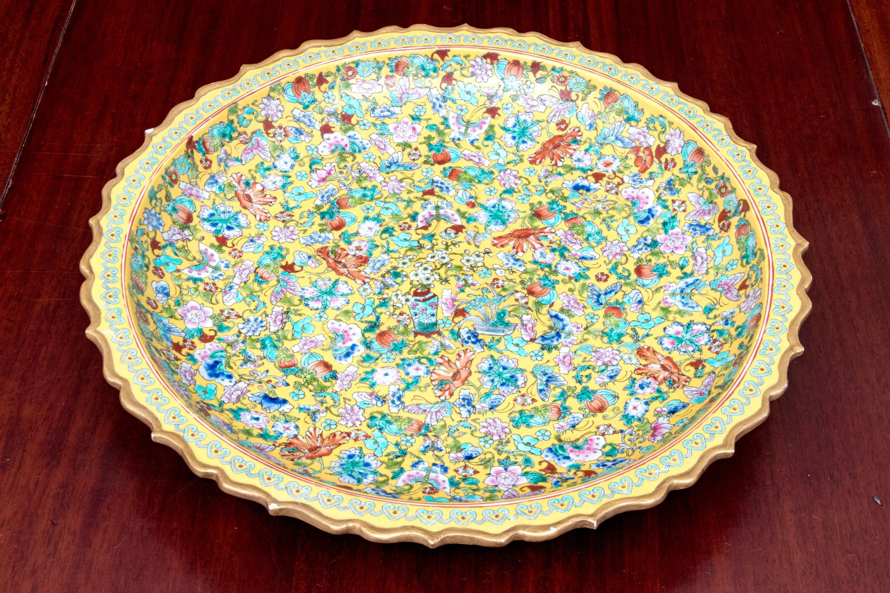 A gorgeous Chinese porcelain charger designed with a finely scalloped and gilt rim, an outer border of blue scrolled heart motifs, and a wide center reserve lavishly decorated with famille rose flowers, vases, and butterflies in vibrant orange-red, blue, pink, and green against a cheerful yellow ground.