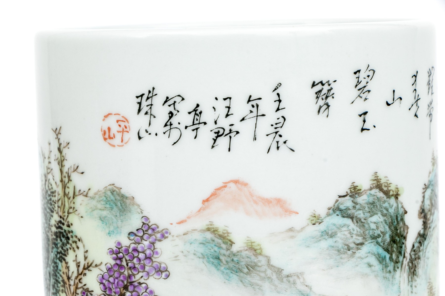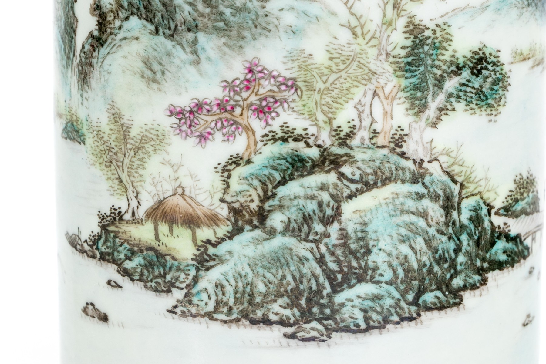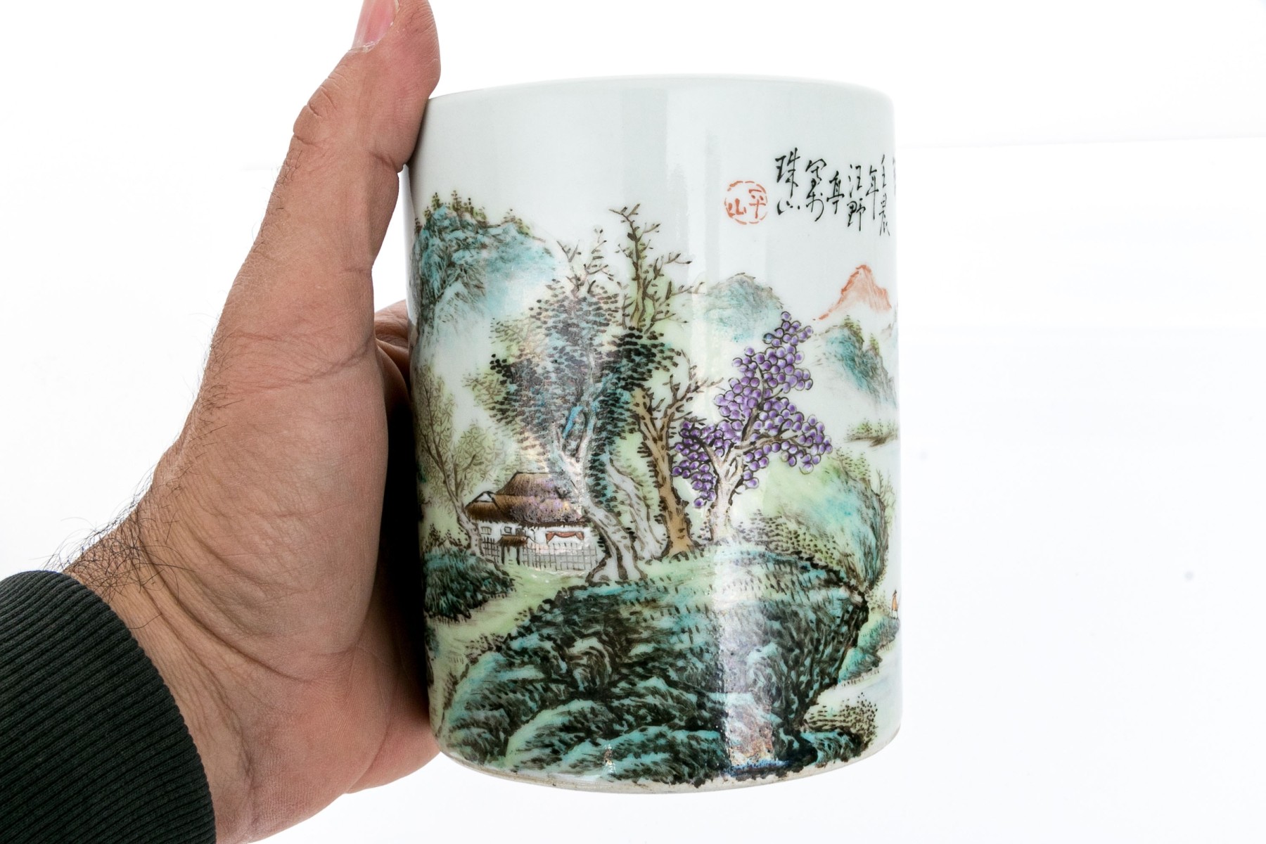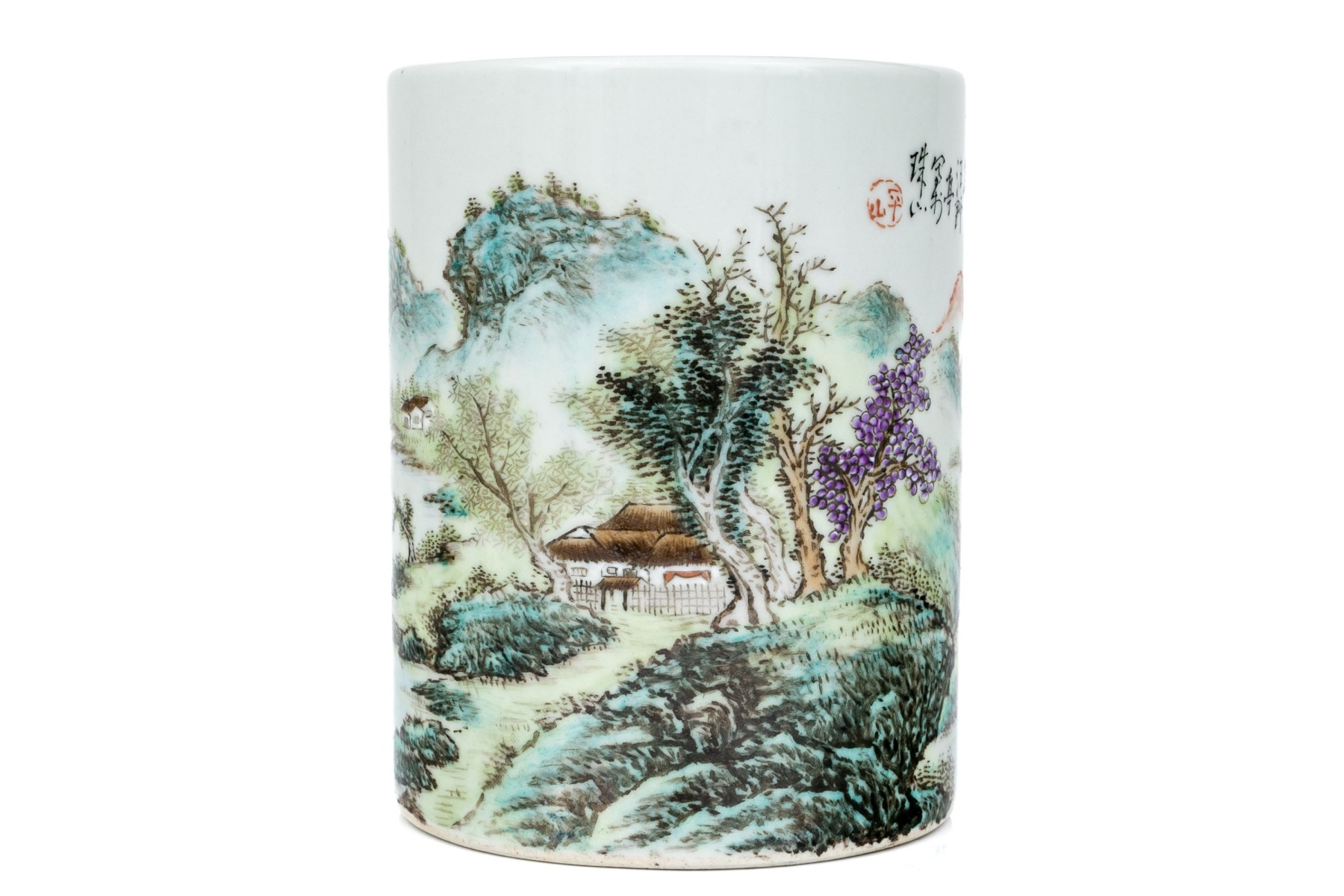 20th century. A scholarly brush pot finely painted with a rocky river landscape with a pagoda and a fisherman. With calligraphy above.