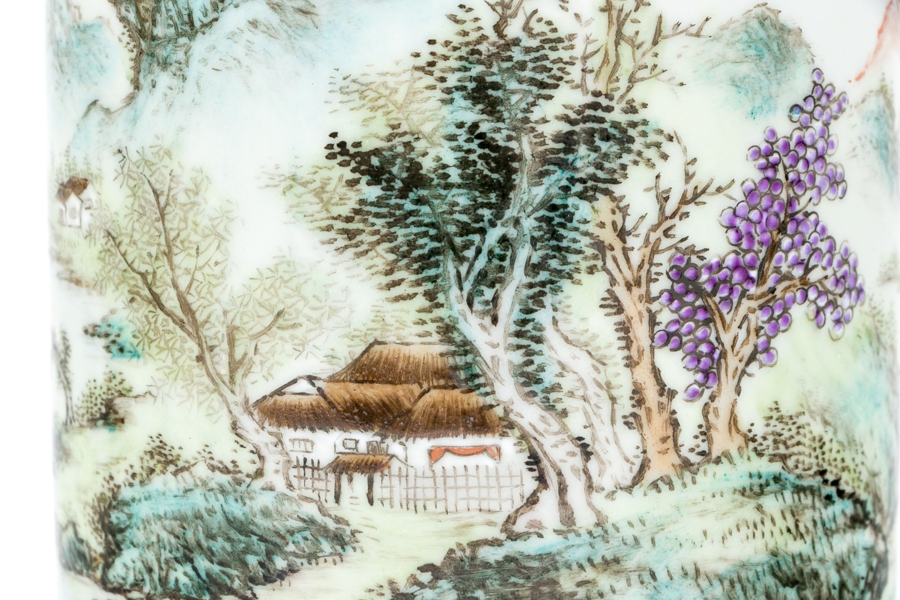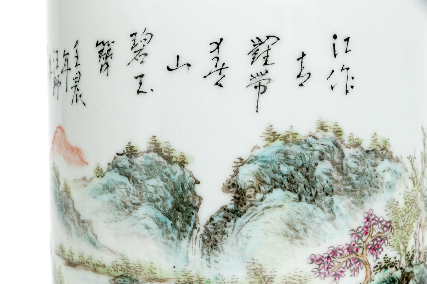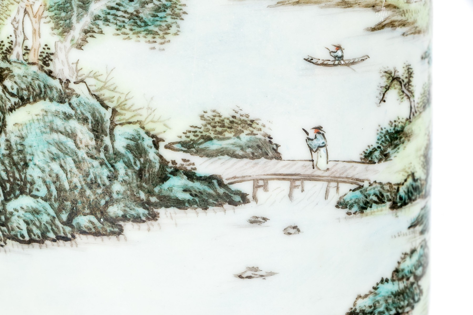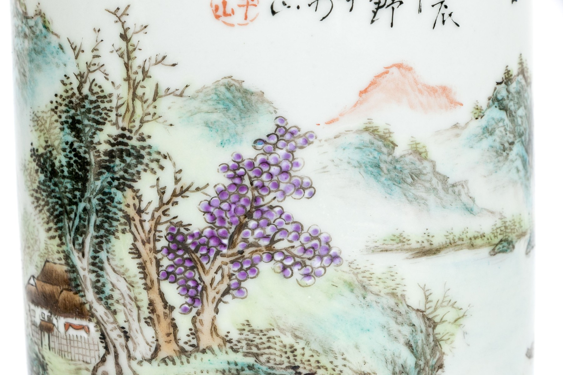 20th century. A scholarly brush pot finely painted with a rocky river landscape with a pagoda and a fisherman. With calligraphy above.