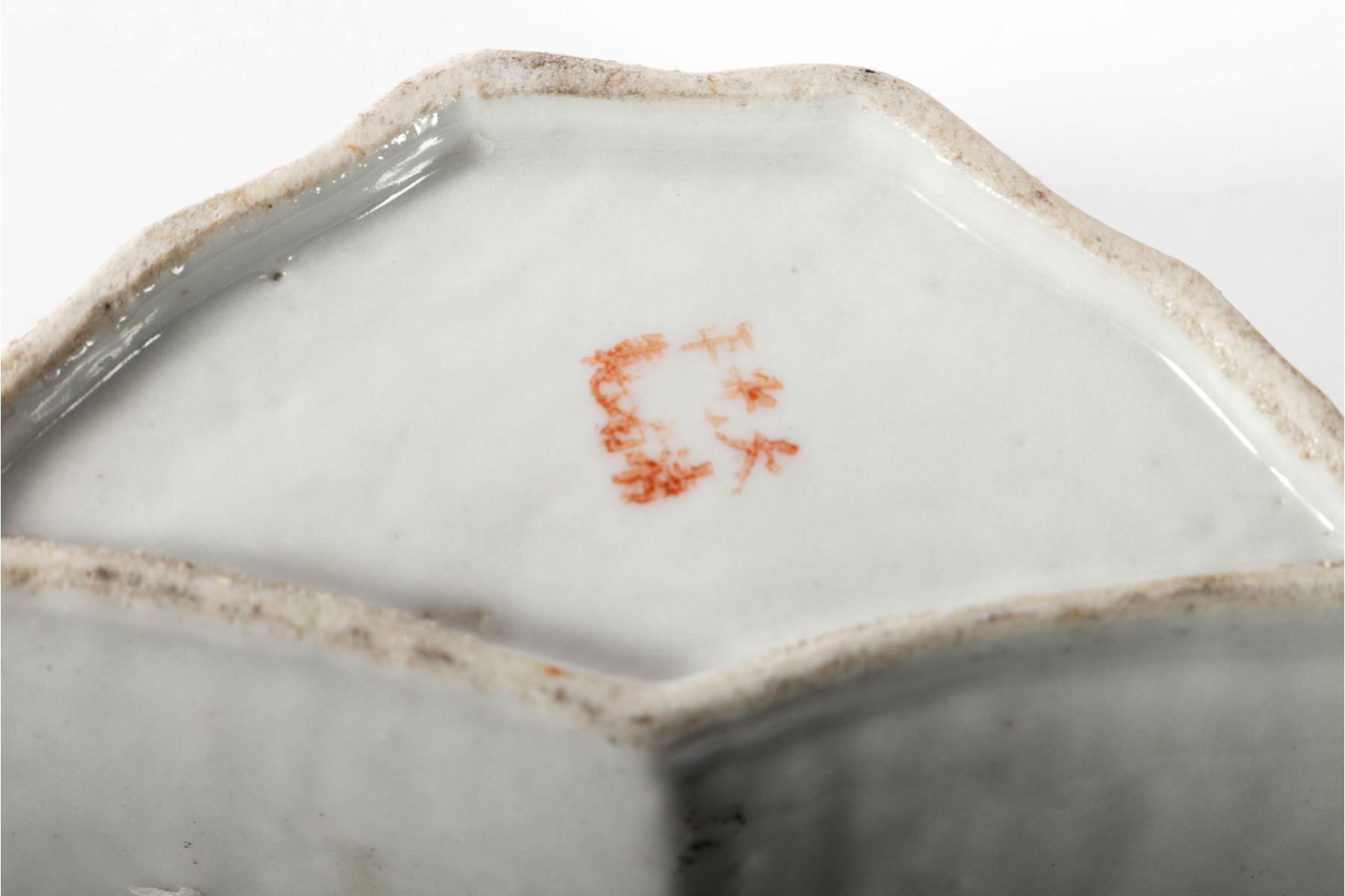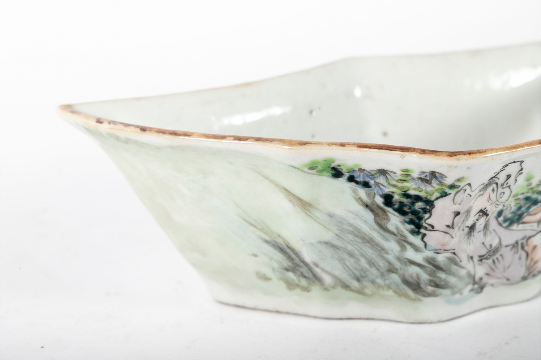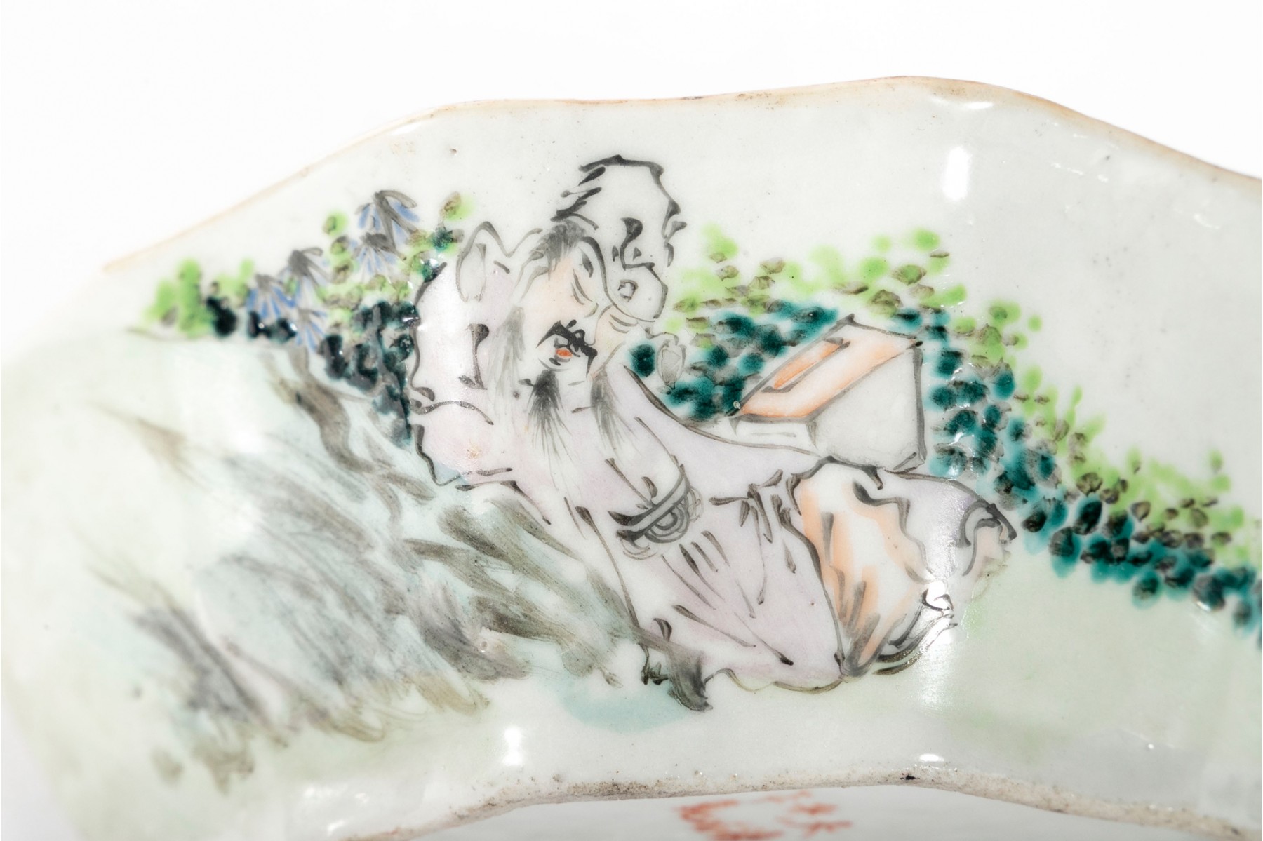 Chinese porcelain bowl in a beautiful faceted crescent shape, featuring a famille rose scene of a man in a pale pink-purple robe resting against a rocky hill dotted with light and dark green foliage along pretty indigo flowers. Marked on the underside.