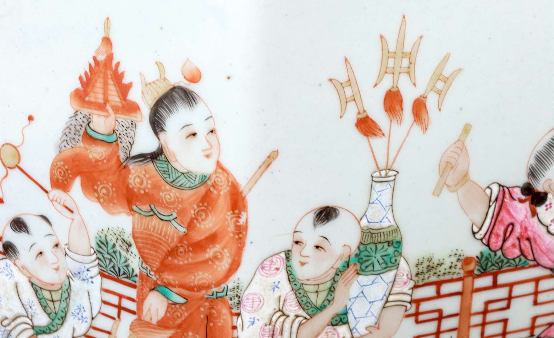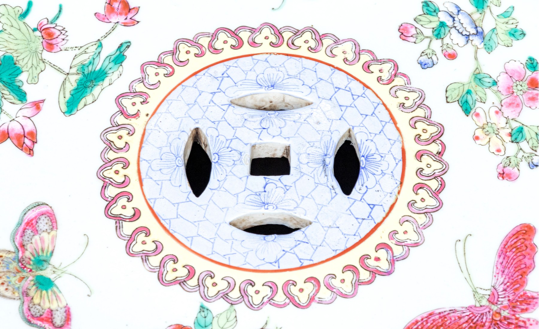 A Chinese famille rose enameled porcelain hexagonal garden stool.