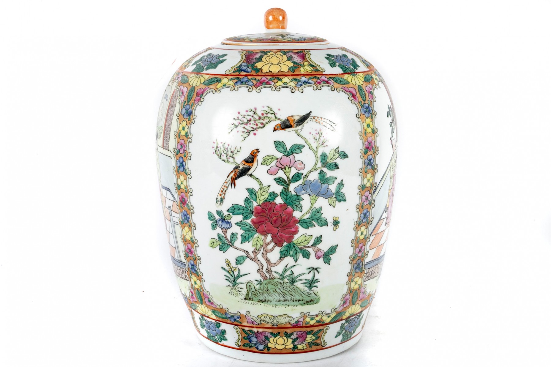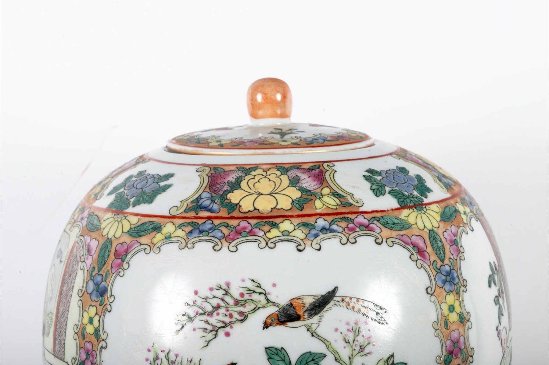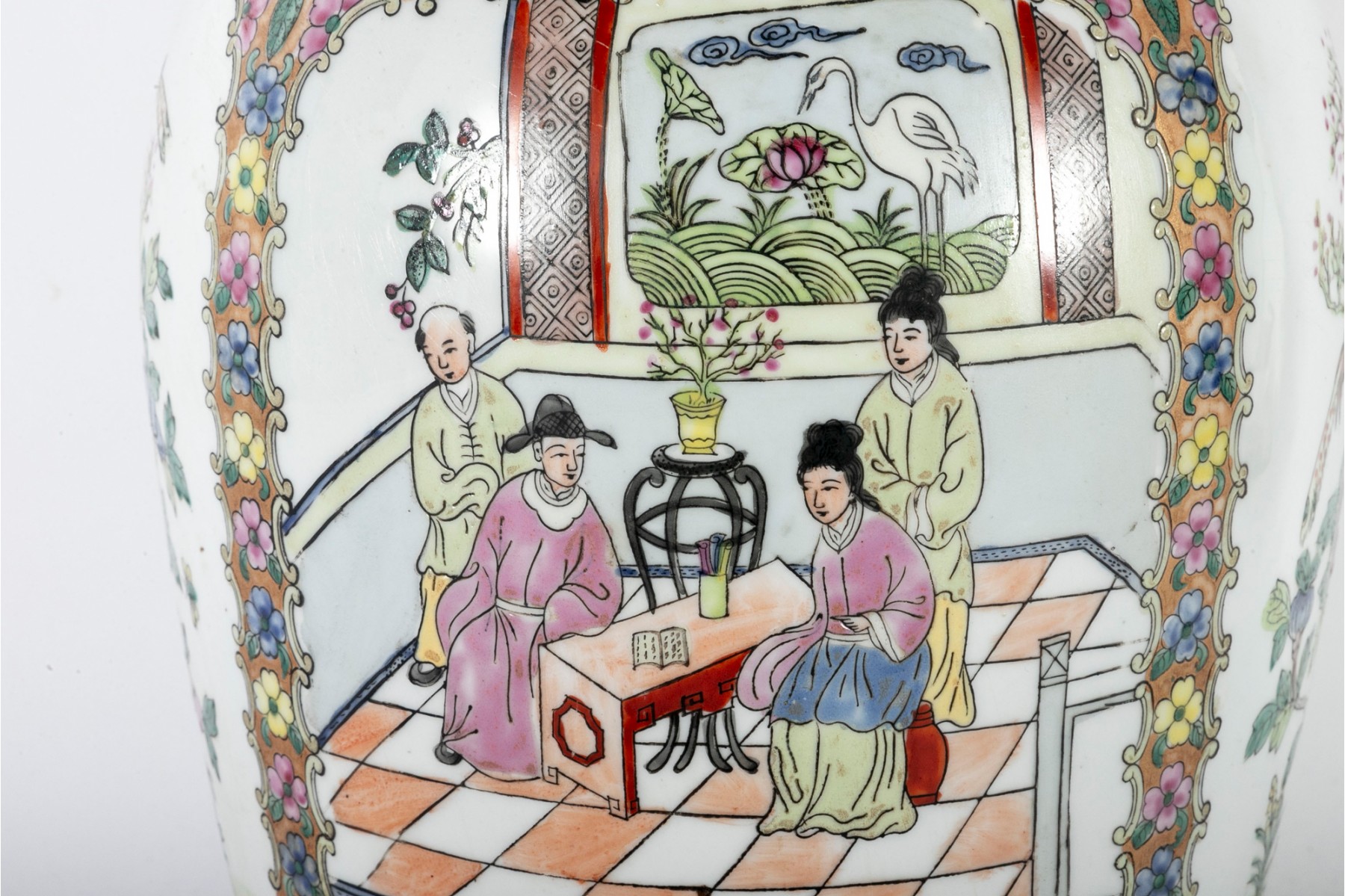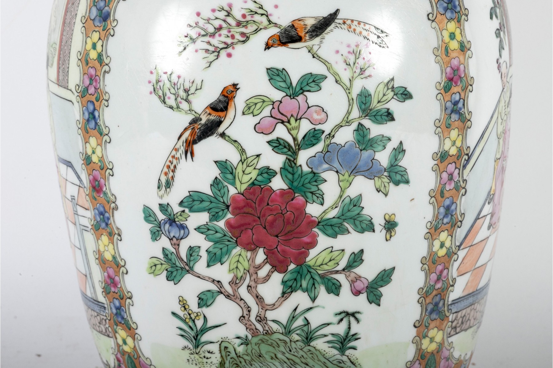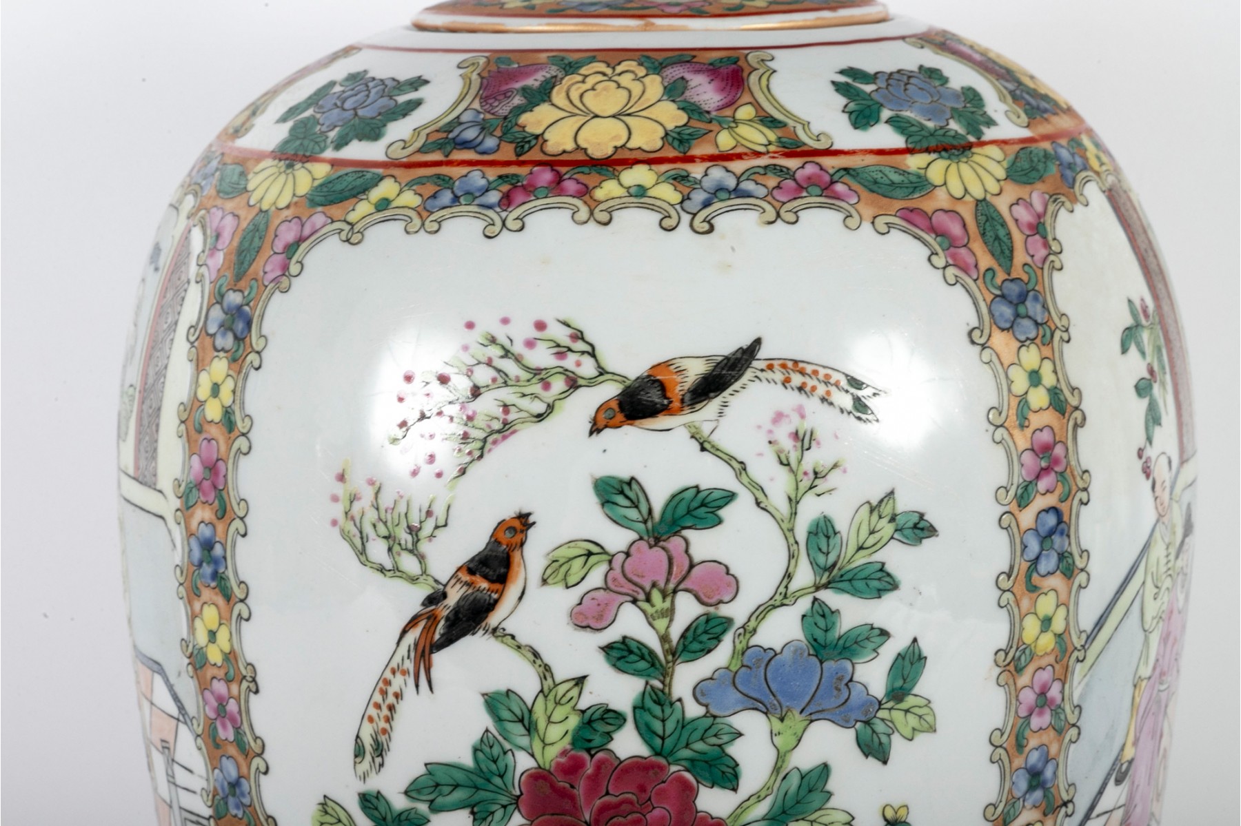 A beautifully detailed and nicely sized Chinese porcelain lidded jar in an elongated apple shape with a flush lid topped with a bun-shaped finial. The jar features famille rose scenes of figures enjoying conversation in an interior, with a pale orange and white checkerboard floor and wall art of herons and lotus plants; alternating between scenes of brown and black birds perched on large flowering bushes. Marked on the underside.