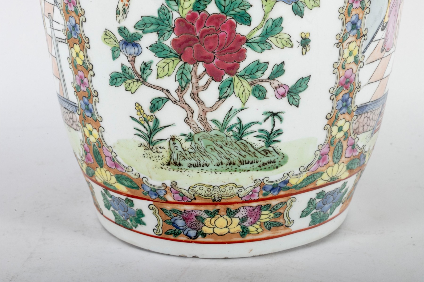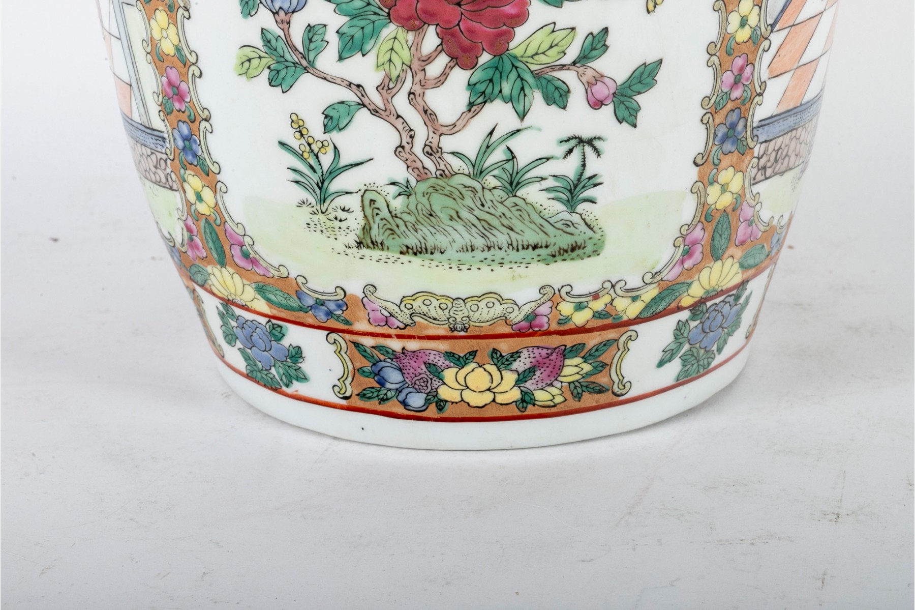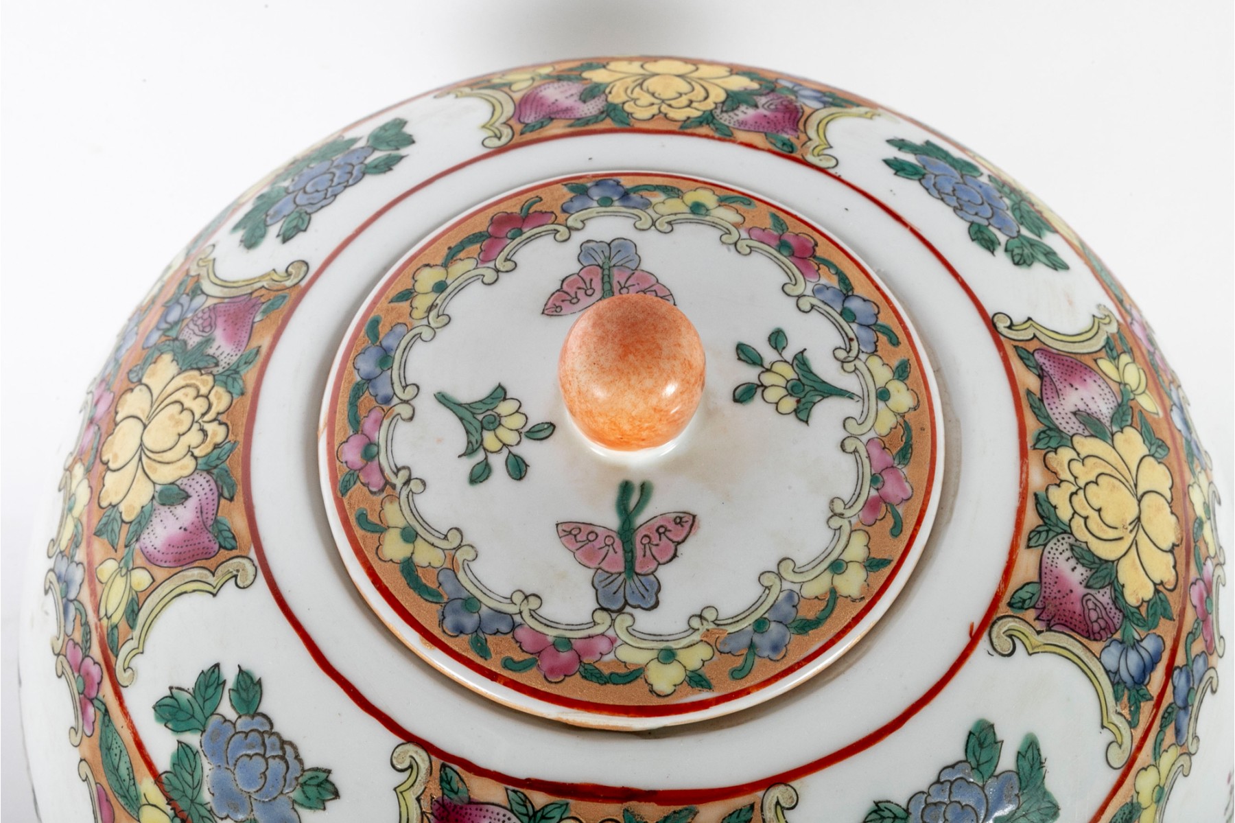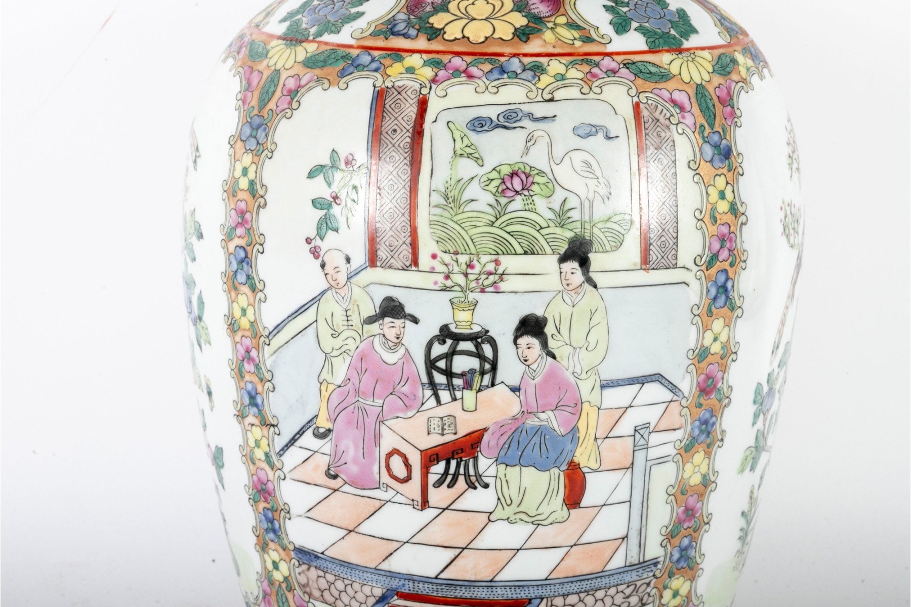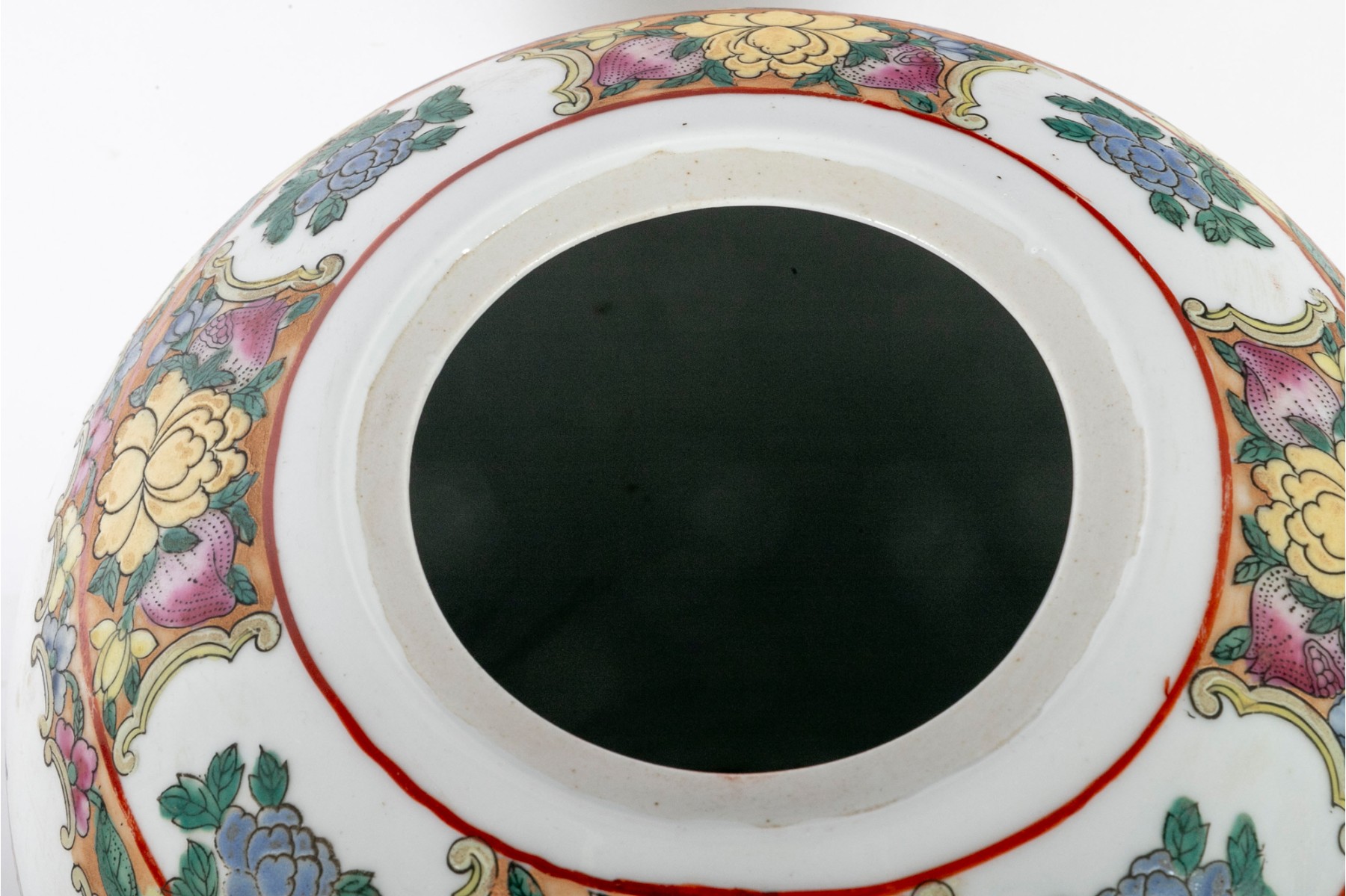 A beautifully detailed and nicely sized Chinese porcelain lidded jar in an elongated apple shape with a flush lid topped with a bun-shaped finial. The jar features famille rose scenes of figures enjoying conversation in an interior, with a pale orange and white checkerboard floor and wall art of herons and lotus plants; alternating between scenes of brown and black birds perched on large flowering bushes. Marked on the underside.
