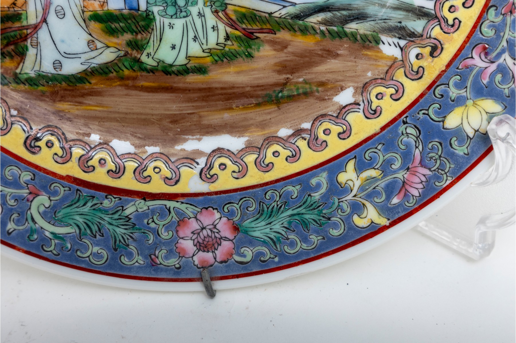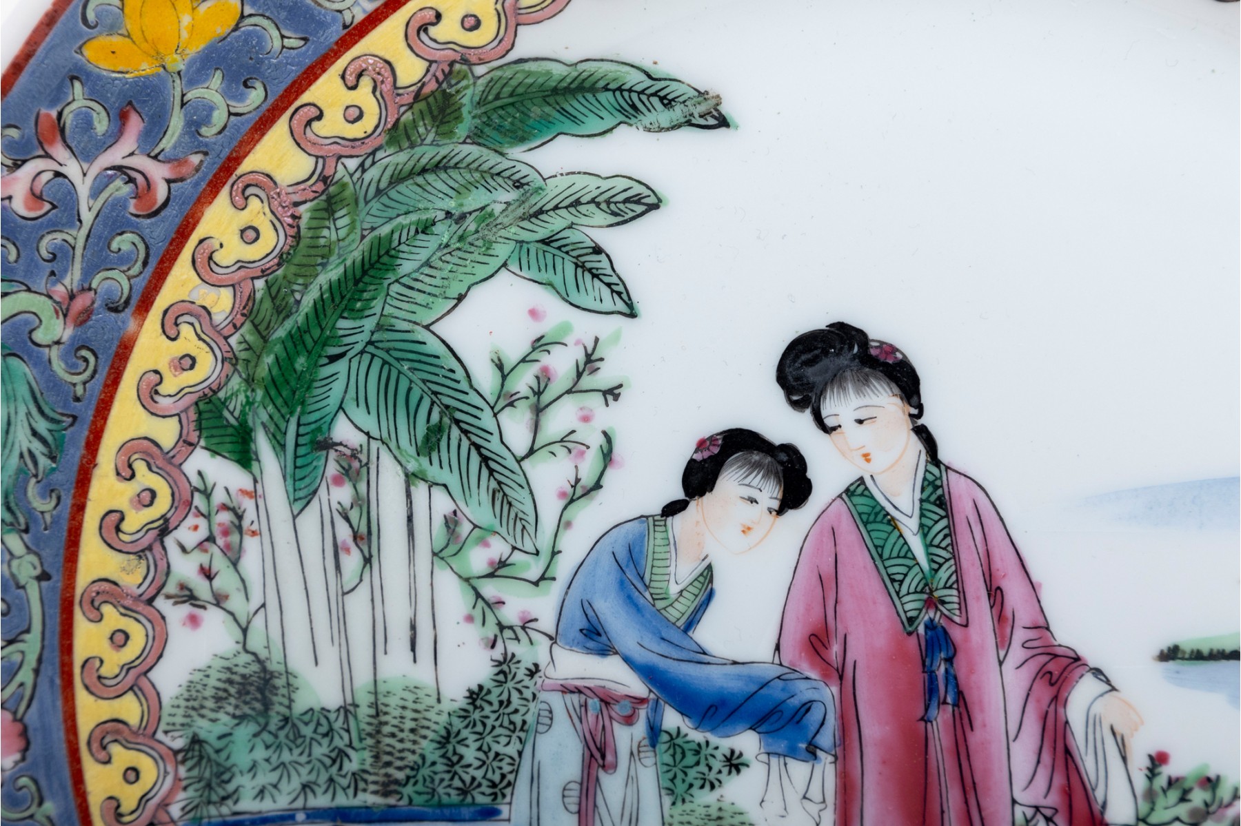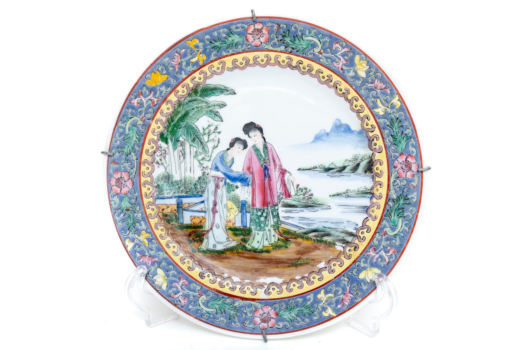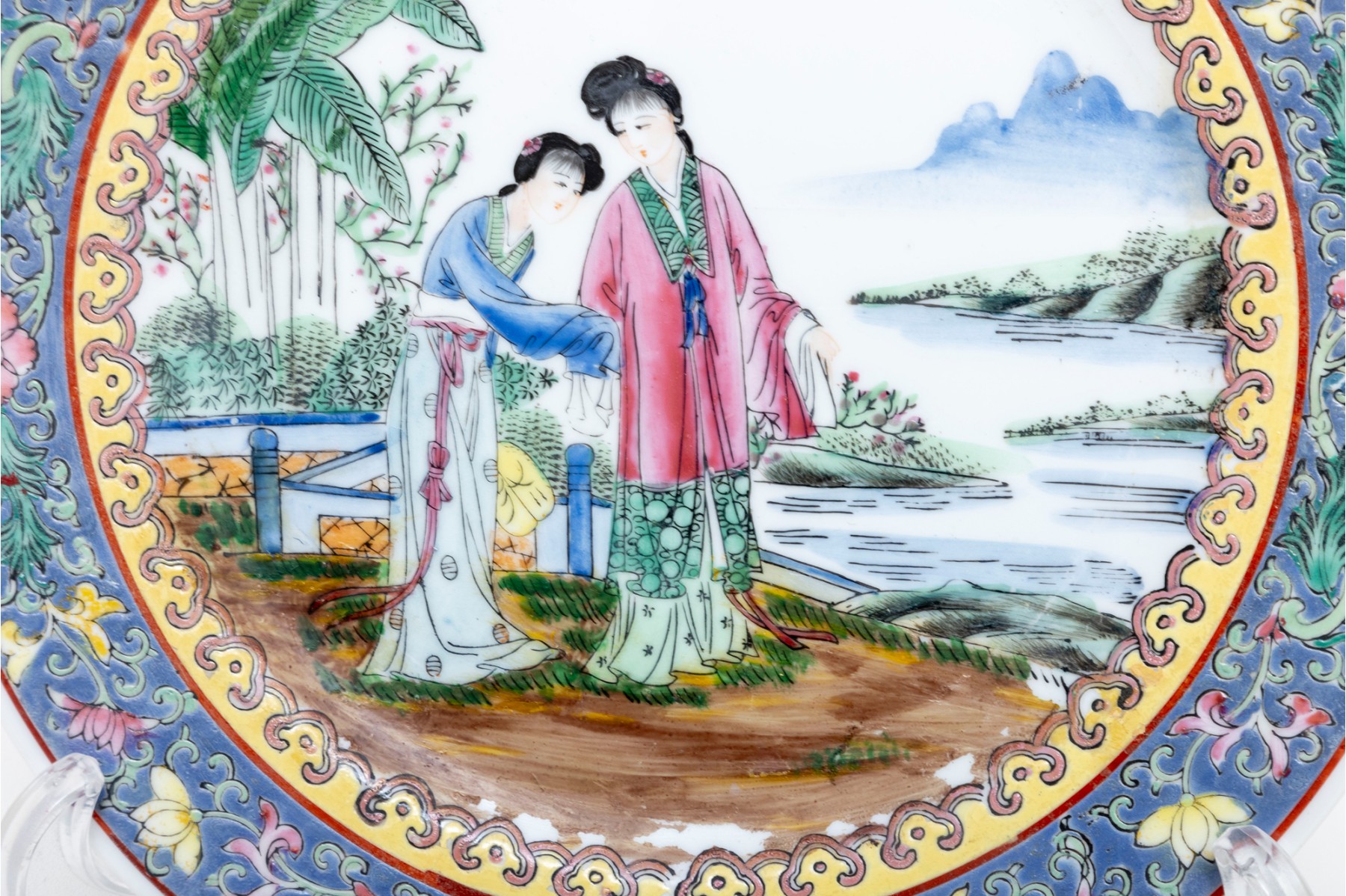 Chinese porcelain plate displaying a famille rose scene of two women enjoying a view of a lake along a mountain, standing on a grassy clearing lined with a blue fence and lush foliage. The scene is surrounded by yellow, pink, and periwinkle borders with pretty floral sprays. Marked on the underside and mounted in wall-hanging hardware.
