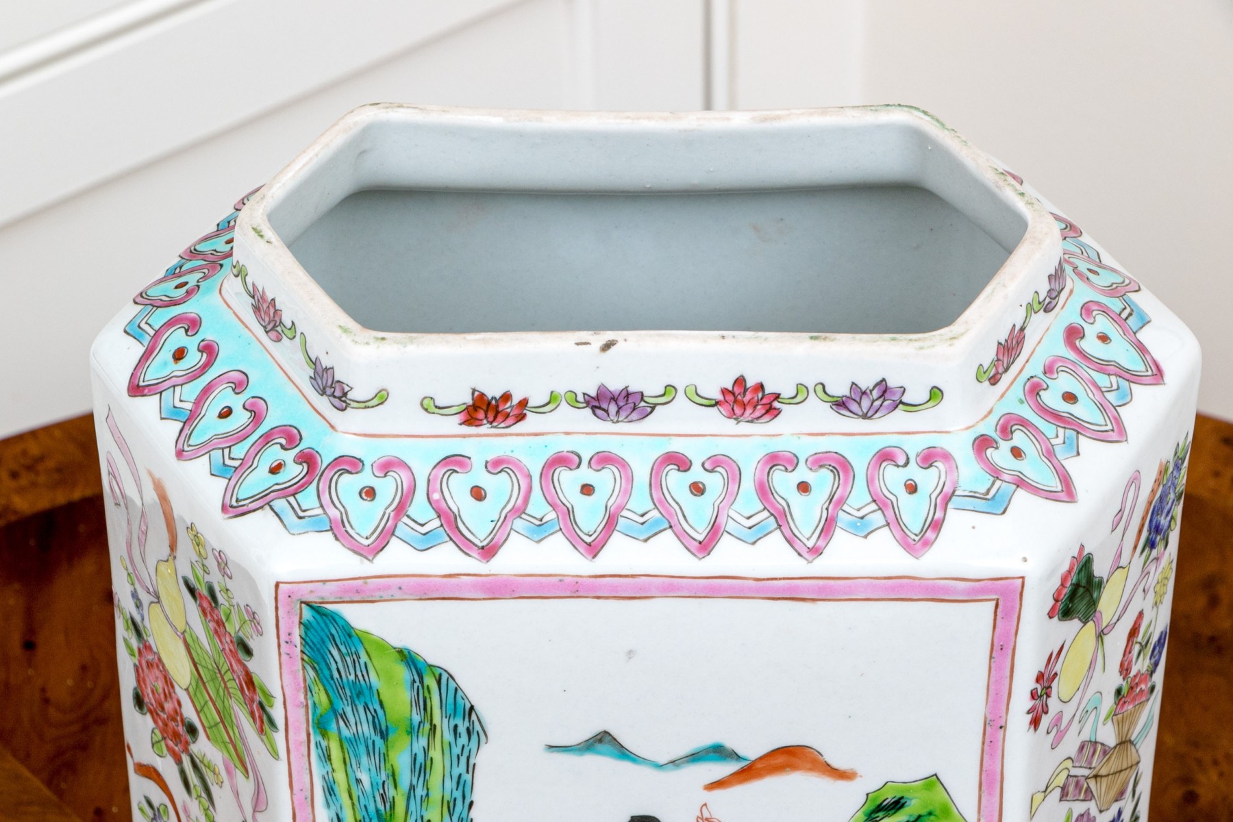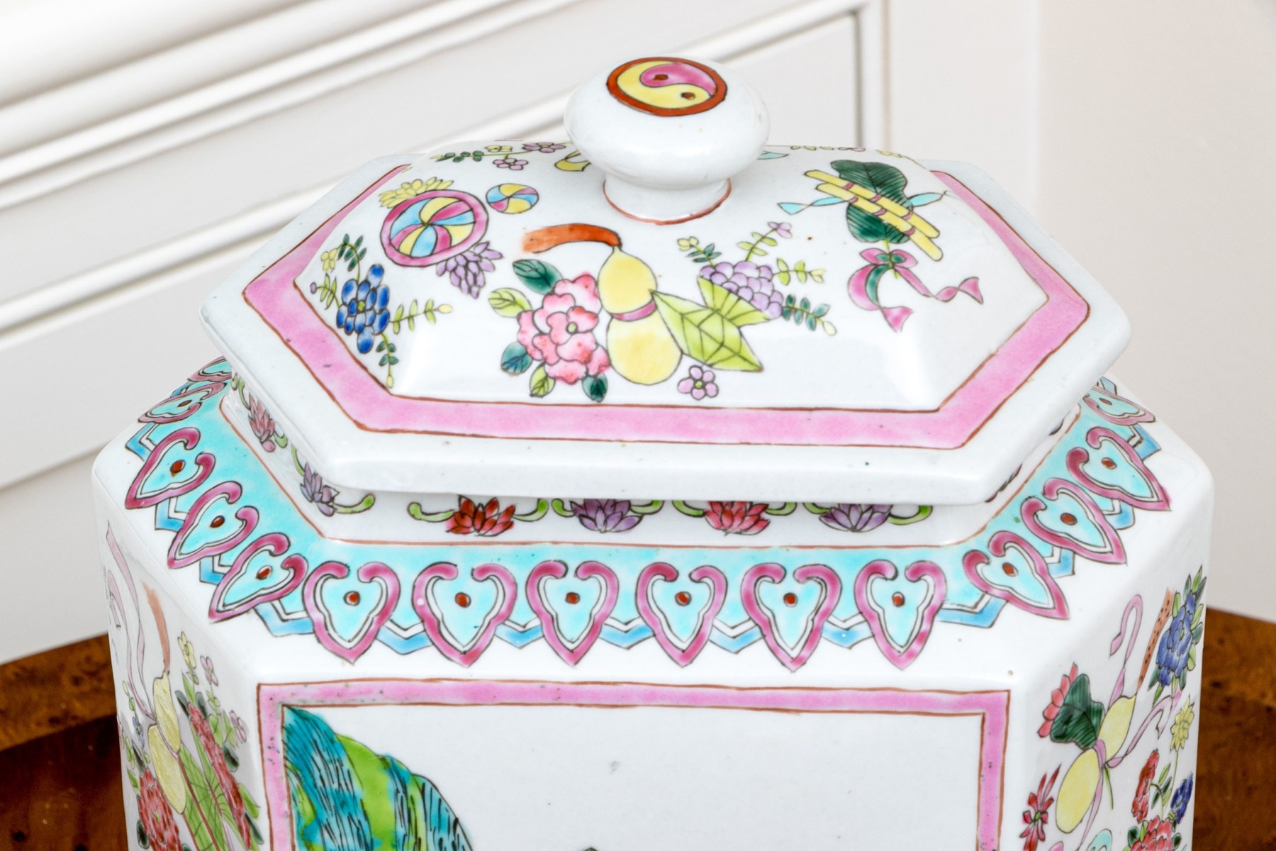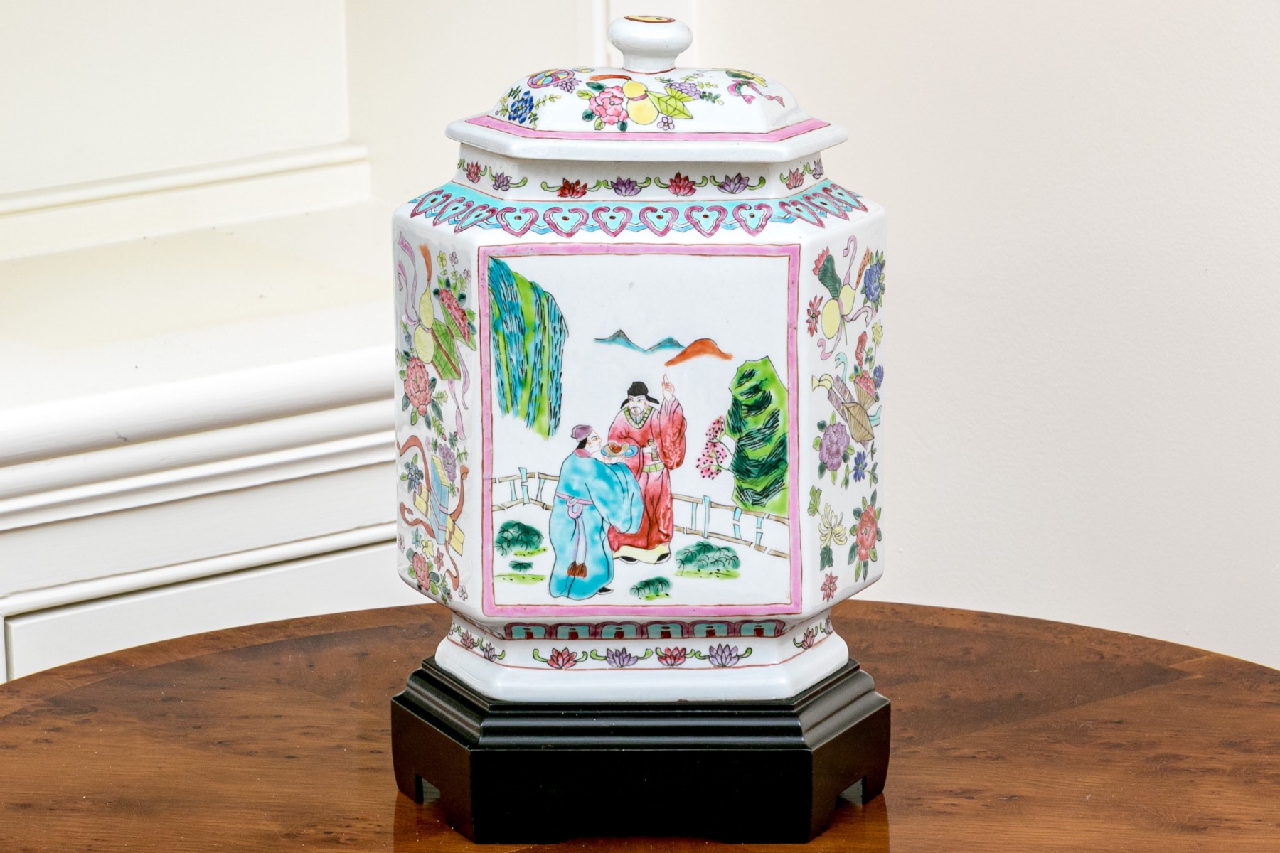 A beautiful Chinese famille rose porcelain tea caddy in hexagonal form. The lid is detailed with a yin yang motif on the handle. The body is enameled with scenes of figures in a natural courtyard, surrounded by borders of vibrantly rendered traditional objects and flowers. Includes a black wood base.
