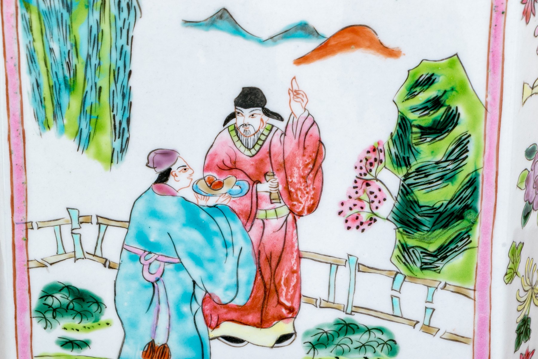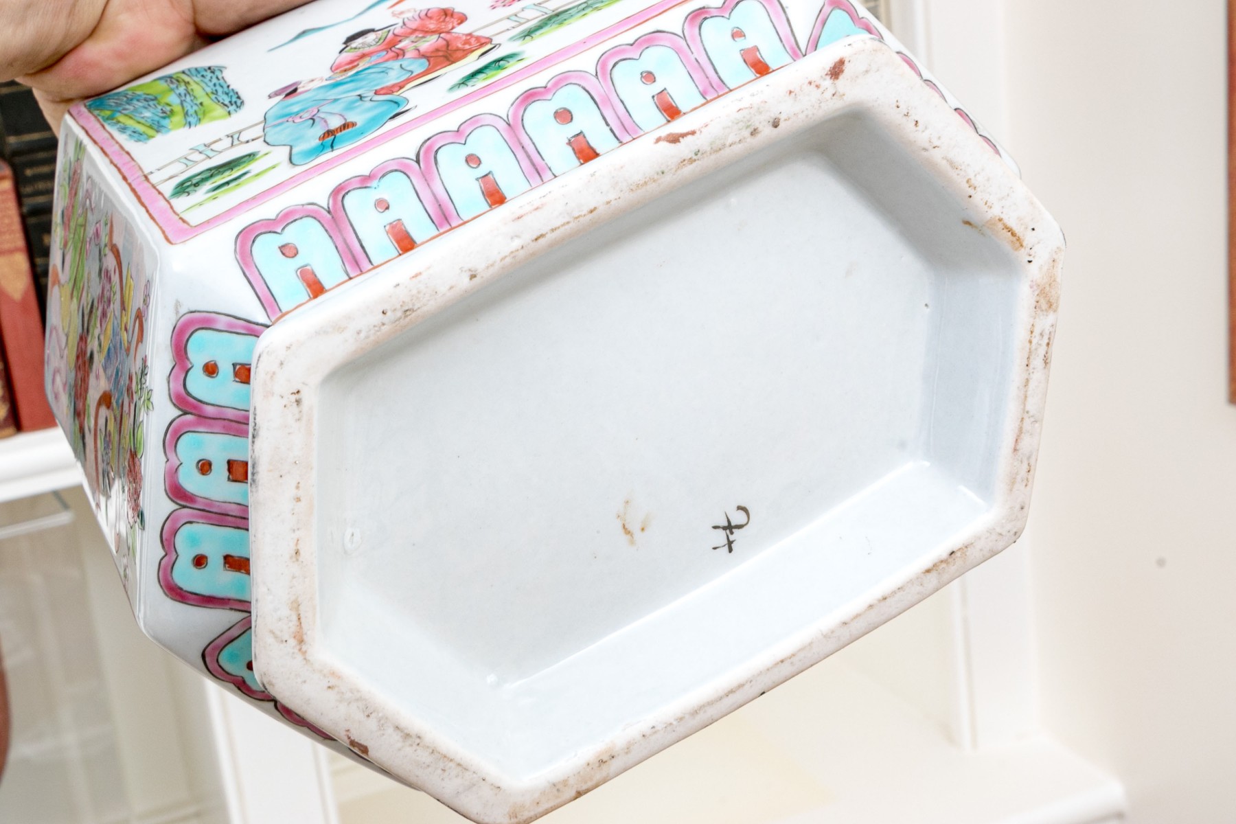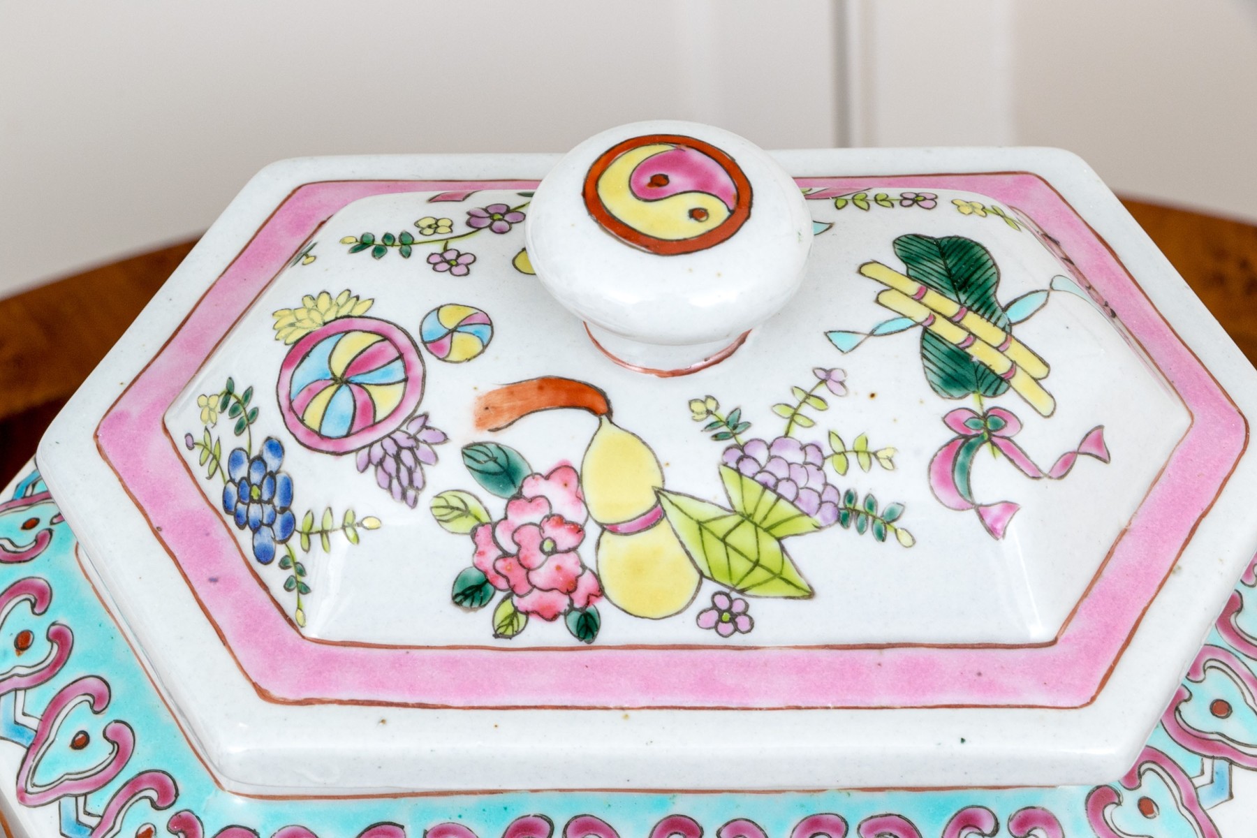 A beautiful Chinese famille rose porcelain tea caddy in hexagonal form. The lid is detailed with a yin yang motif on the handle. The body is enameled with scenes of figures in a natural courtyard, surrounded by borders of vibrantly rendered traditional objects and flowers. Includes a black wood base.