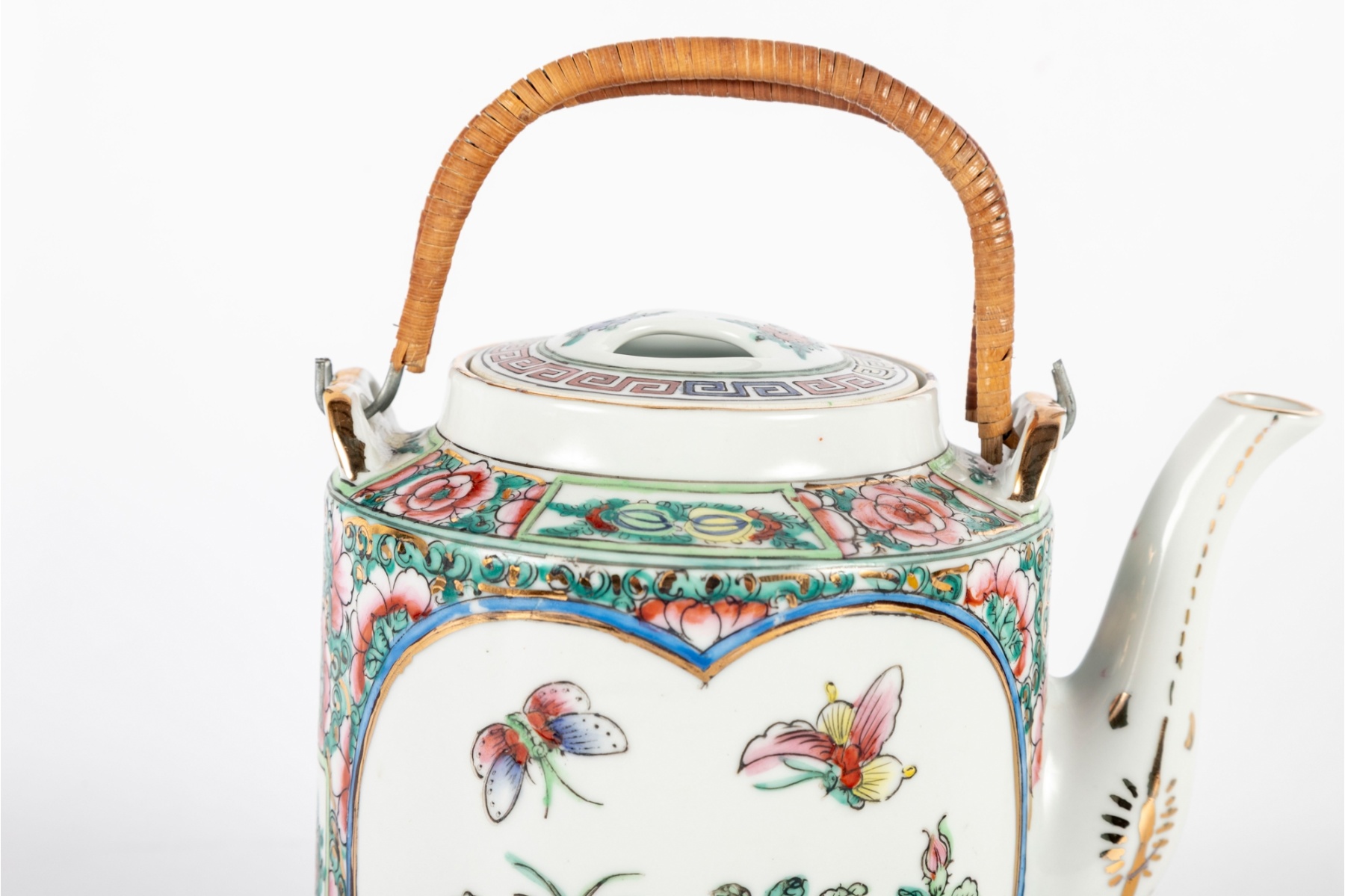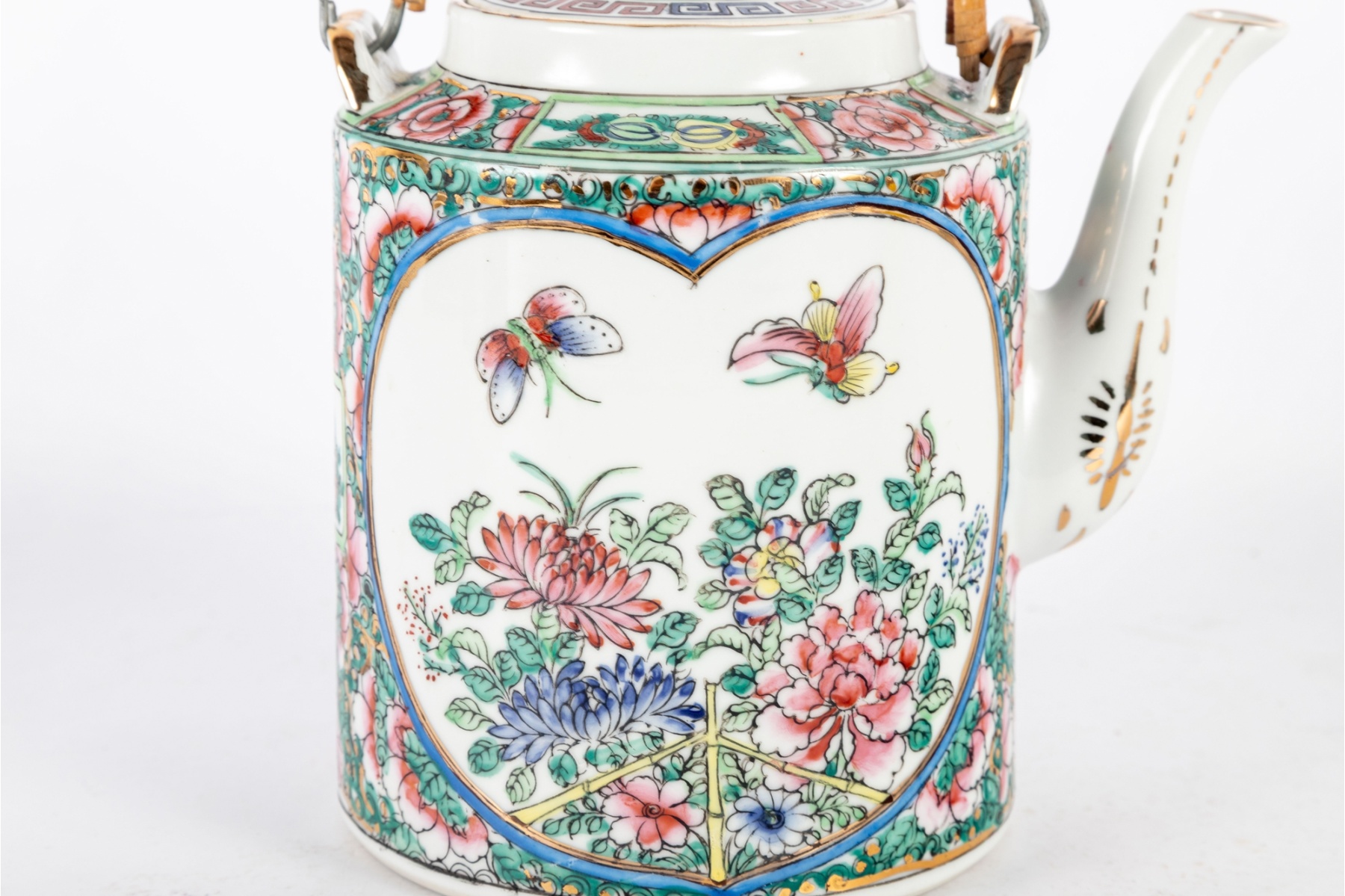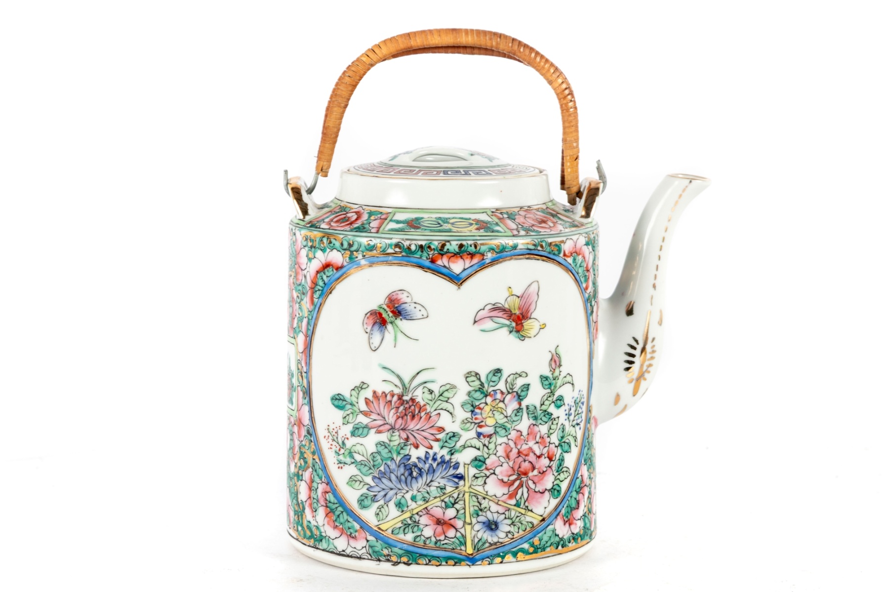 Charming hand-painted porcelain teapot with a cylindrical body, curved spout, and fitted lid, featuring a bamboo-wrapped handle. The surface is richly decorated in the Famille Rose palette with colorful butterflies and blooming chrysanthemums and peonies framed within heart-shaped cartouches, all bordered by scrolling floral and geometric motifs. The lid is adorned with floral medallions and a red, blue, and yellow key-fret border. Marked underside: YT Decorated in Hong Kong.
