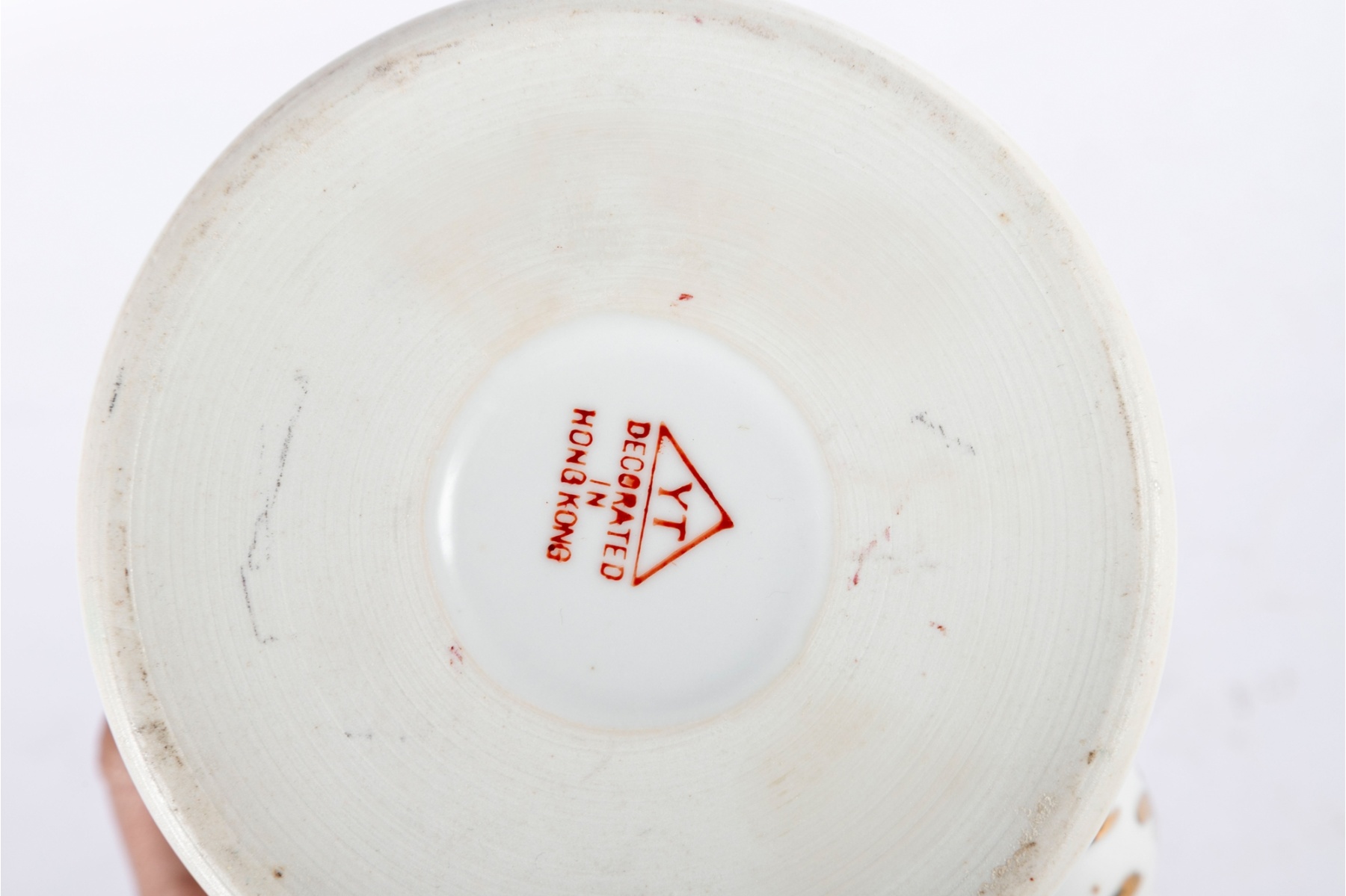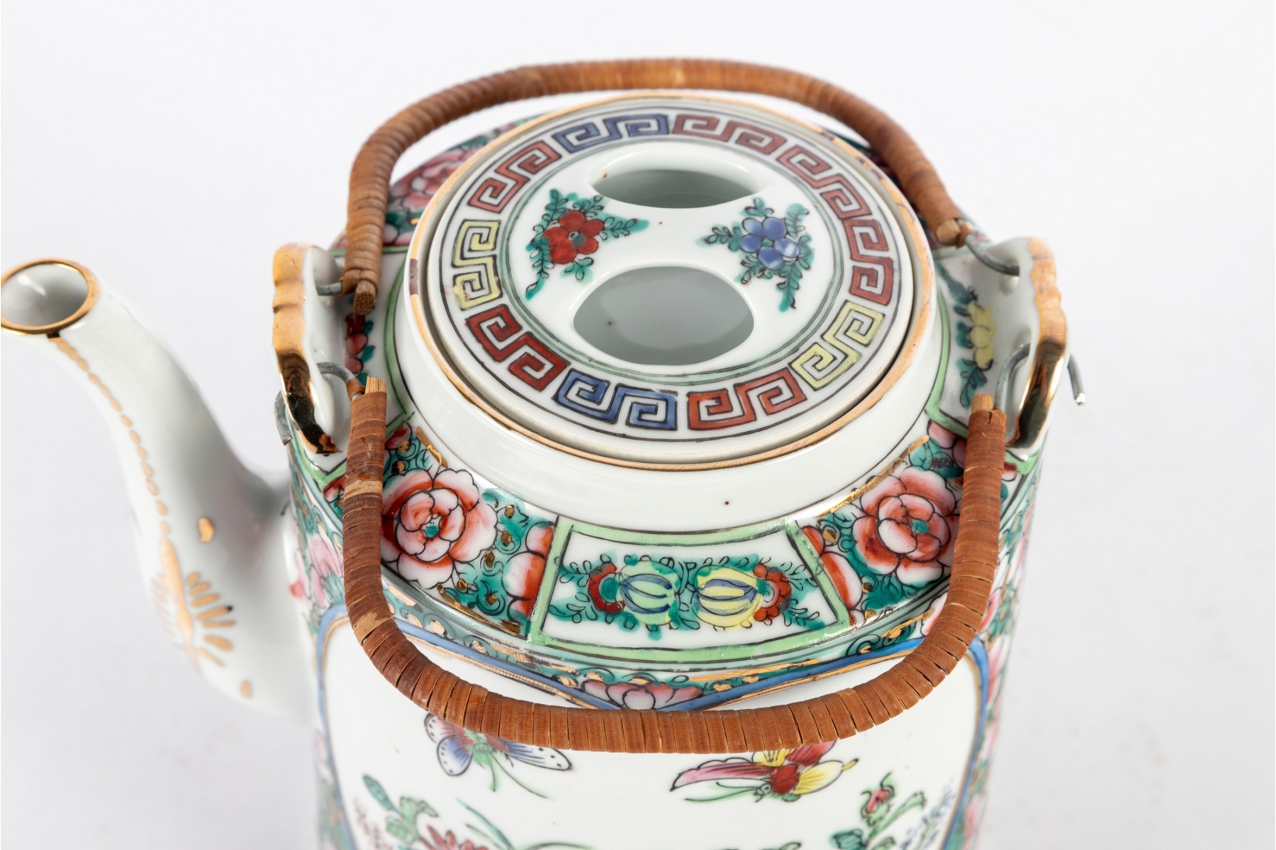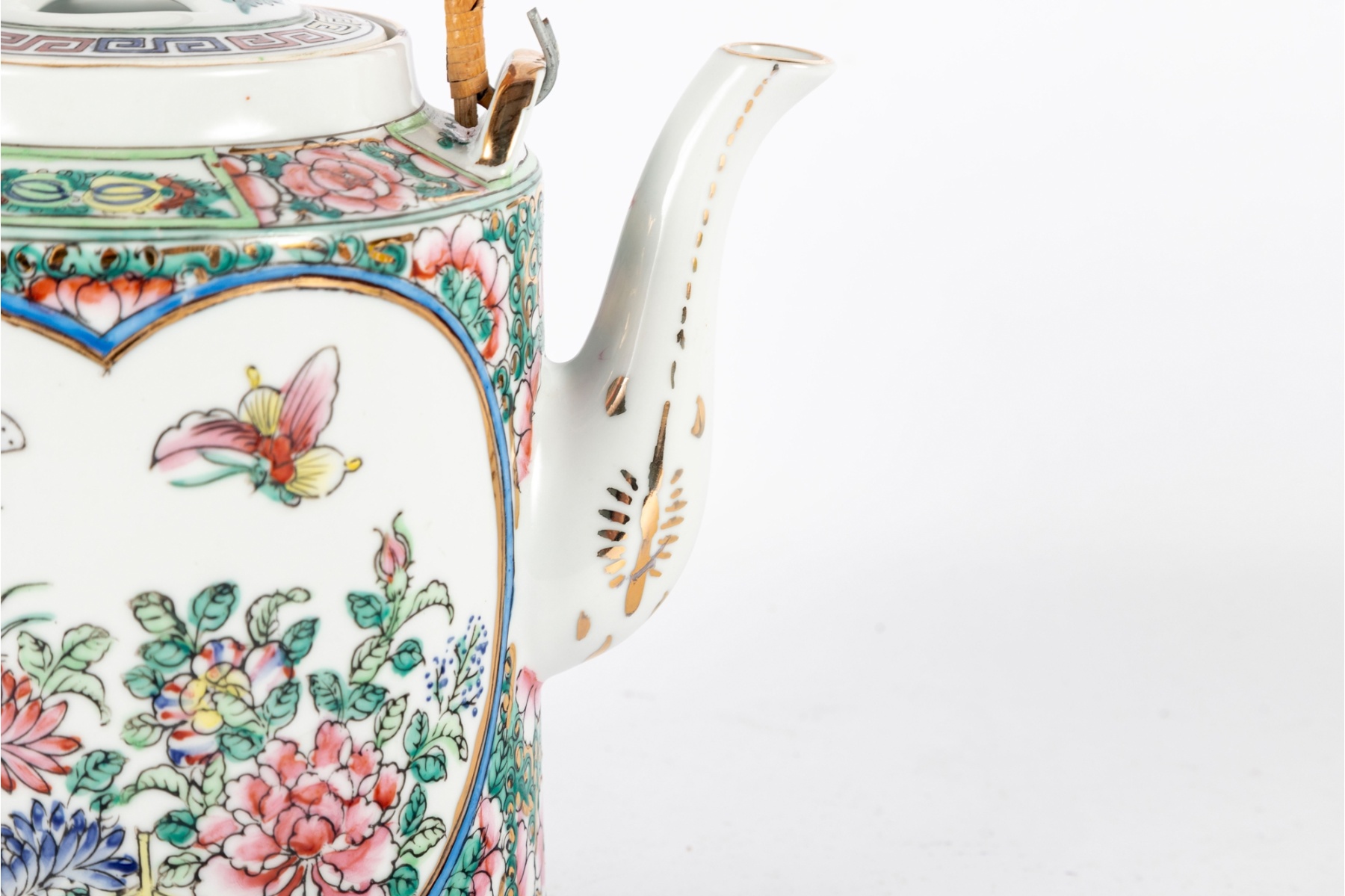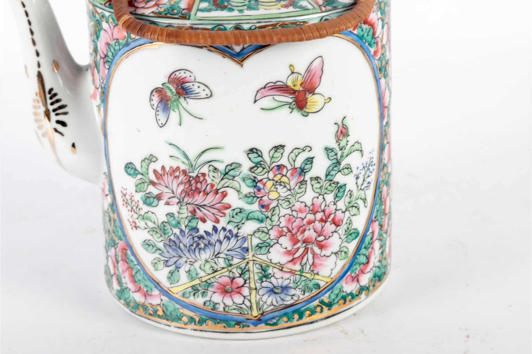 Charming hand-painted porcelain teapot with a cylindrical body, curved spout, and fitted lid, featuring a bamboo-wrapped handle. The surface is richly decorated in the Famille Rose palette with colorful butterflies and blooming chrysanthemums and peonies framed within heart-shaped cartouches, all bordered by scrolling floral and geometric motifs. The lid is adorned with floral medallions and a red, blue, and yellow key-fret border. Marked underside: YT Decorated in Hong Kong.