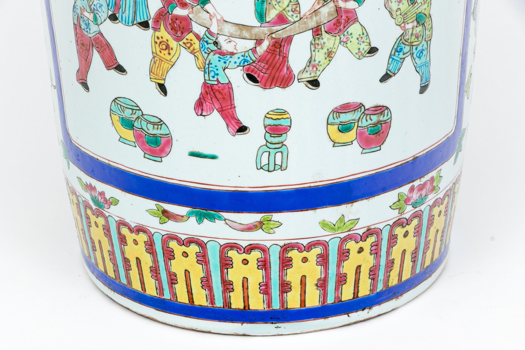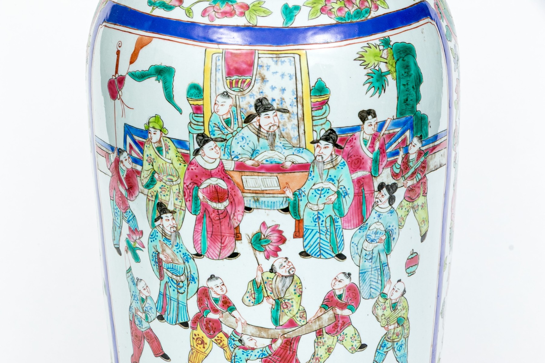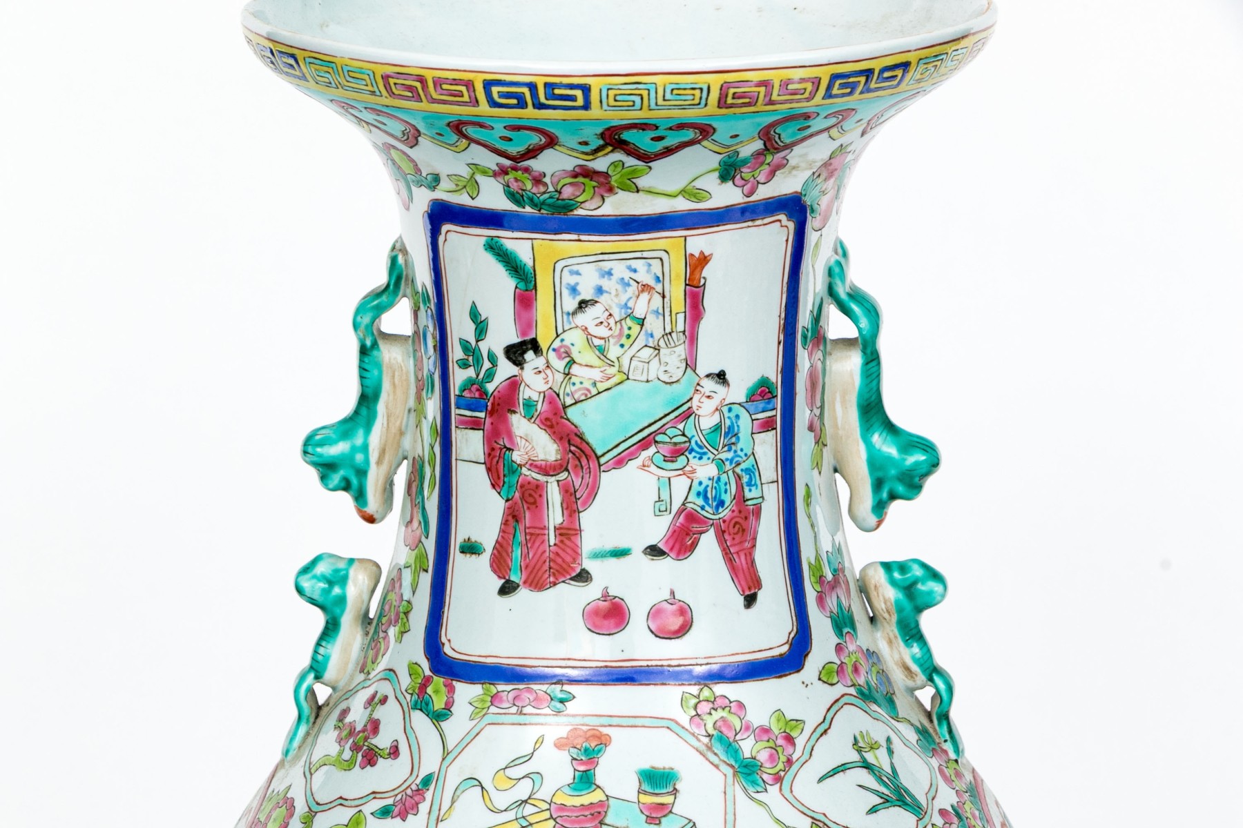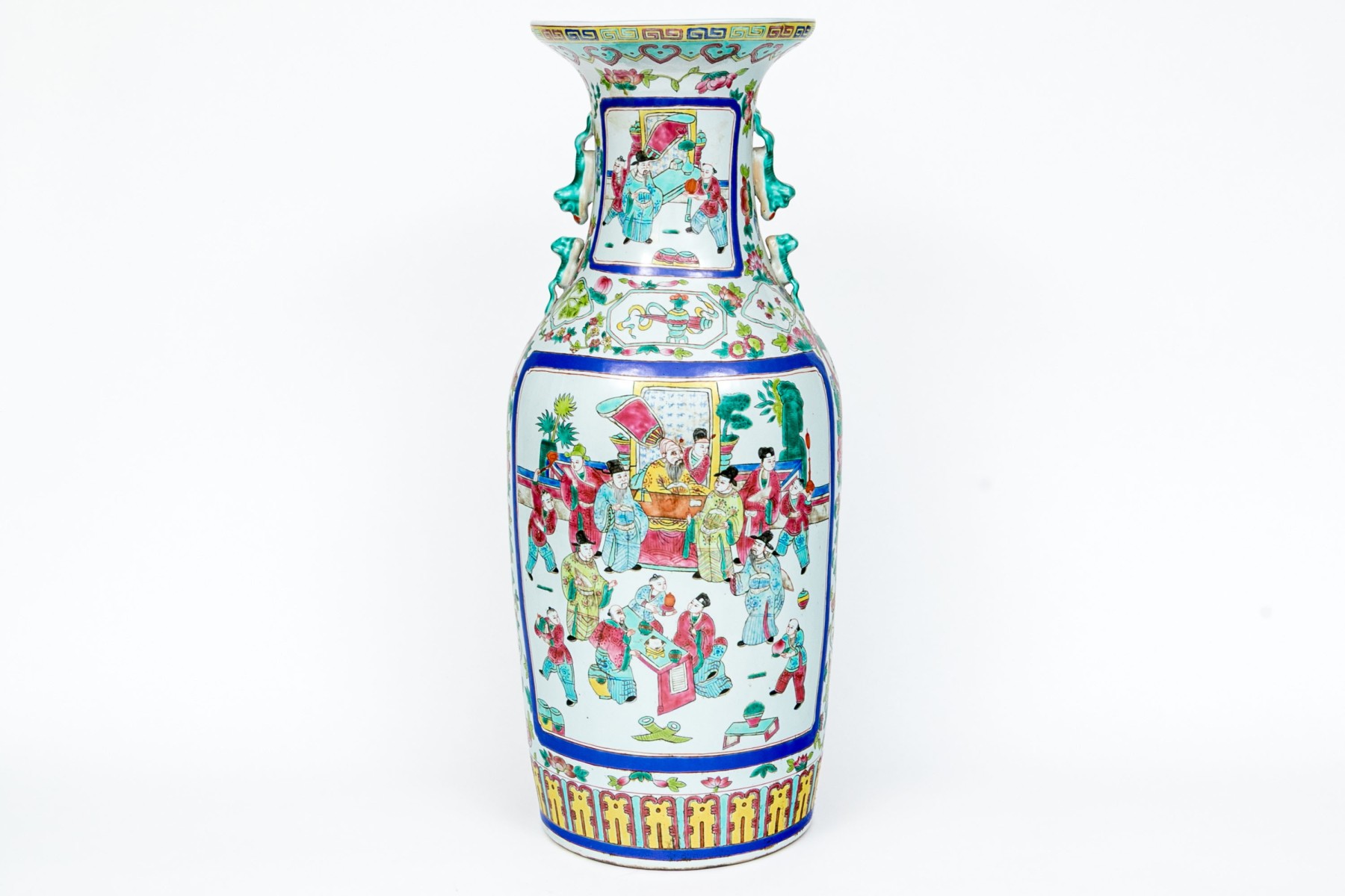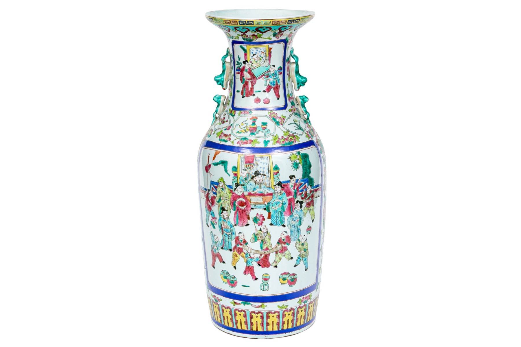A gorgeous 20th century Chinese porcelain vase designed with a lappet motif to the foot, a figural courtyard scene, twin handles in the form of mythical beasts, and trumpet mouth. Marked underfoot.