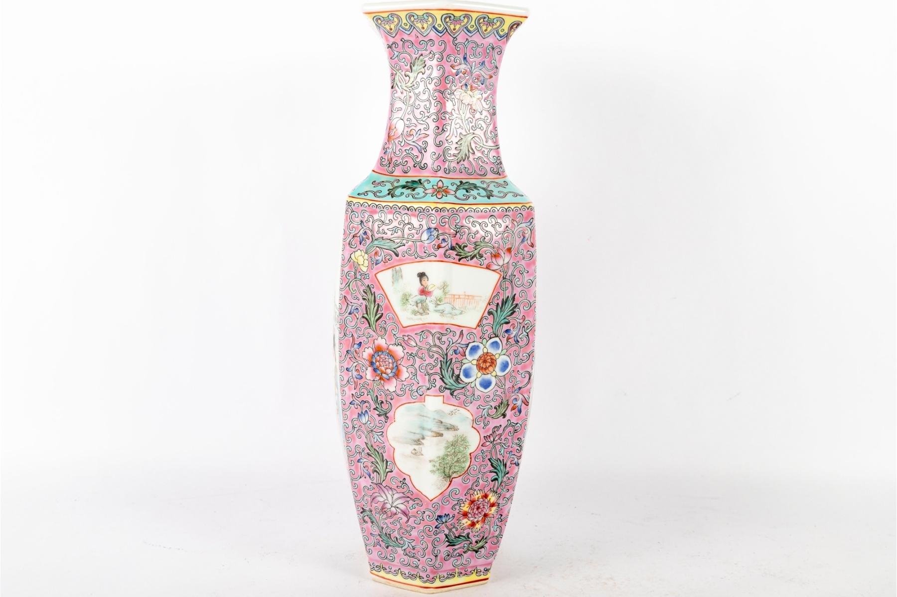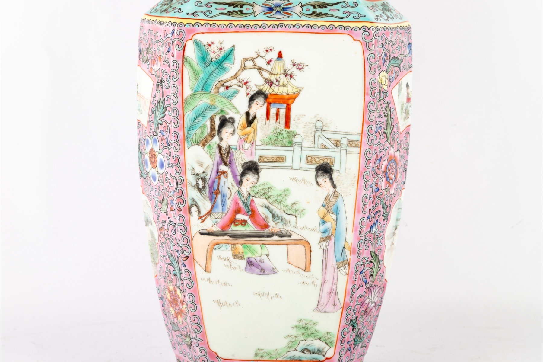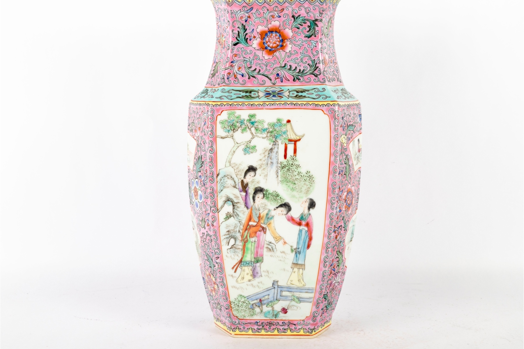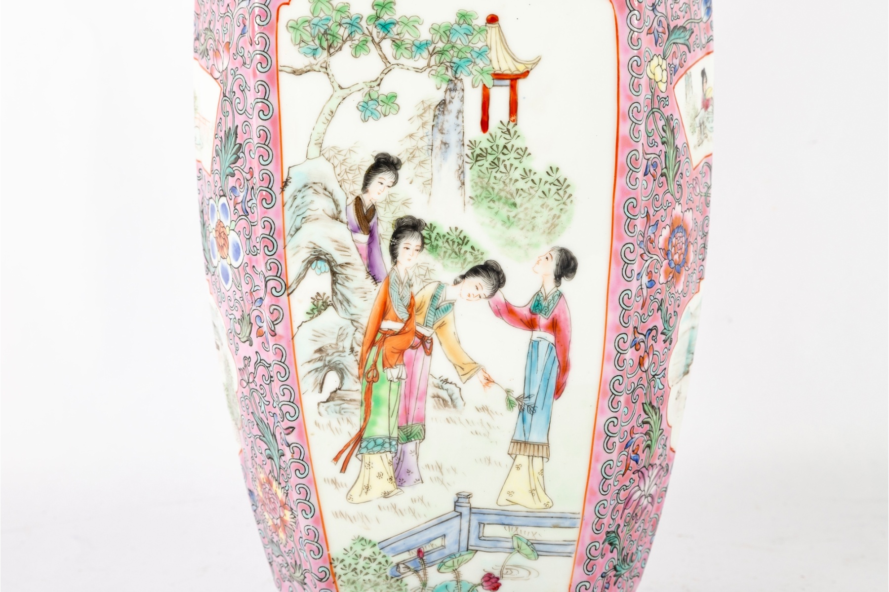Large Chinese Famille Rose porcelain vase featuring a richly hand-painted design with courtly figures in an outdoor garden pavilion scene. The surrounding pink enamel ground is intricately decorated with scrolling lotus, florals, and auspicious motifs accented in turquoise, yellow, blue, and green. Additional panels depict landscape and child scenes framed by ornate floral cartouches.