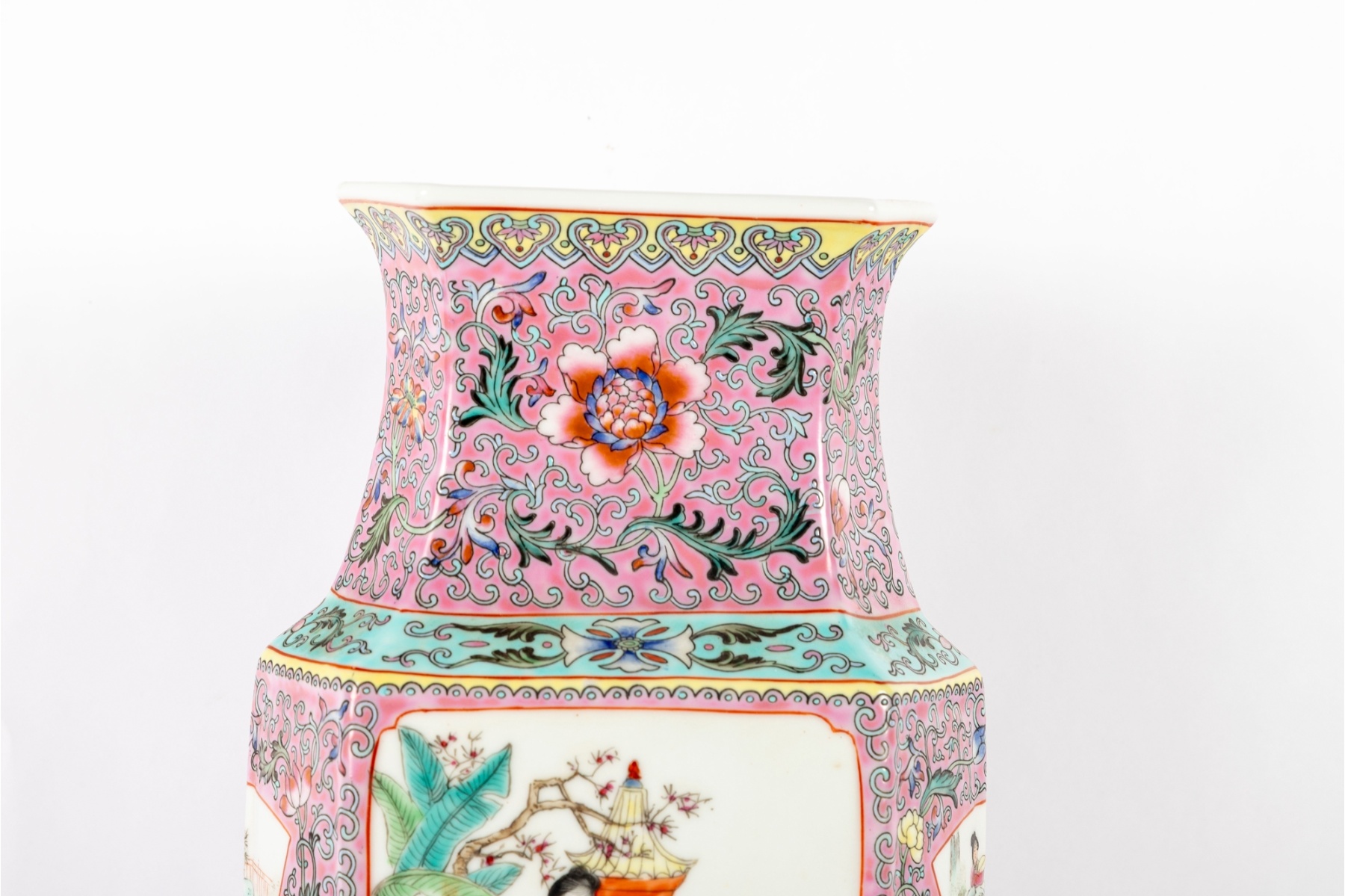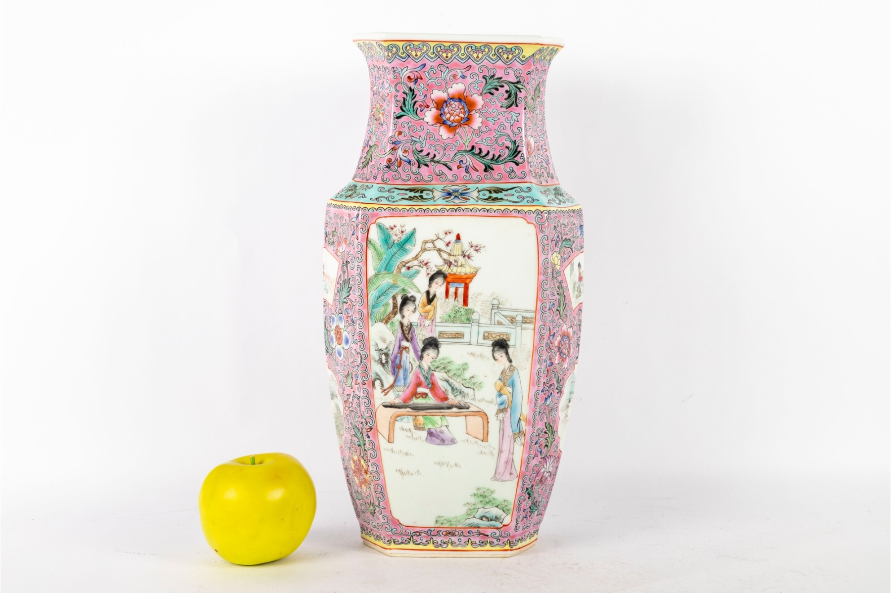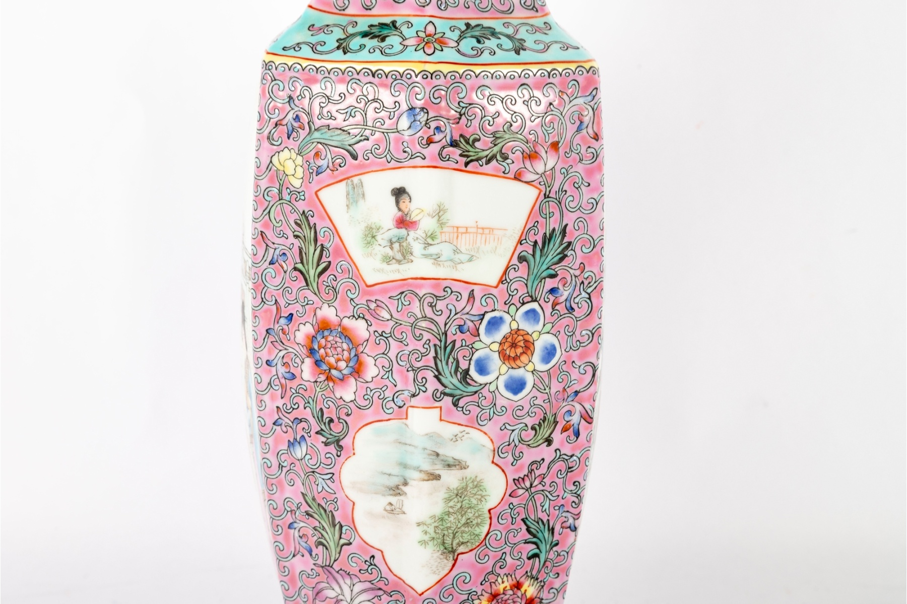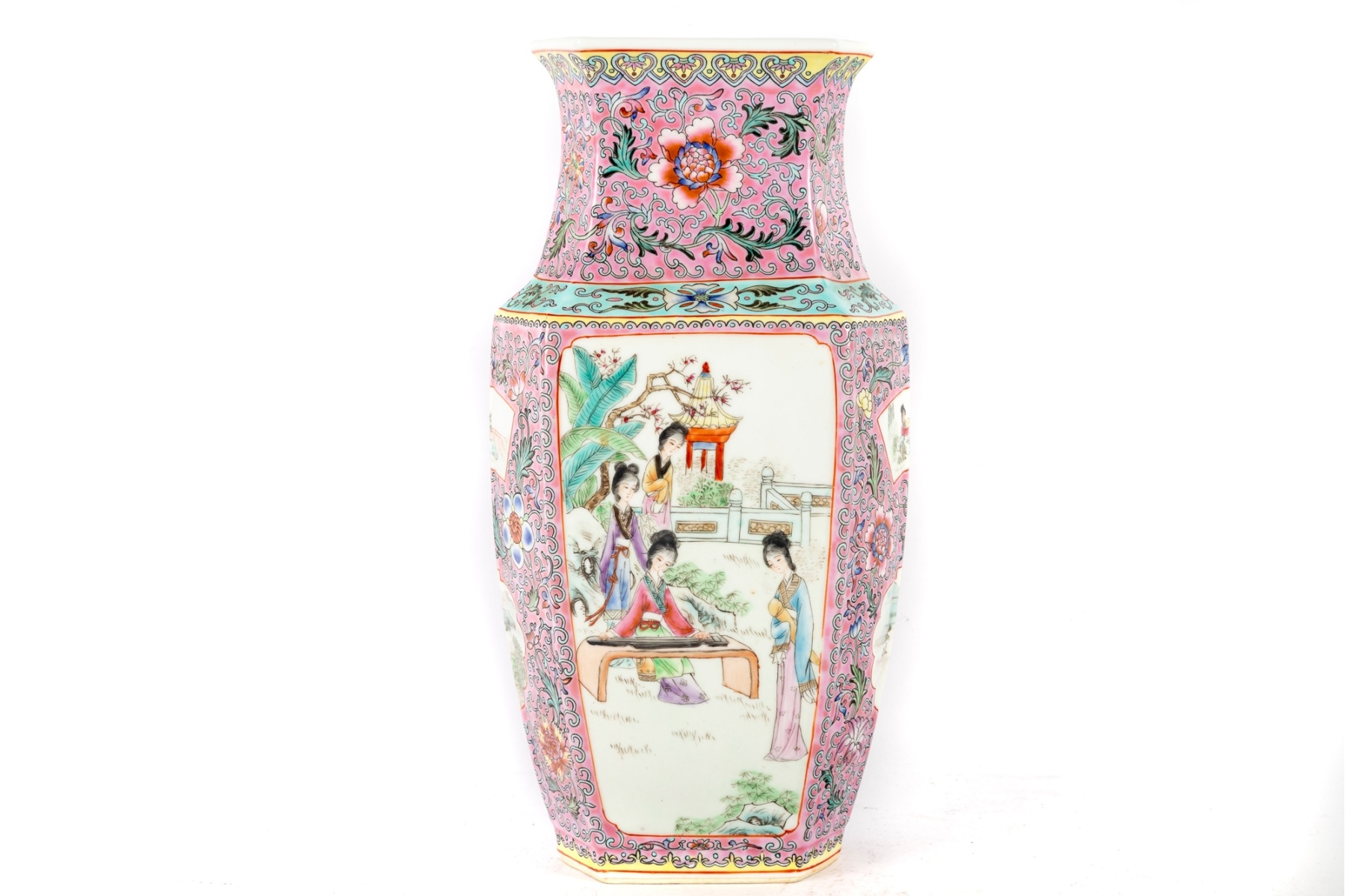 Large Chinese Famille Rose porcelain vase featuring a richly hand-painted design with courtly figures in an outdoor garden pavilion scene. The surrounding pink enamel ground is intricately decorated with scrolling lotus, florals, and auspicious motifs accented in turquoise, yellow, blue, and green. Additional panels depict landscape and child scenes framed by ornate floral cartouches.