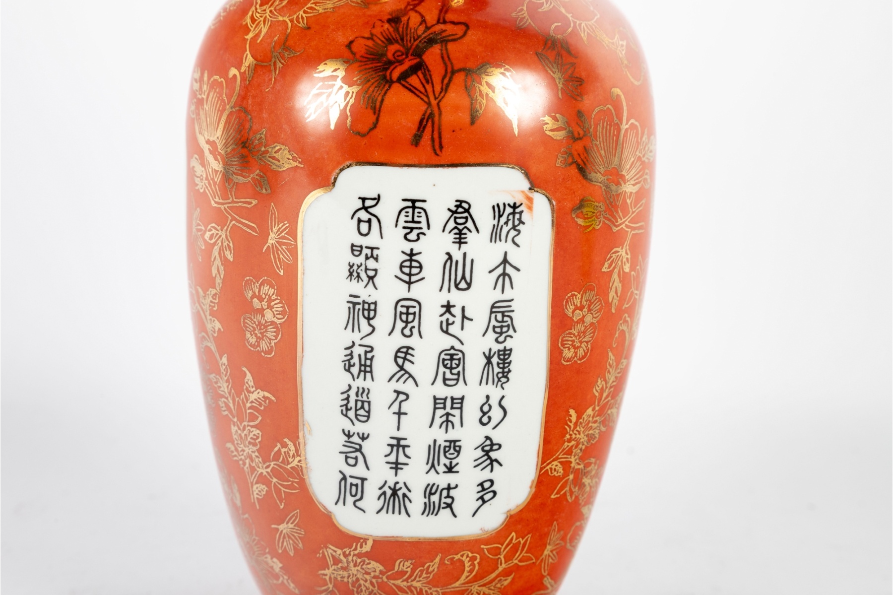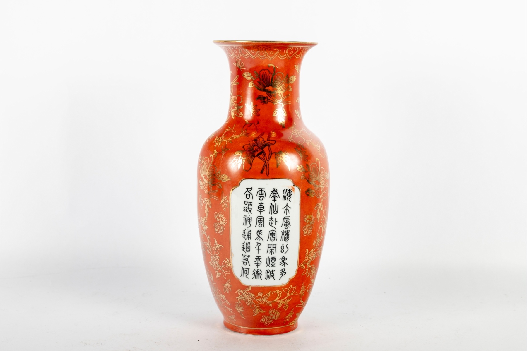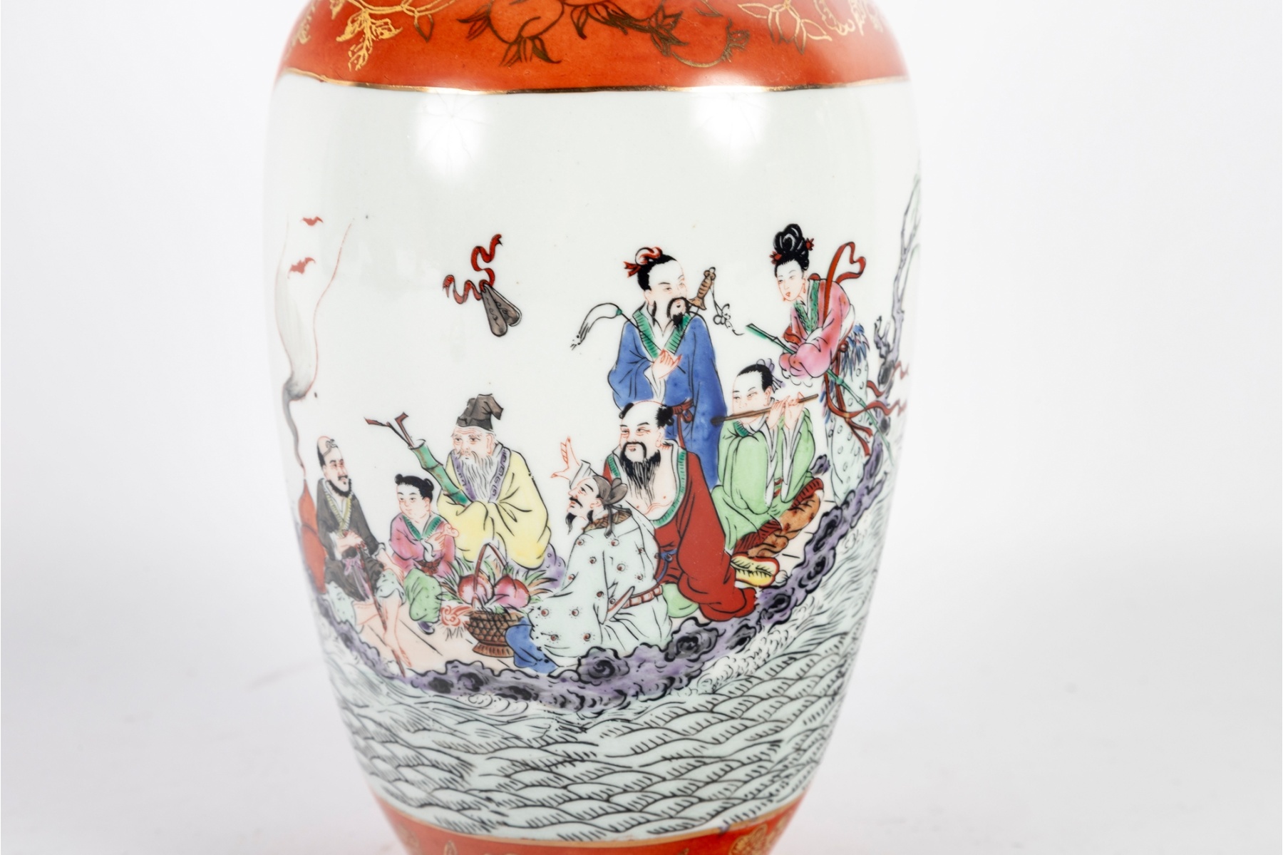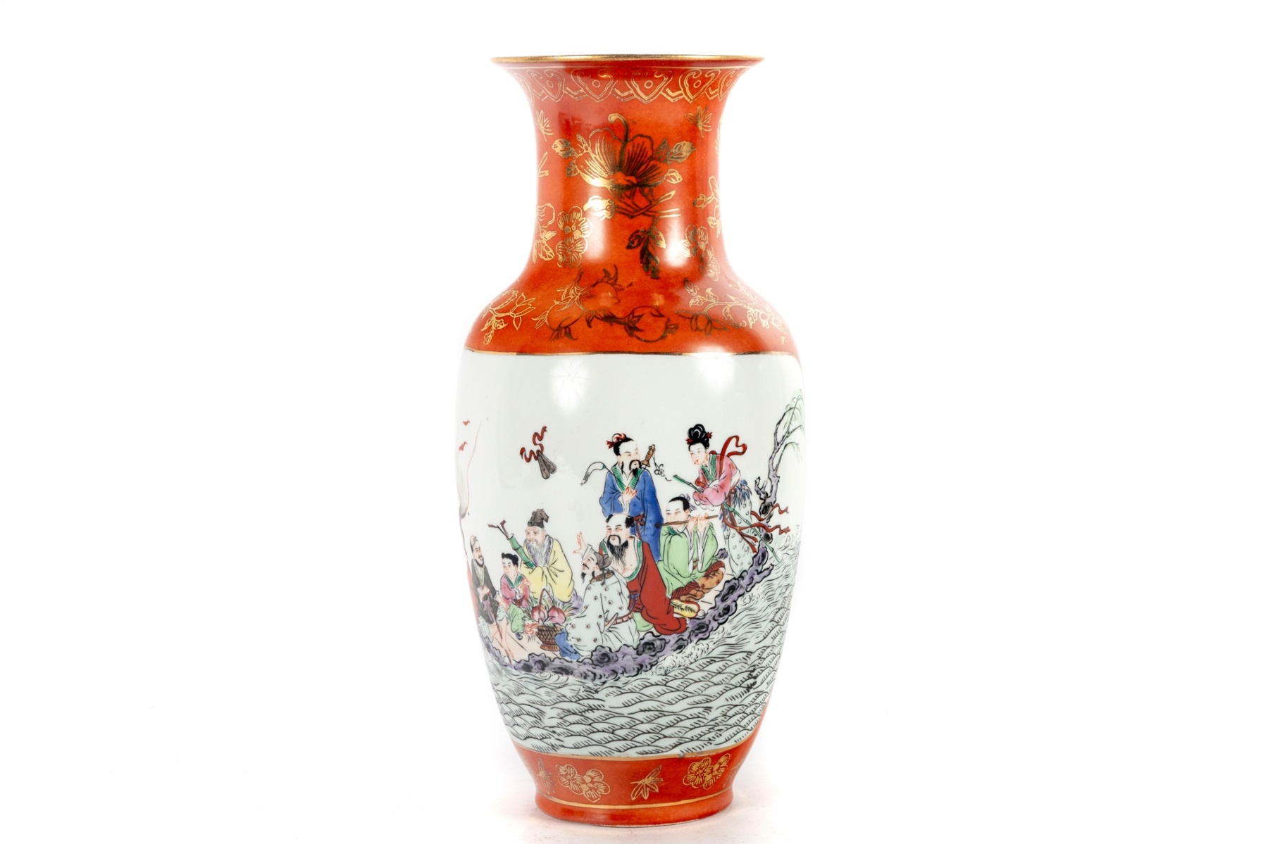 Elegant hand-painted porcelain vase featuring a vivid depiction of the Eight Immortals crossing the sea, rendered in fine famille rose enamels with delicate detail and expressive faces. The upper and lower borders are finished in a rich iron-red ground decorated with gilt floral and scroll motifs, and the reverse bears an inscription panel with calligraphy. The vase is signed with a red seal mark on the base.
