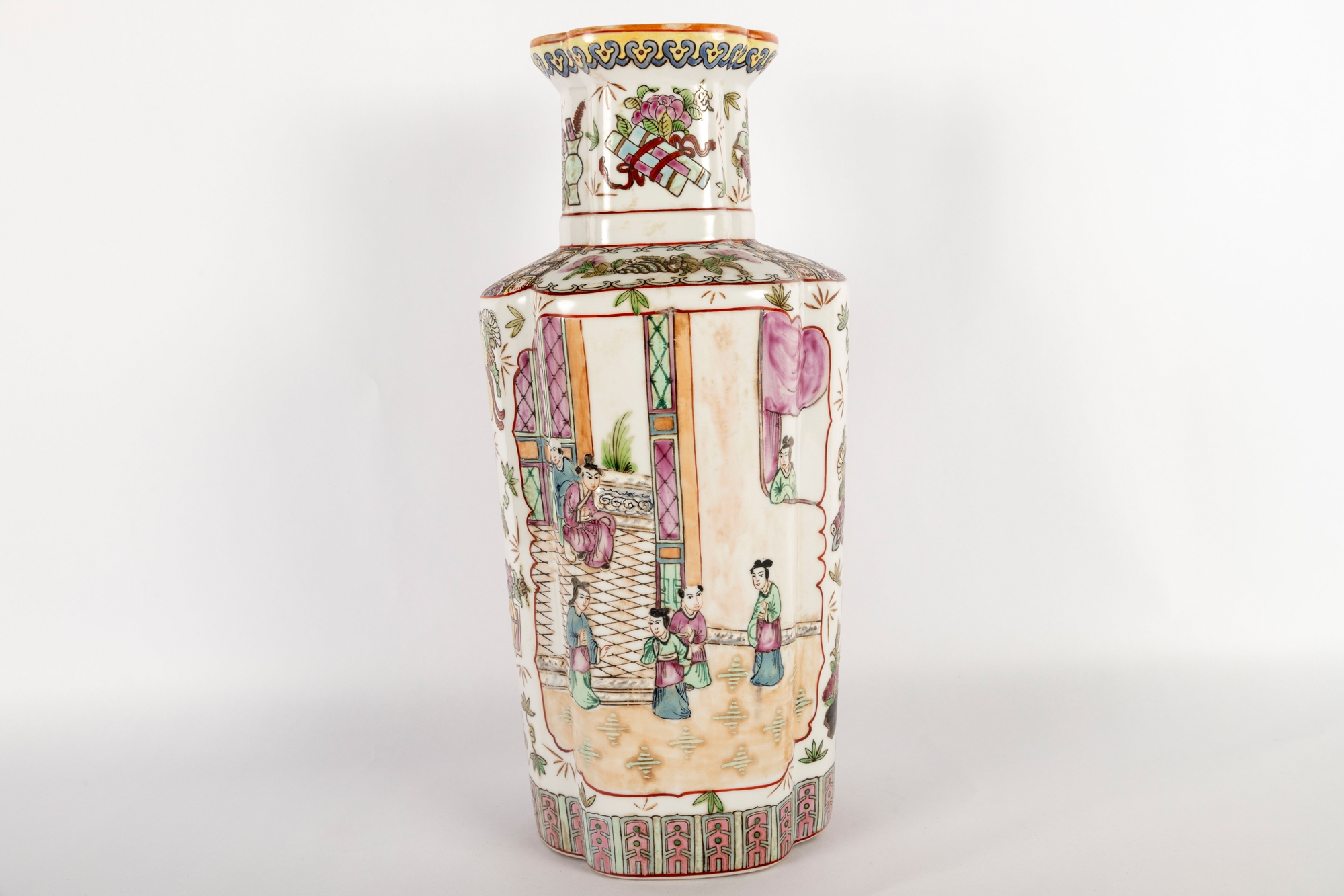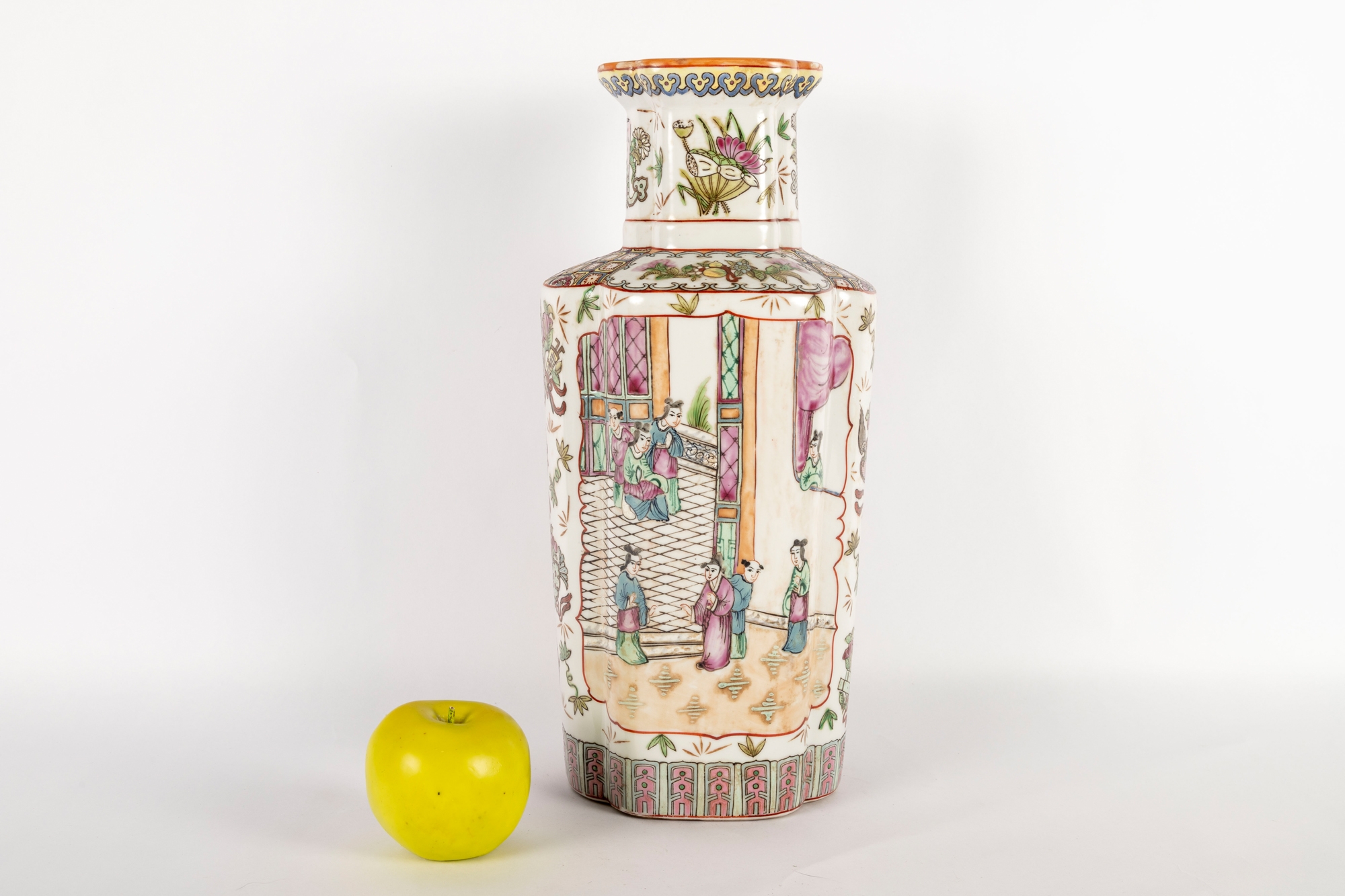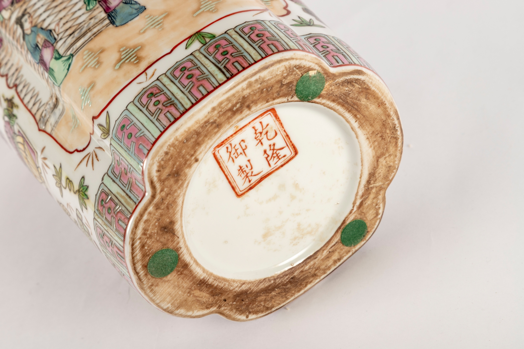 A finely detailed Chinese famille rose porcelain vase, decorated with court figures in an architectural and garden setting surrounded by floral and geometric borders. The palette features rich enamels in pink, green, and yellow tones typical of the famille rose tradition. The underside bears a red six-character Qianlong seal mark enclosed in a square reserve.