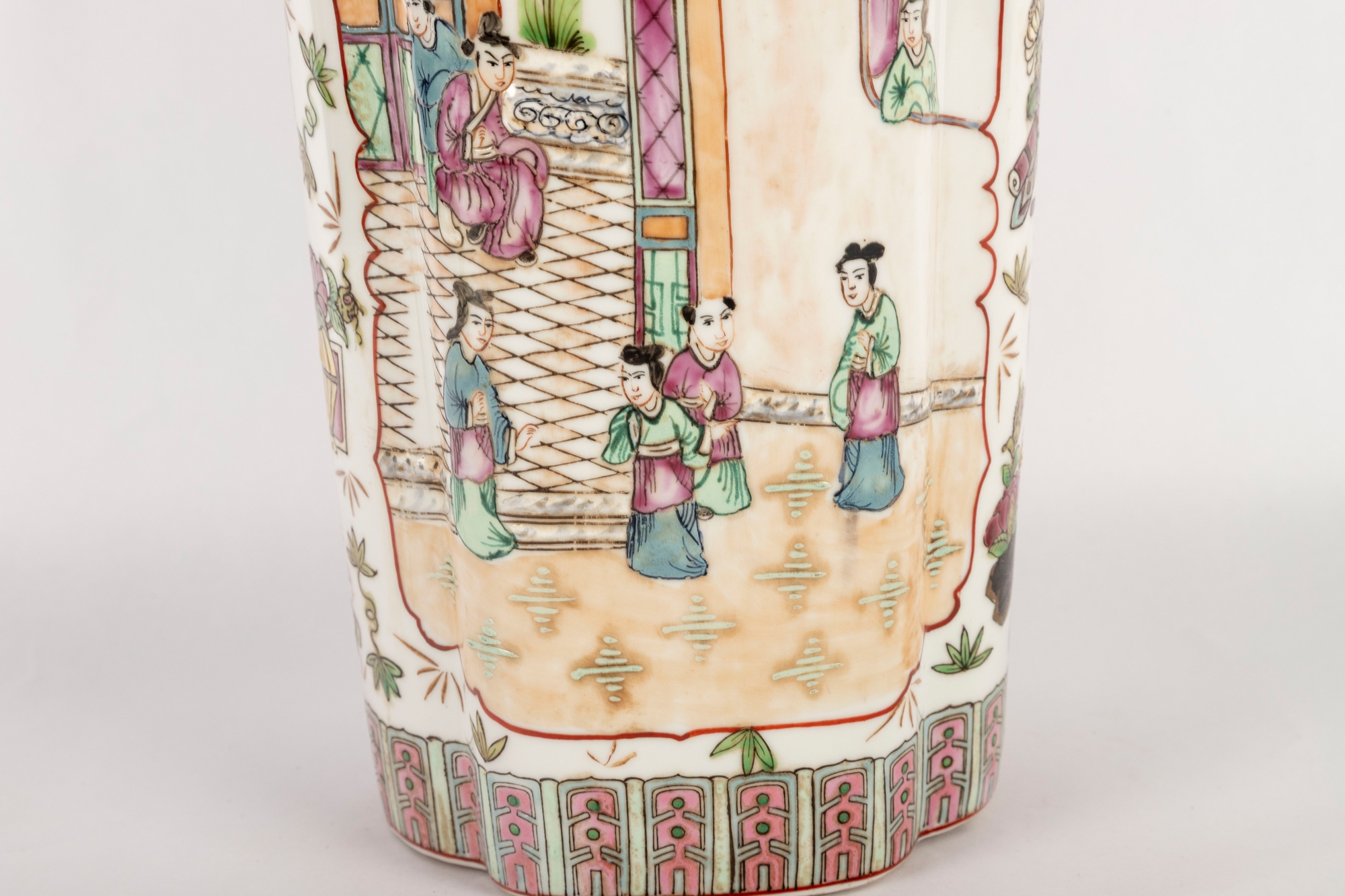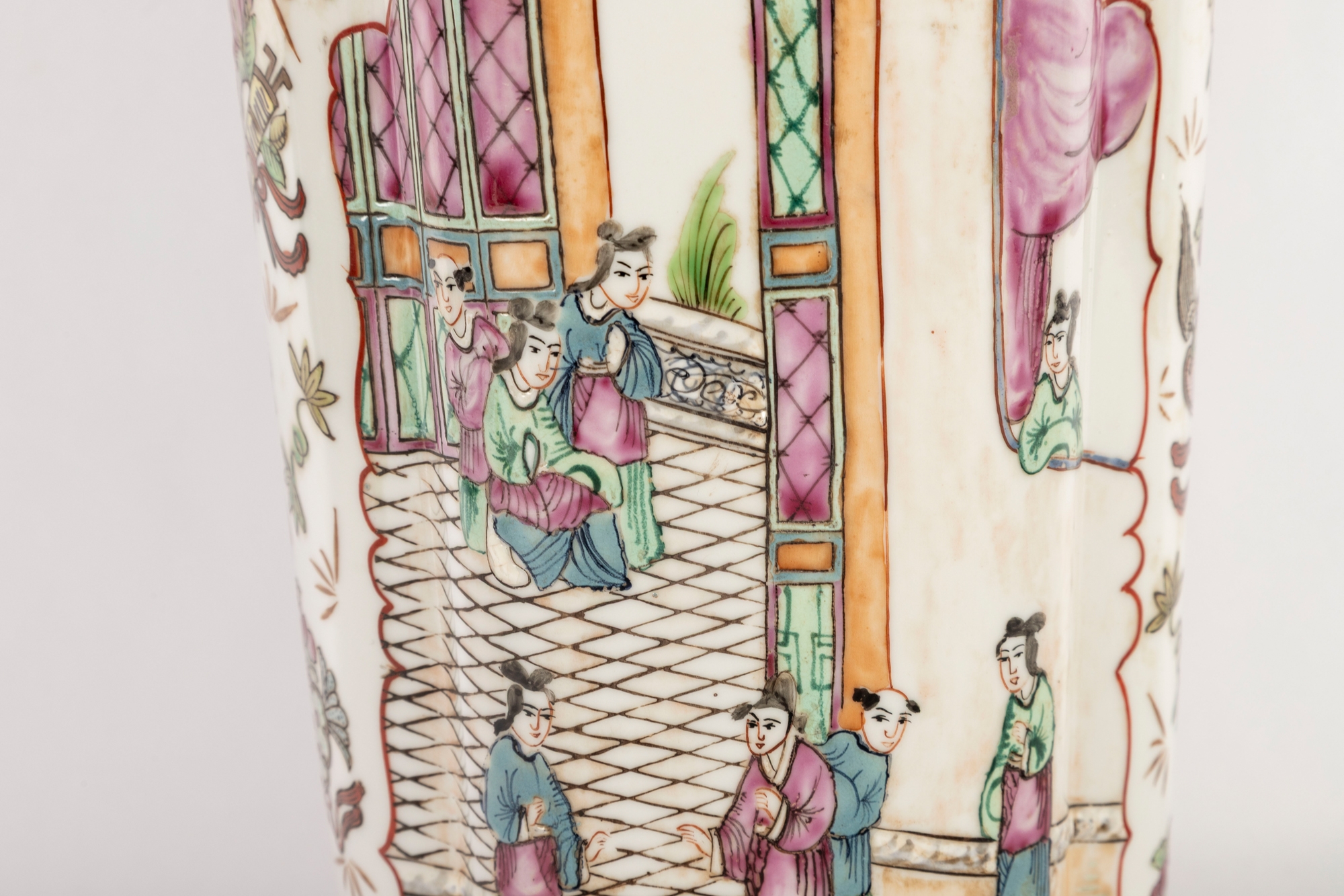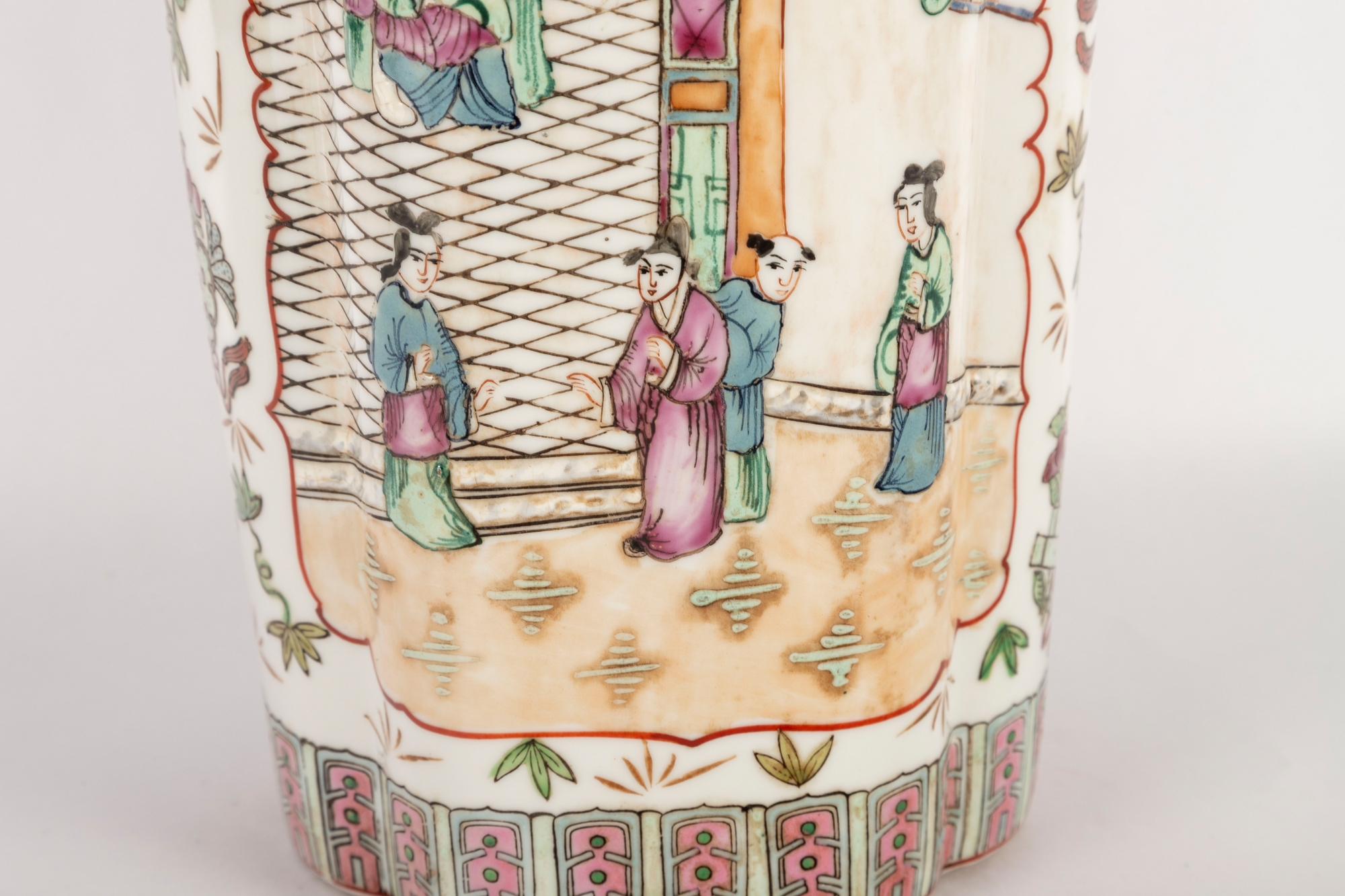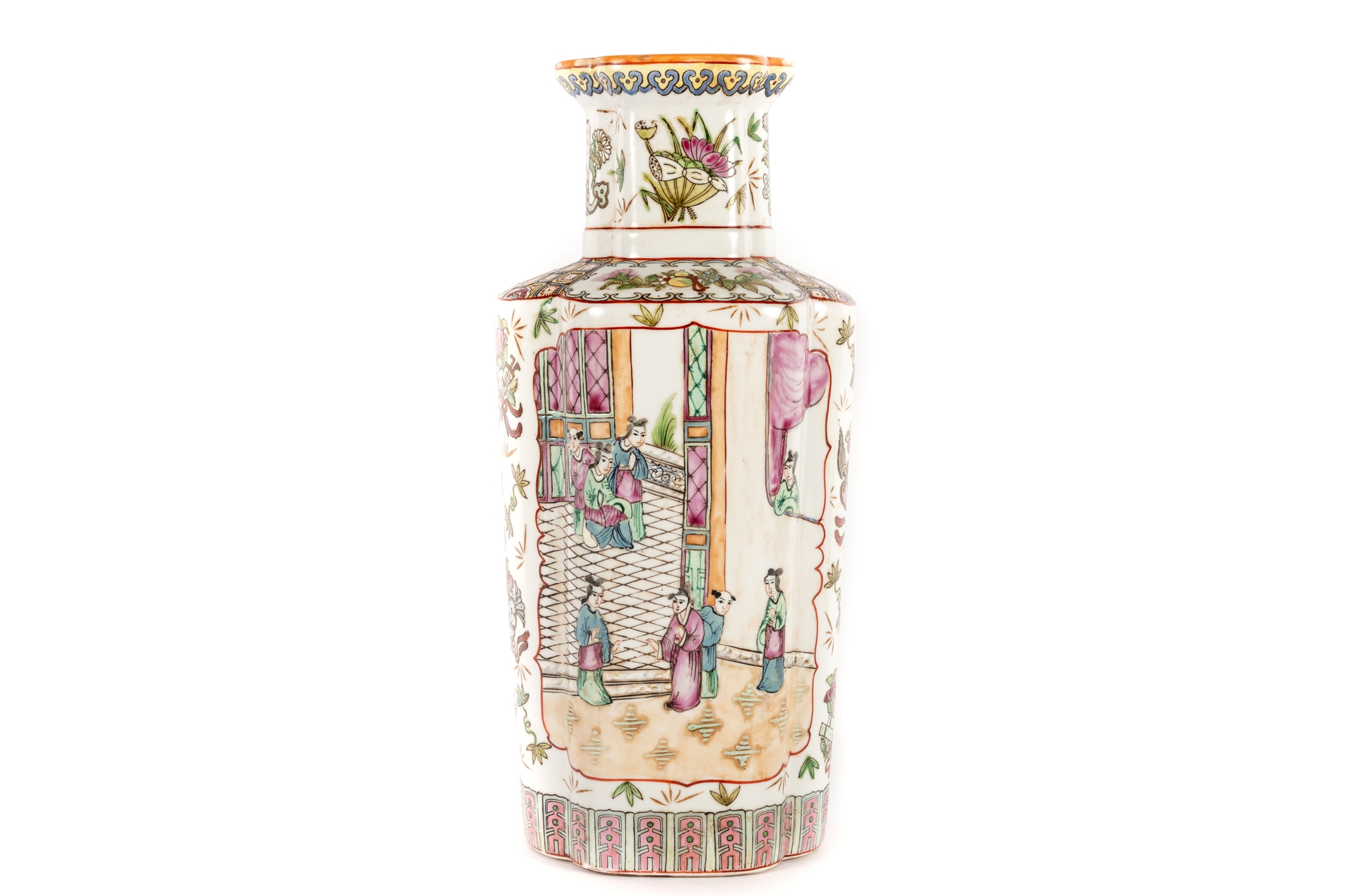 A finely detailed Chinese famille rose porcelain vase, decorated with court figures in an architectural and garden setting surrounded by floral and geometric borders. The palette features rich enamels in pink, green, and yellow tones typical of the famille rose tradition. The underside bears a red six-character Qianlong seal mark enclosed in a square reserve.