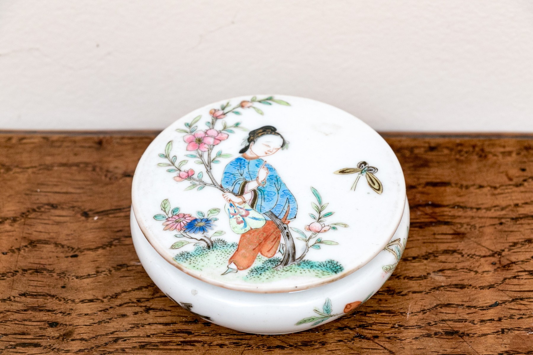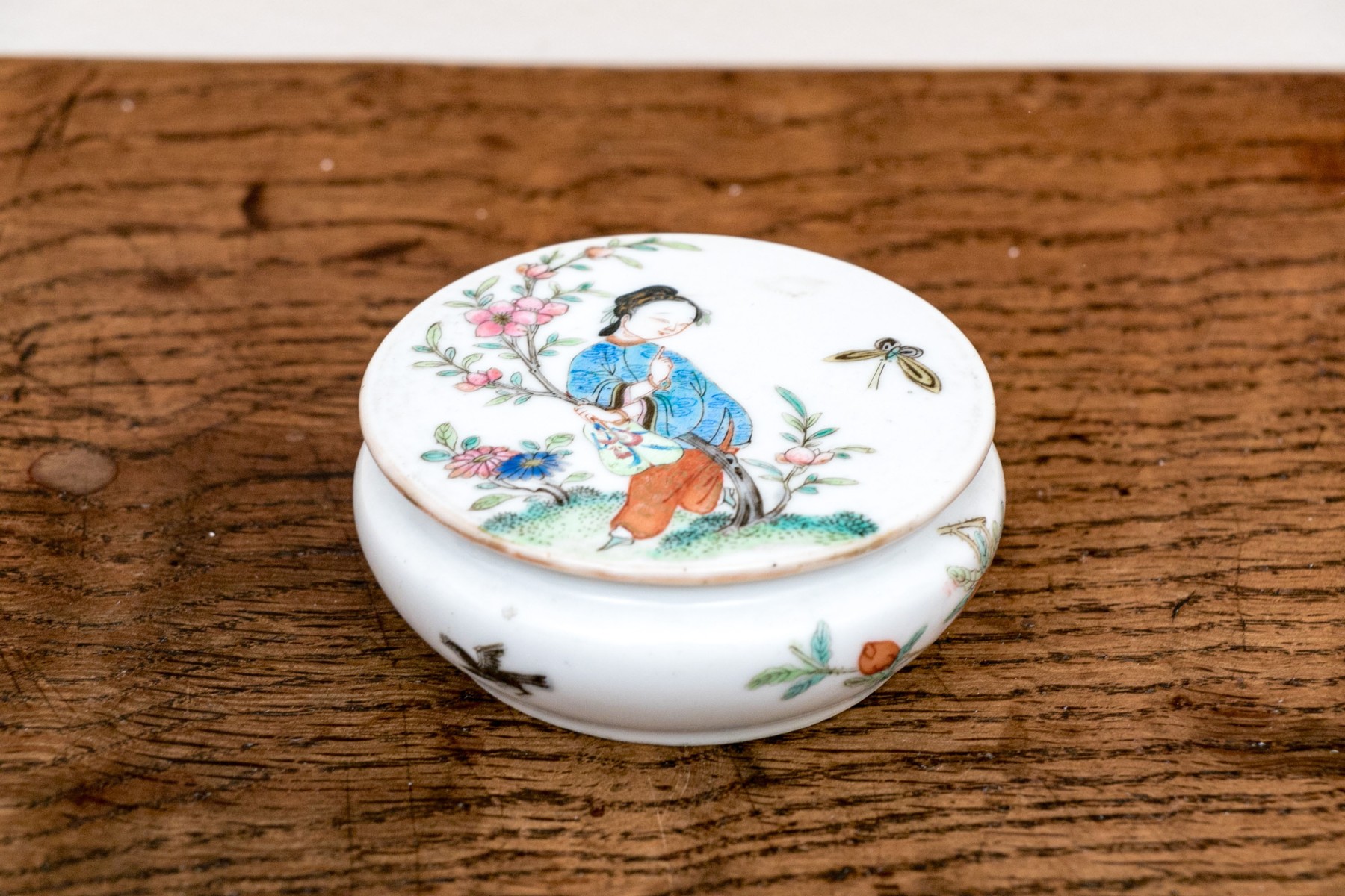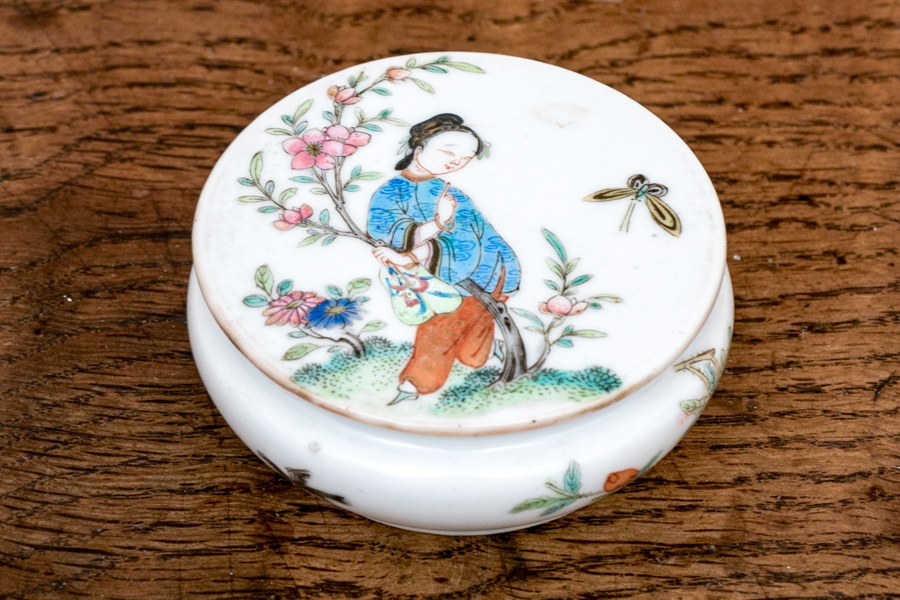 Chinese rose medallion round porcelain trinket box with lid. The box displaying a female figure on lid with flowering branches and butterfly. The exterior of the box with birds and flowering vines.