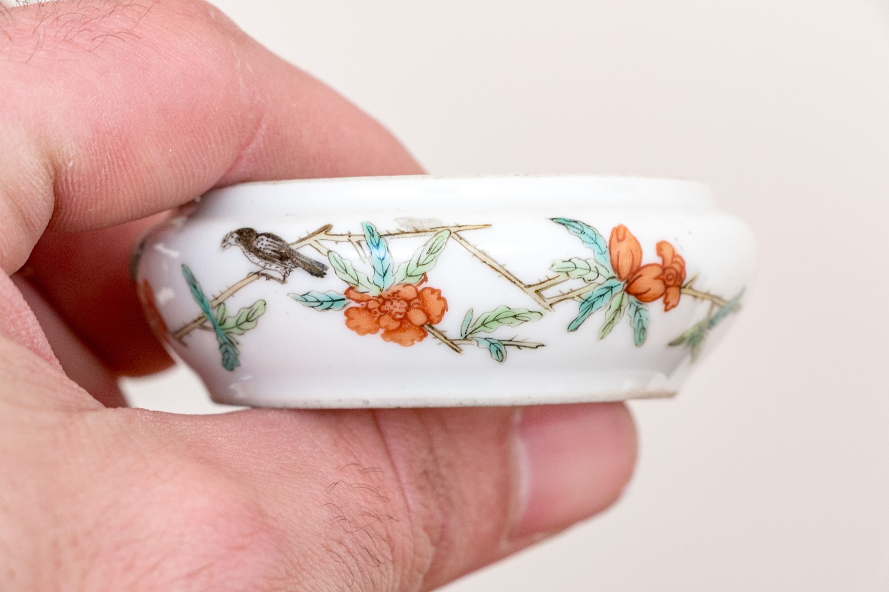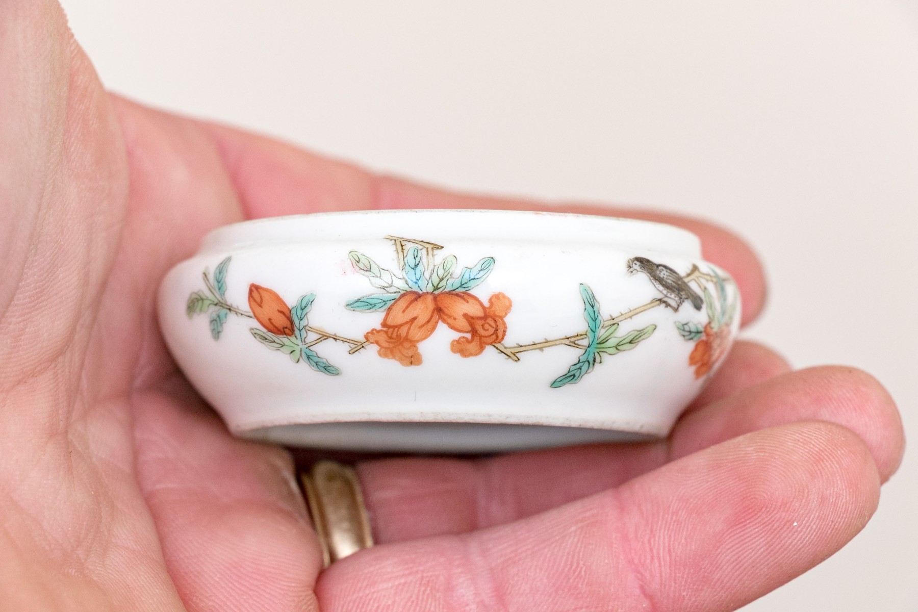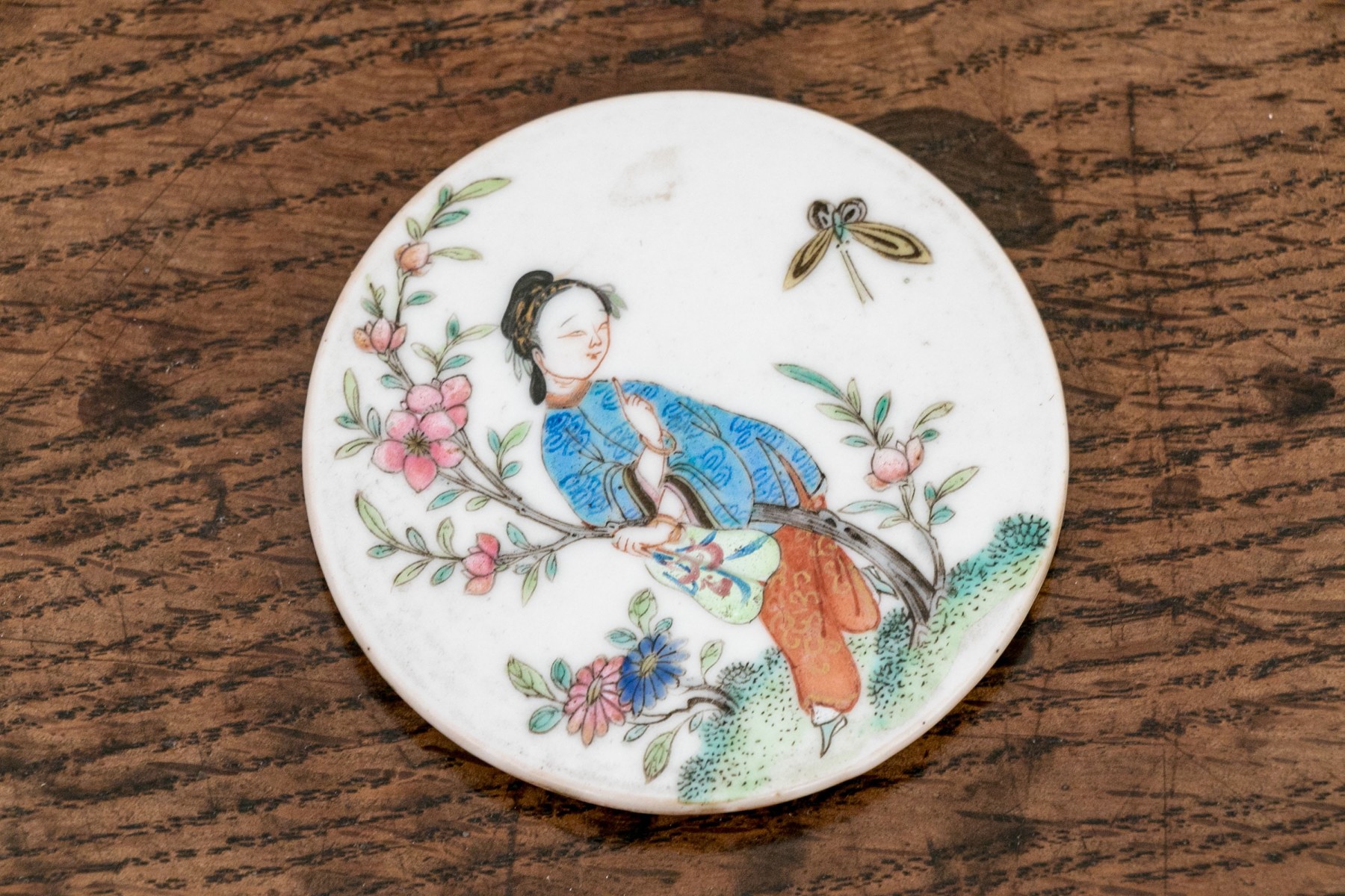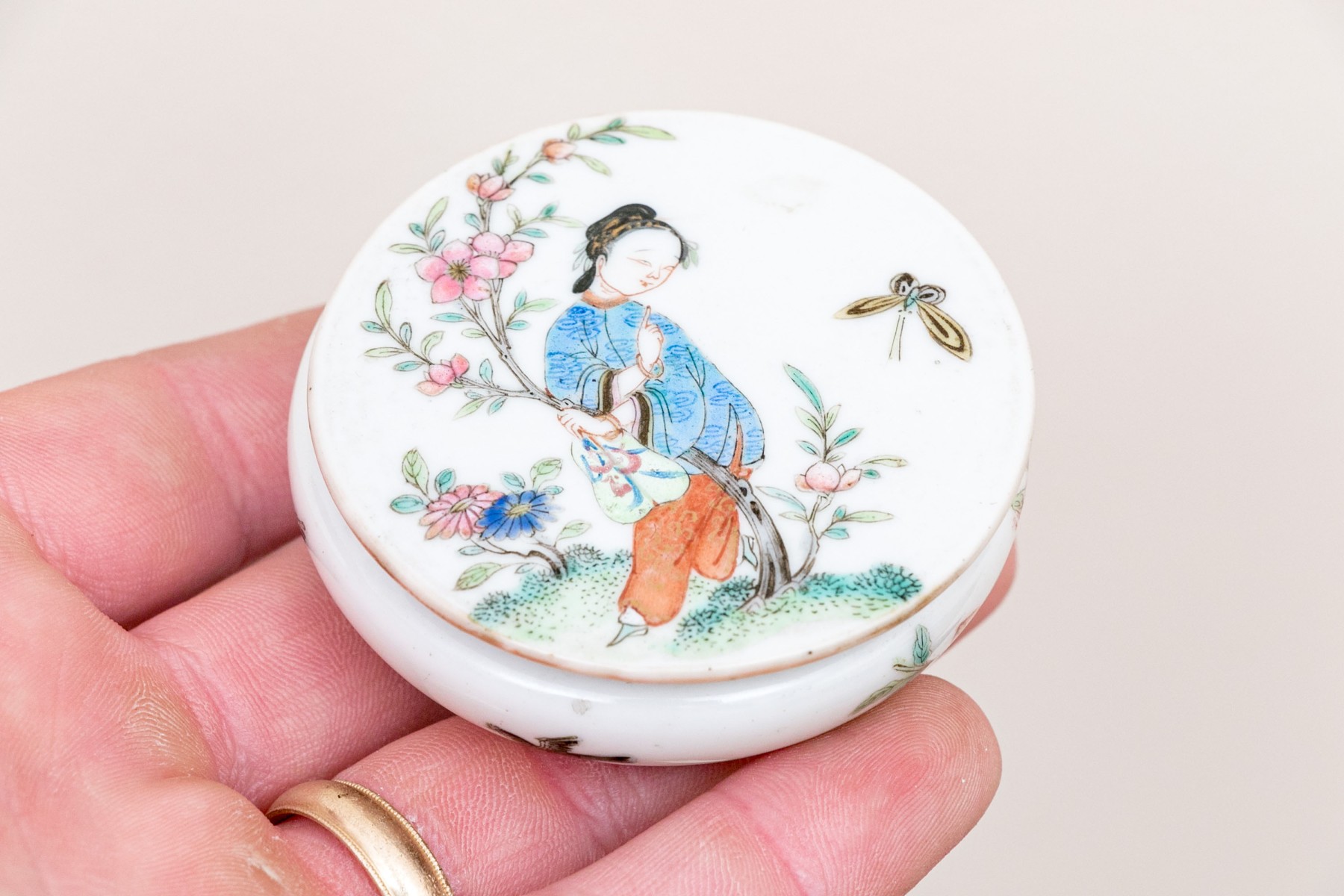 Chinese rose medallion round porcelain trinket box with lid. The box displaying a female figure on lid with flowering branches and butterfly. The exterior of the box with birds and flowering vines.