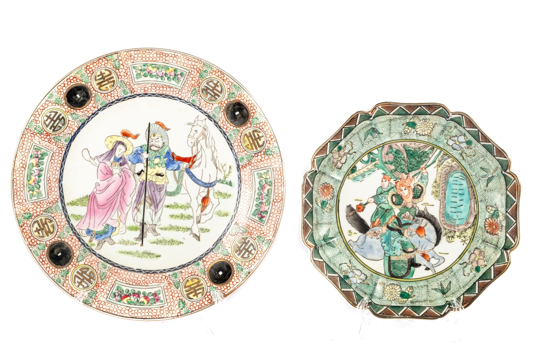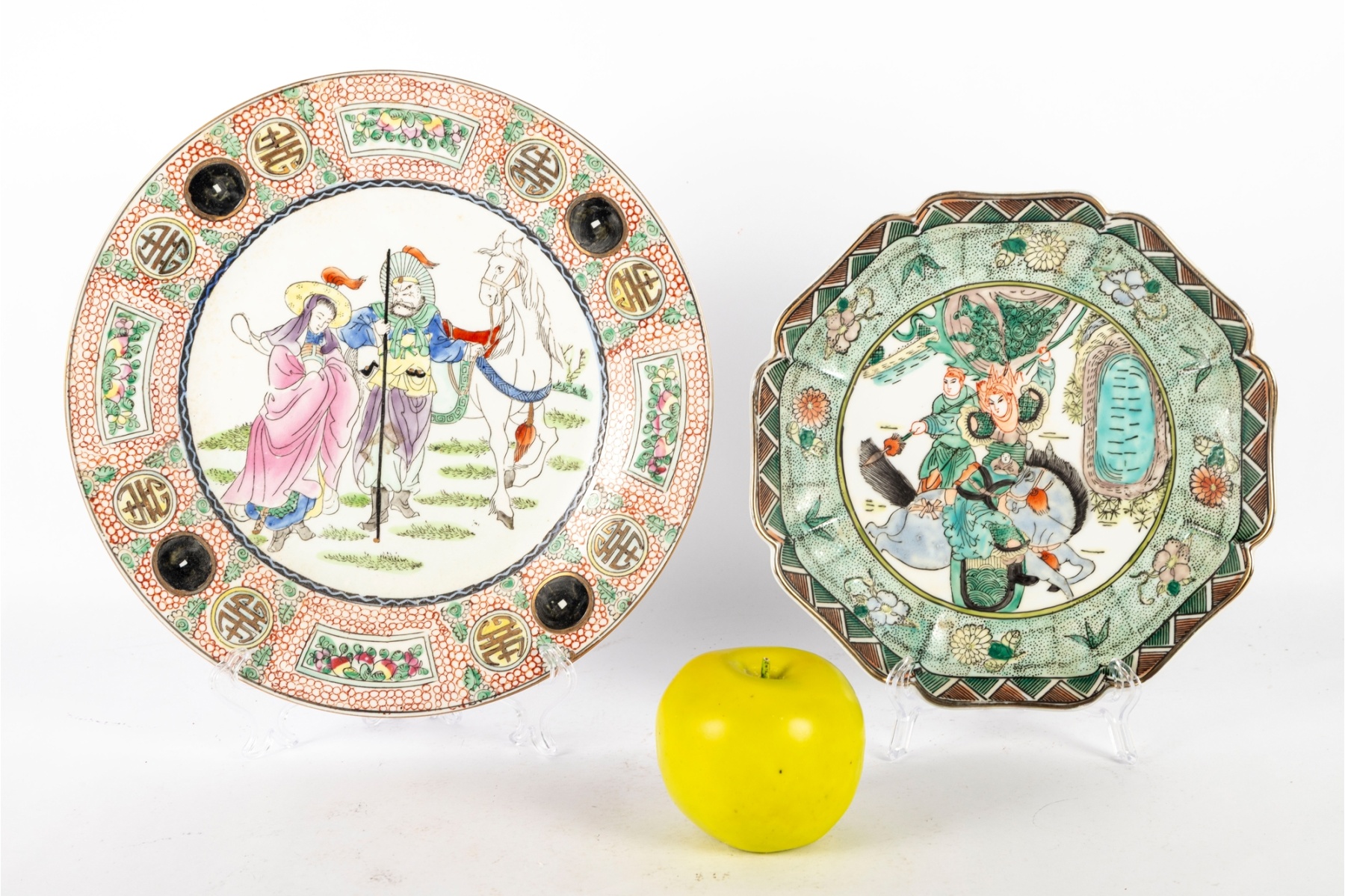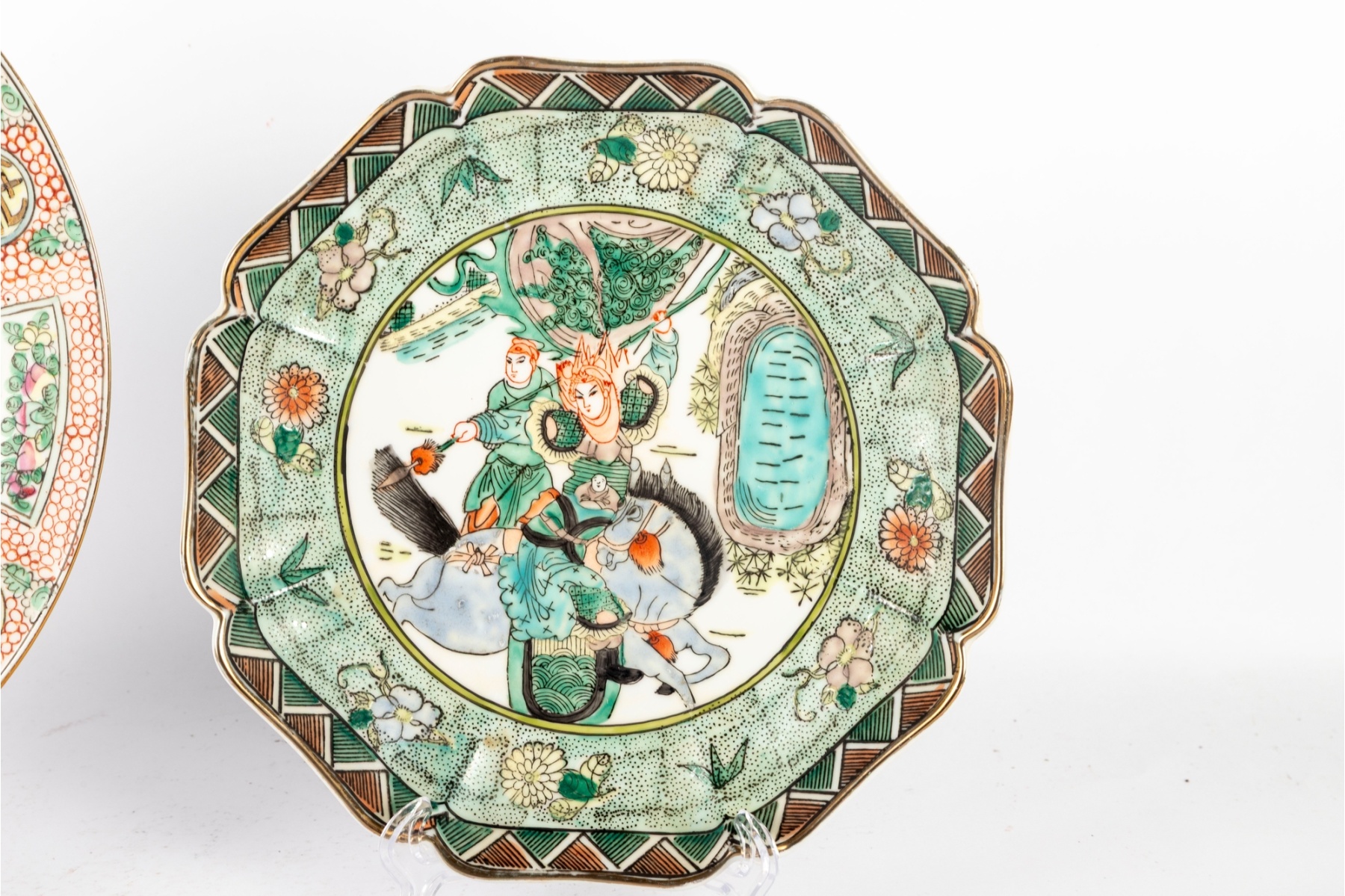 Lovely duo of Chinese porcelain decorative plates featuring hand-painted figural scenes. The larger famille rose plate depicts a scholar and companion beside a horse, framed by a detailed border of auspicious symbols and florals accented in coral and gold. The smaller famille verte plate shows two warriors on horseback surrounded by floral motifs and patterned geometric borders. Both bear red character marks to the underside, one labeled Made in Macau.