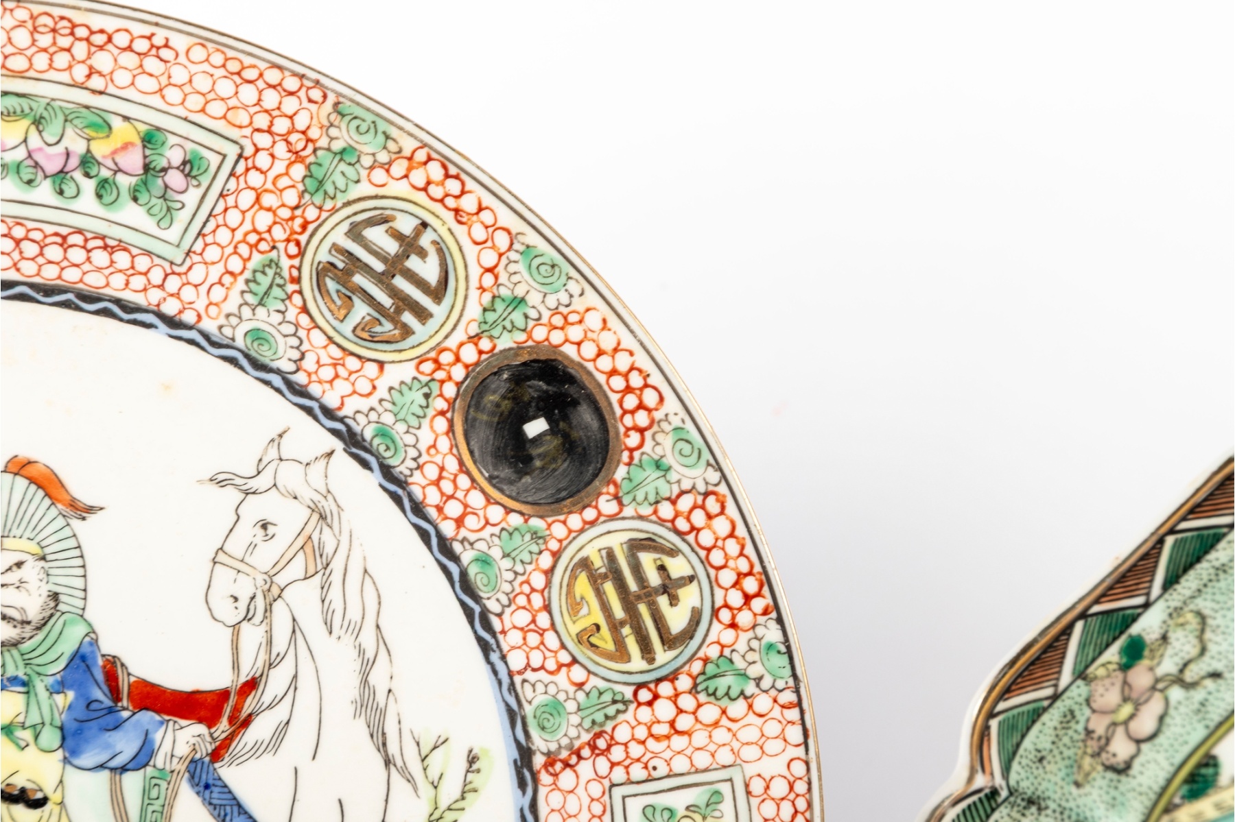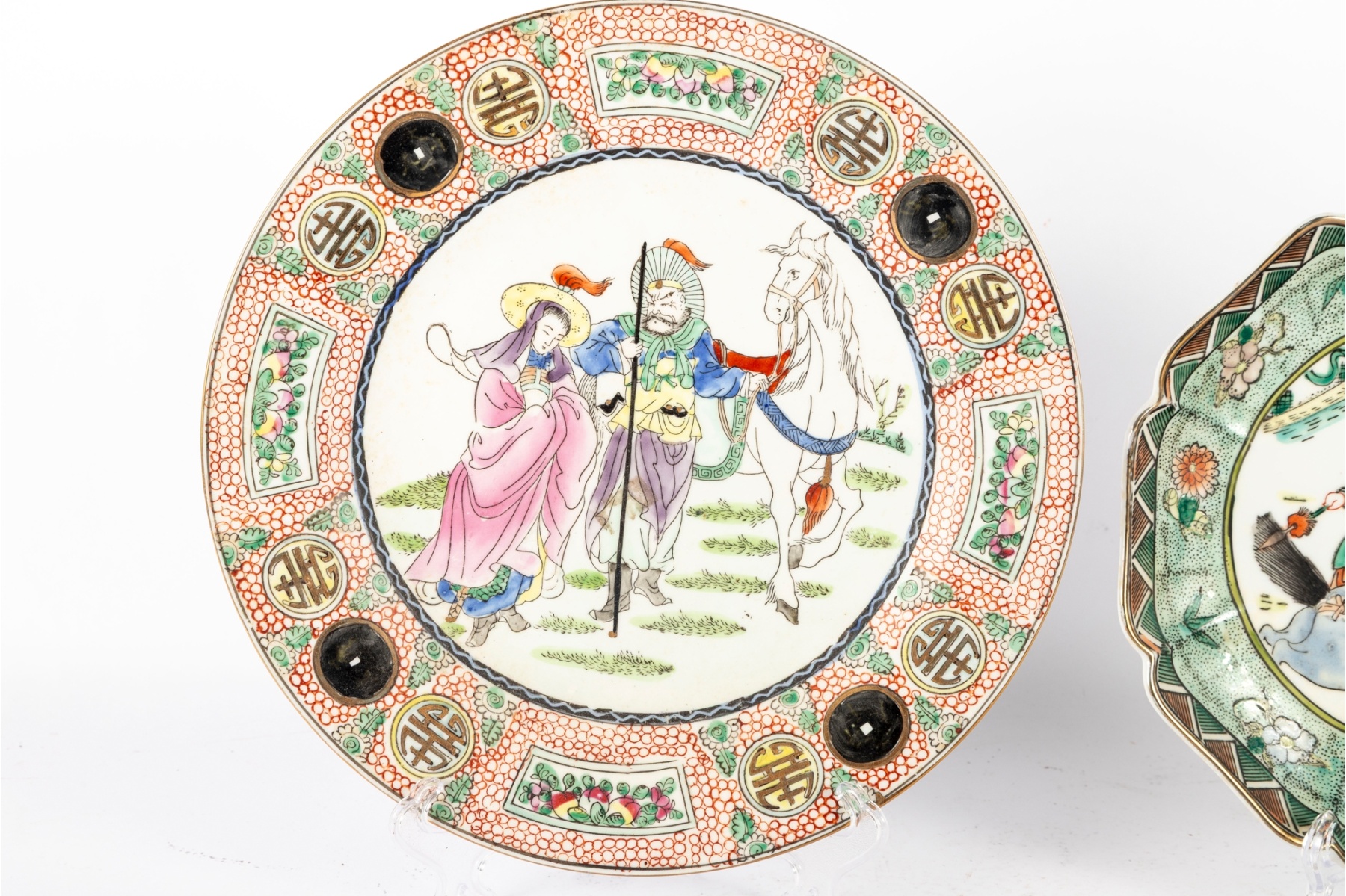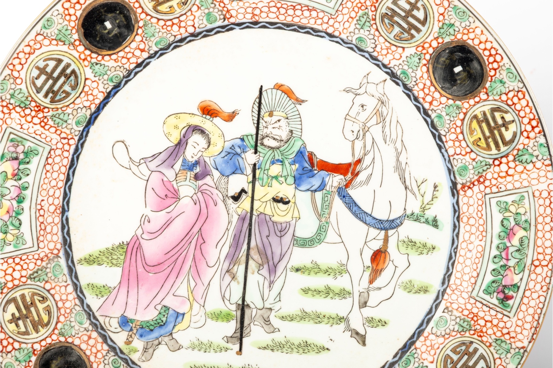 Lovely duo of Chinese porcelain decorative plates featuring hand-painted figural scenes. The larger famille rose plate depicts a scholar and companion beside a horse, framed by a detailed border of auspicious symbols and florals accented in coral and gold. The smaller famille verte plate shows two warriors on horseback surrounded by floral motifs and patterned geometric borders. Both bear red character marks to the underside, one labeled Made in Macau.