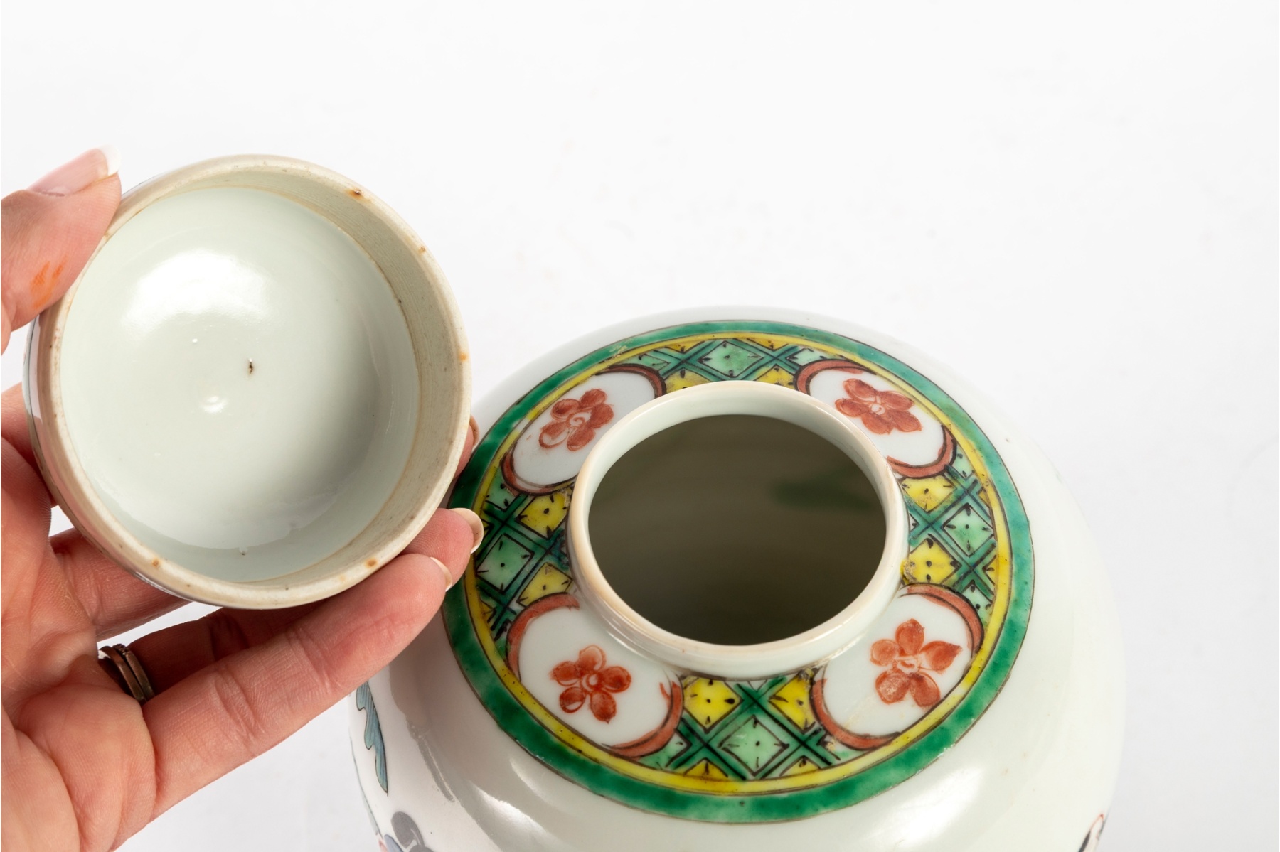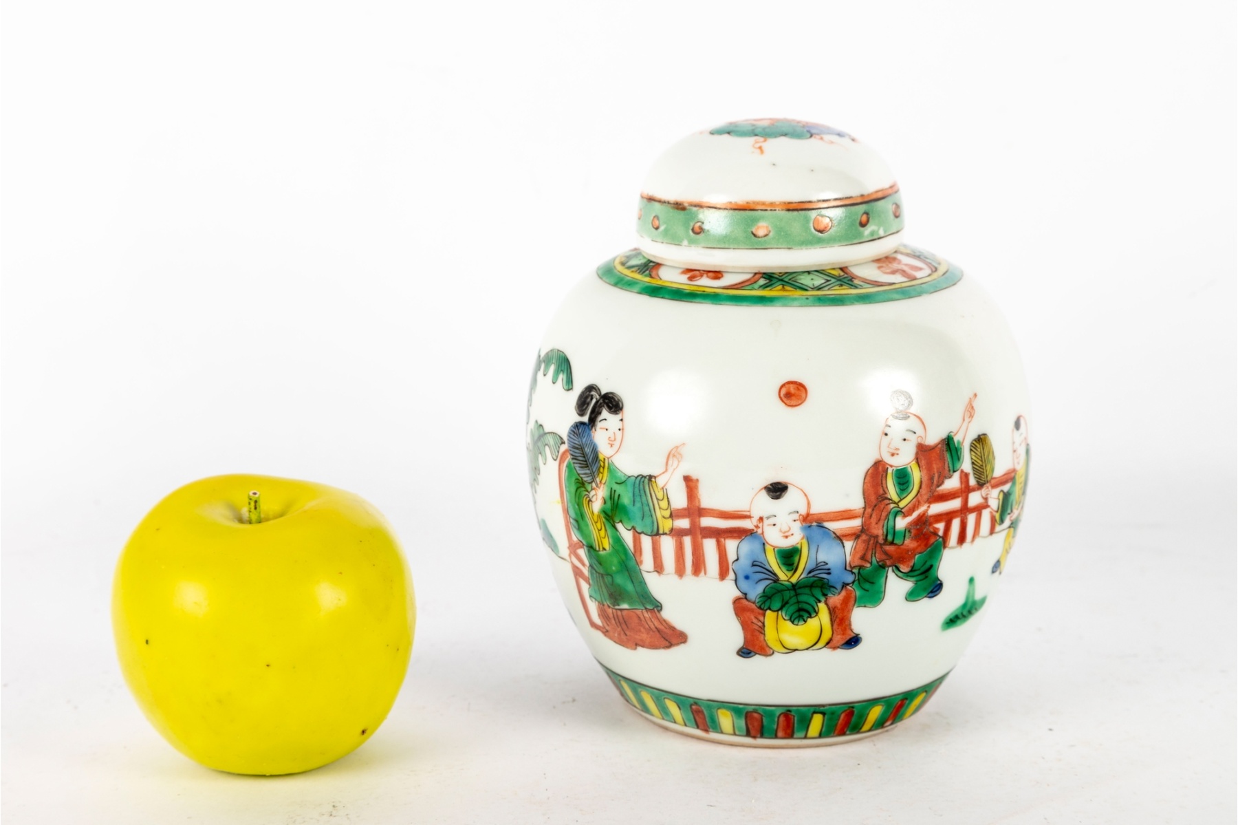 Chinese famille verte ginger jar with a high domed lid and a classic apple-shaped body, displaying hand-painted children playing outside near a red fence, blue rocky outcrop, and green foliage. Signed on the underside.