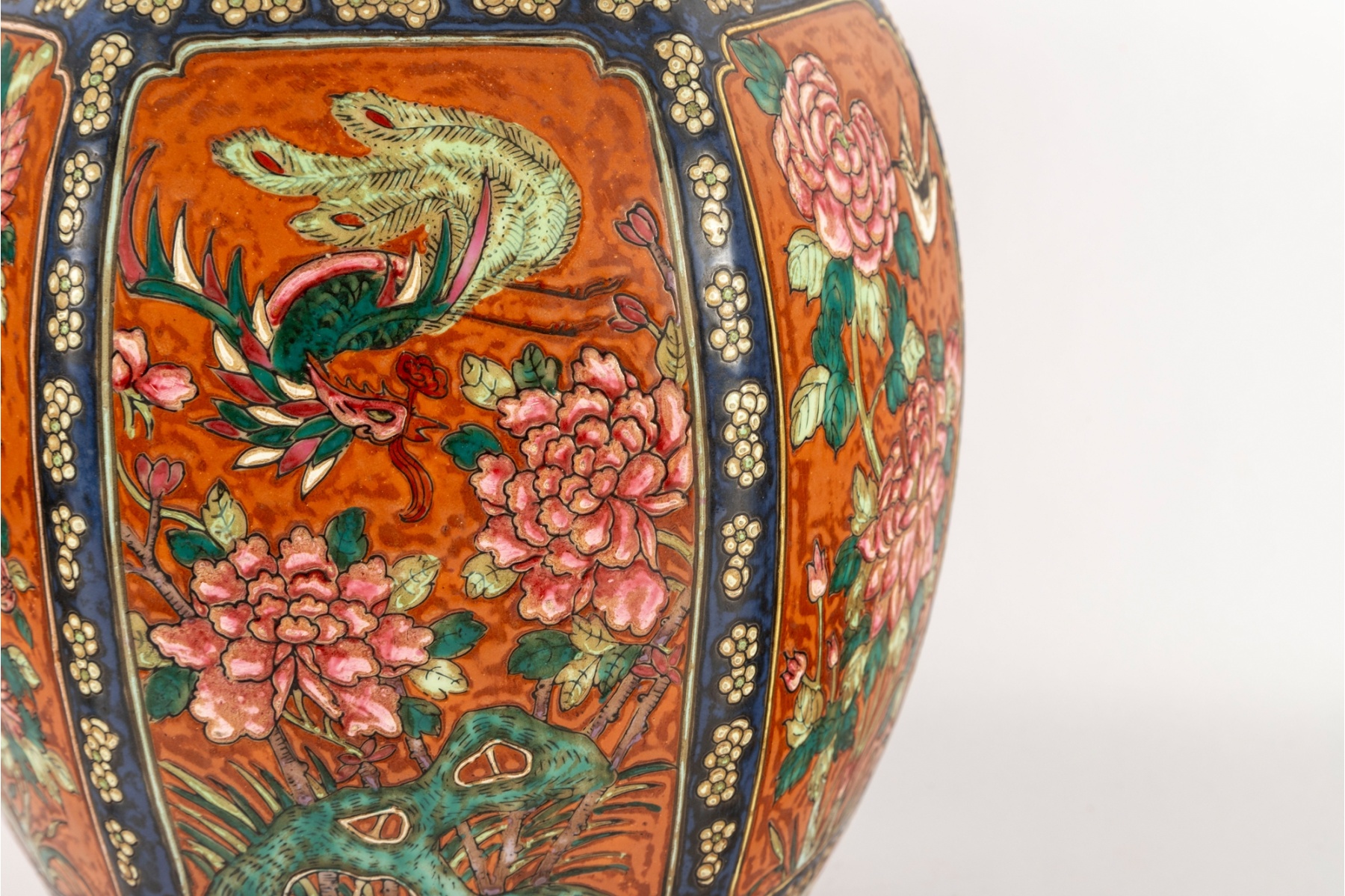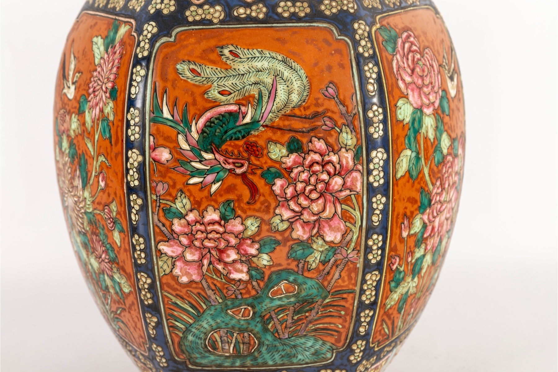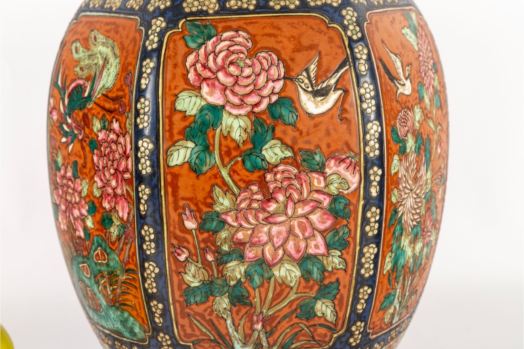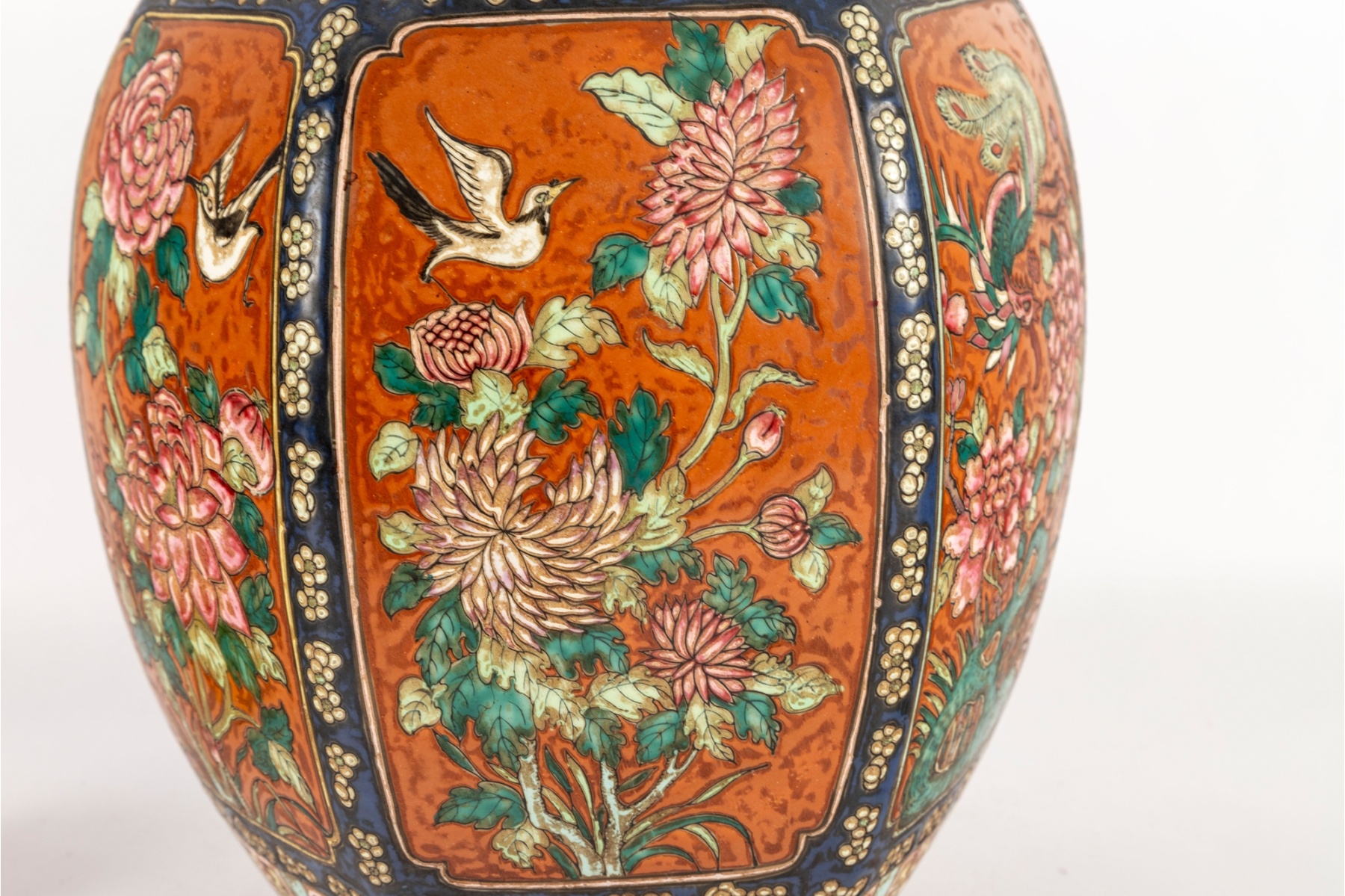 A striking Chinese porcelain ovoid jar in the famille verte palette, featuring finely enameled panels of lush blooming flowers, birds in flight, and stylized foliage. The warm rust-orange ground is beautifully contrasted by vibrant greens, pinks, and blues, all framed with intricate geometric and floral borders.