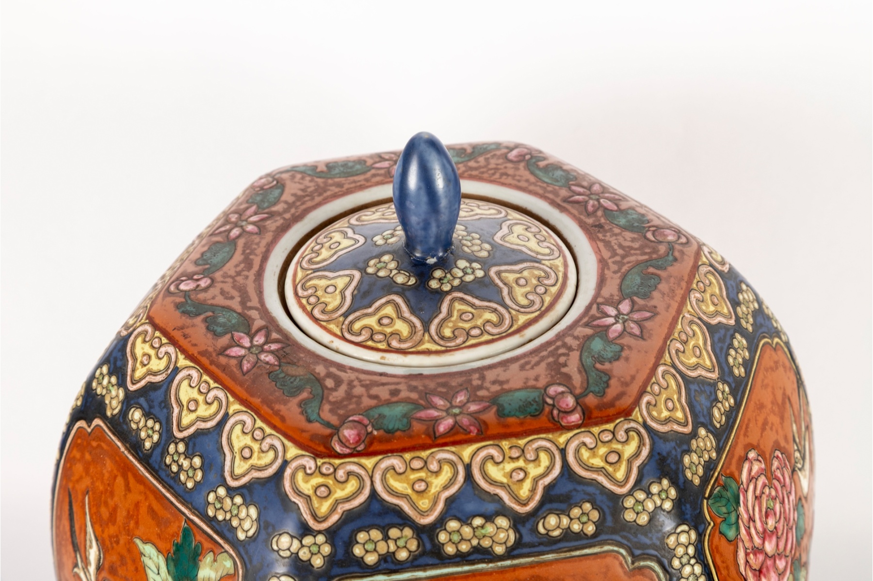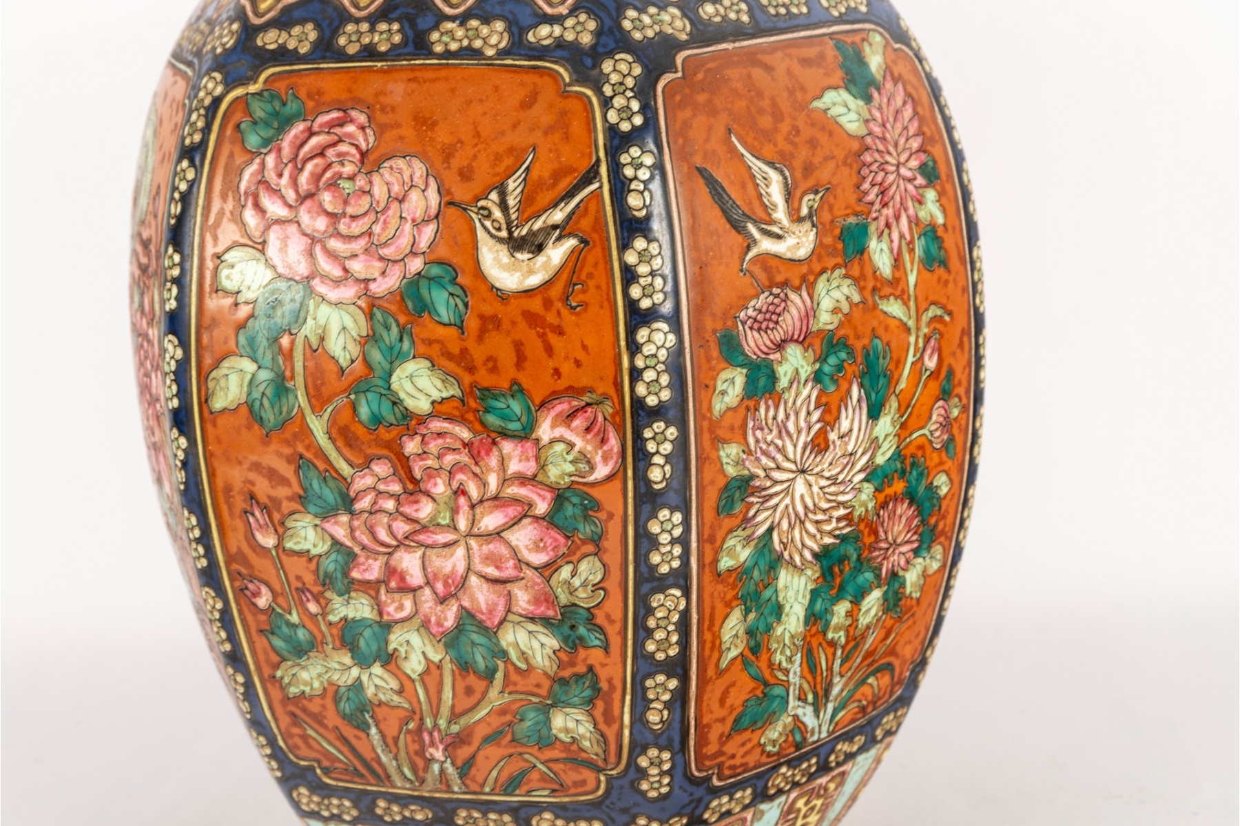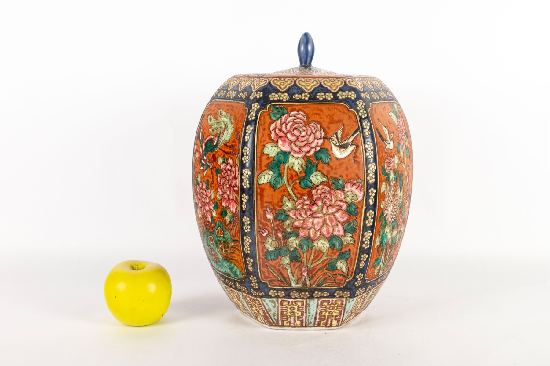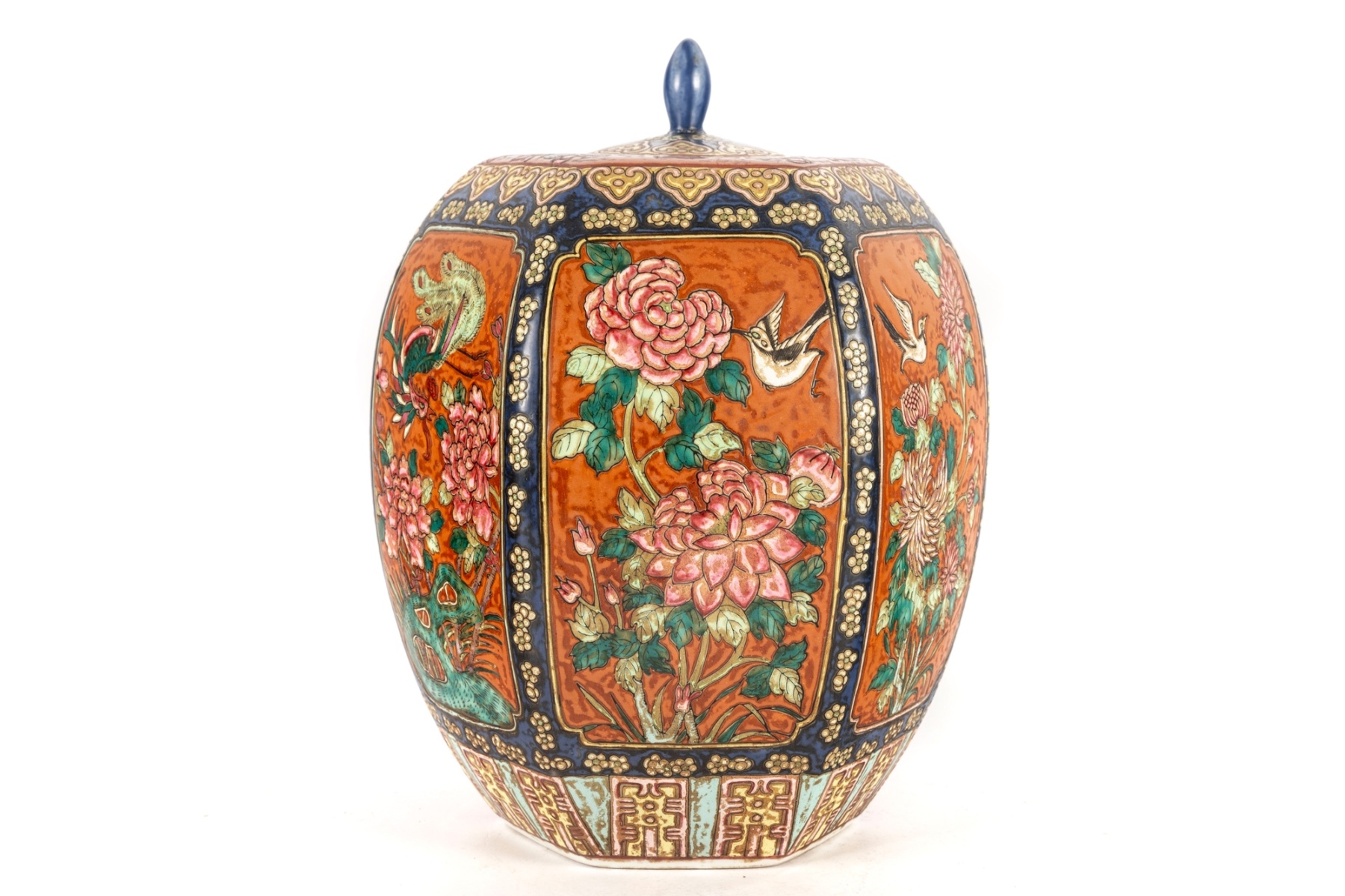 A striking Chinese porcelain ovoid jar in the famille verte palette, featuring finely enameled panels of lush blooming flowers, birds in flight, and stylized foliage. The warm rust-orange ground is beautifully contrasted by vibrant greens, pinks, and blues, all framed with intricate geometric and floral borders.