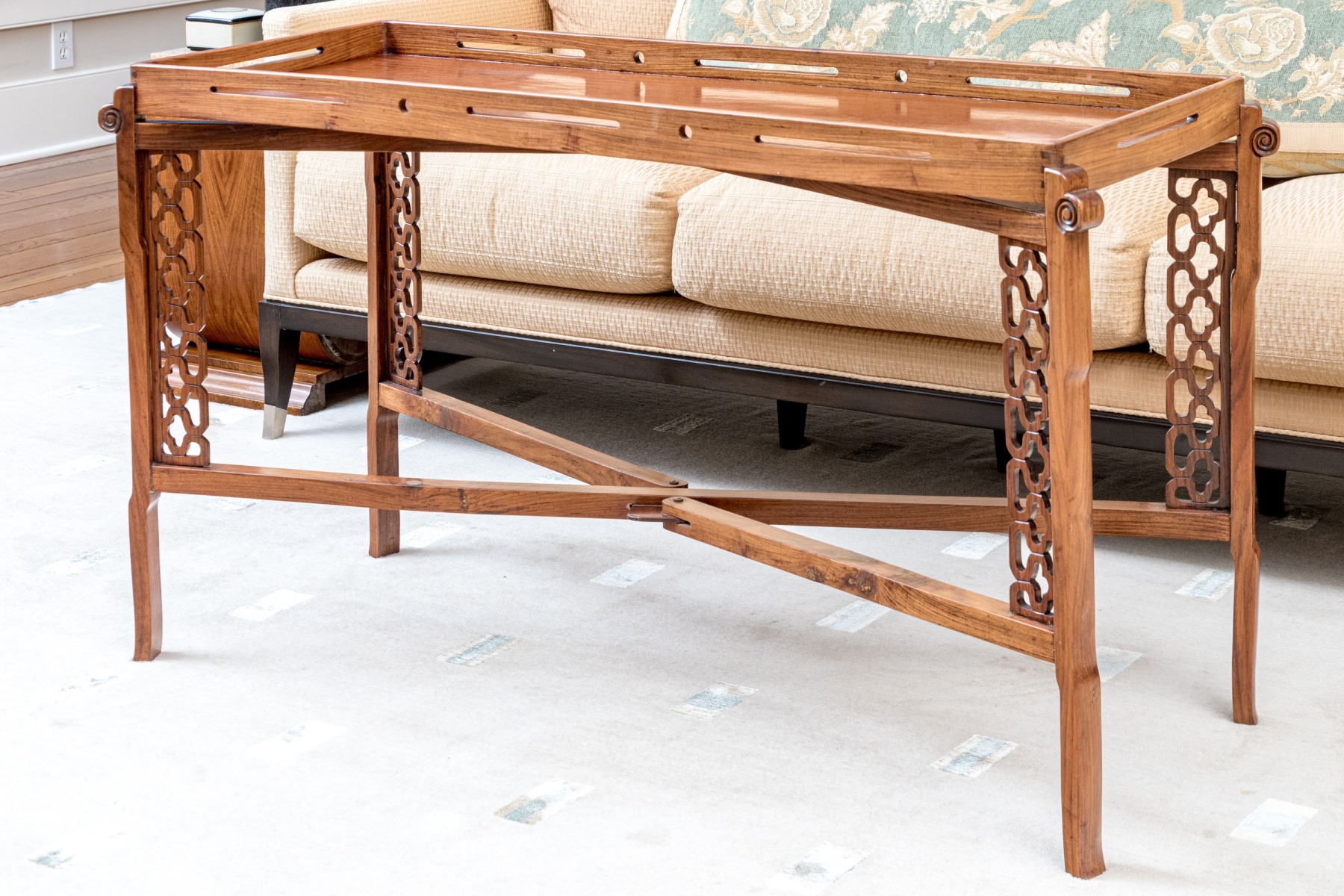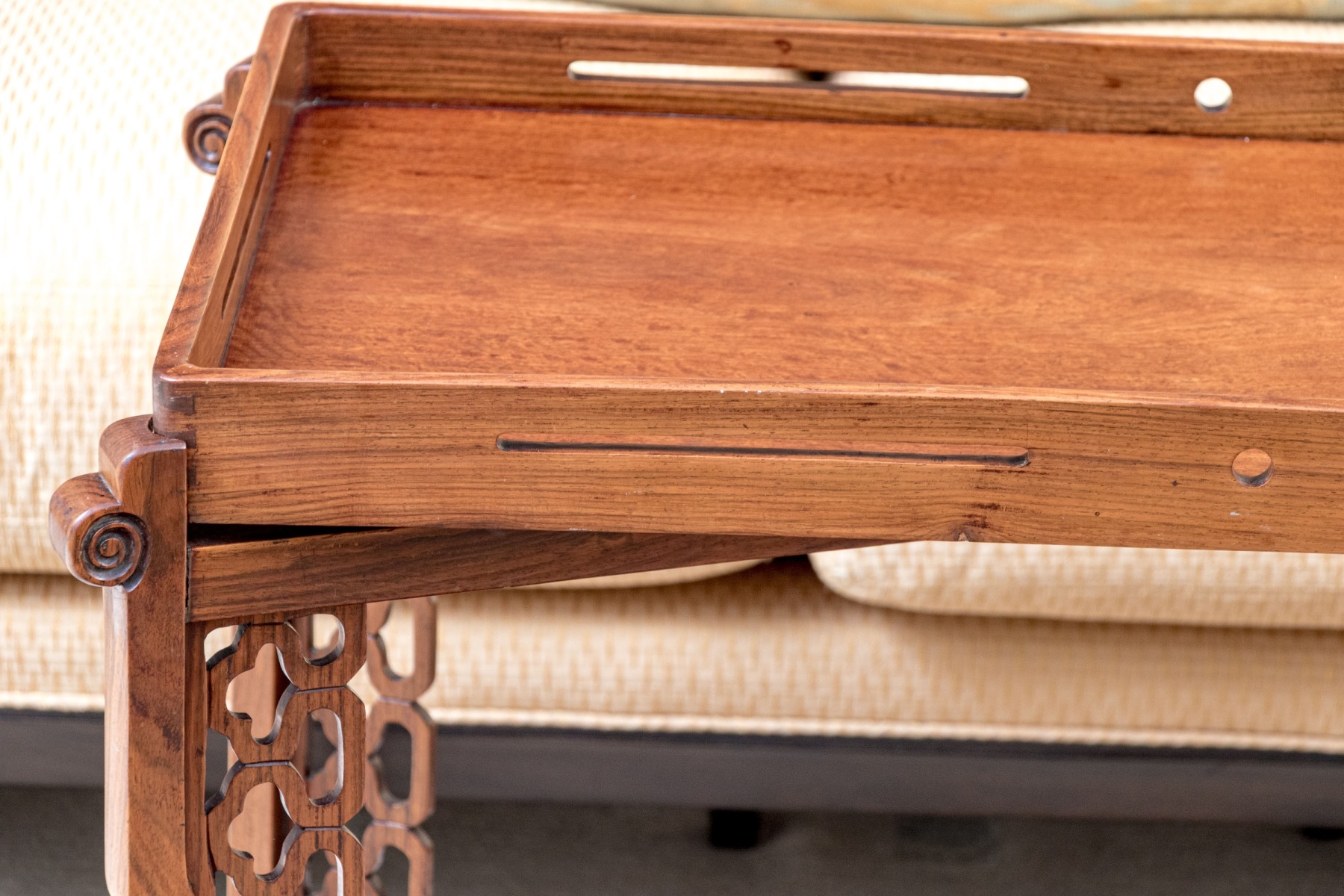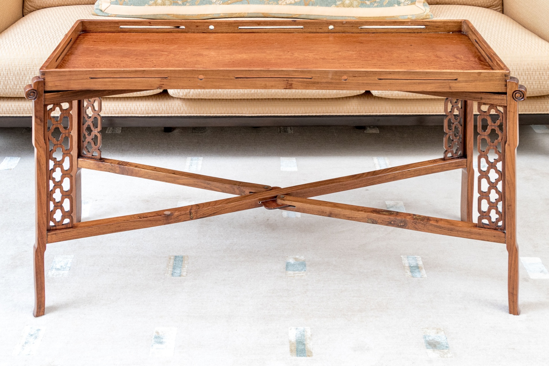 A fabulous Chinese tray table showcasing a generous rectangular tray top with a pierced gallery set atop a folding base with openwork pierced trefoil panels along the sides and carved scrolled motifs at the tops of gently bracketed legs supported by an X form stretcher.