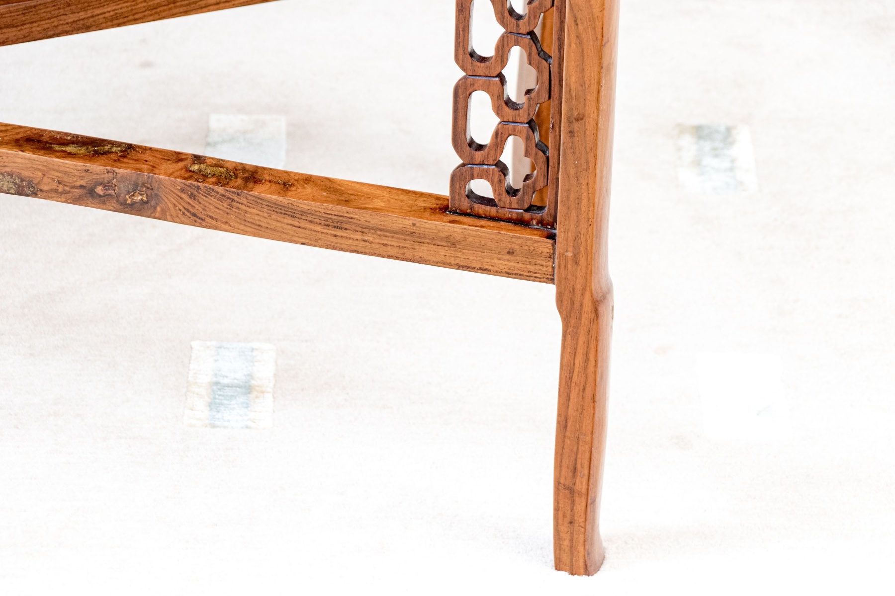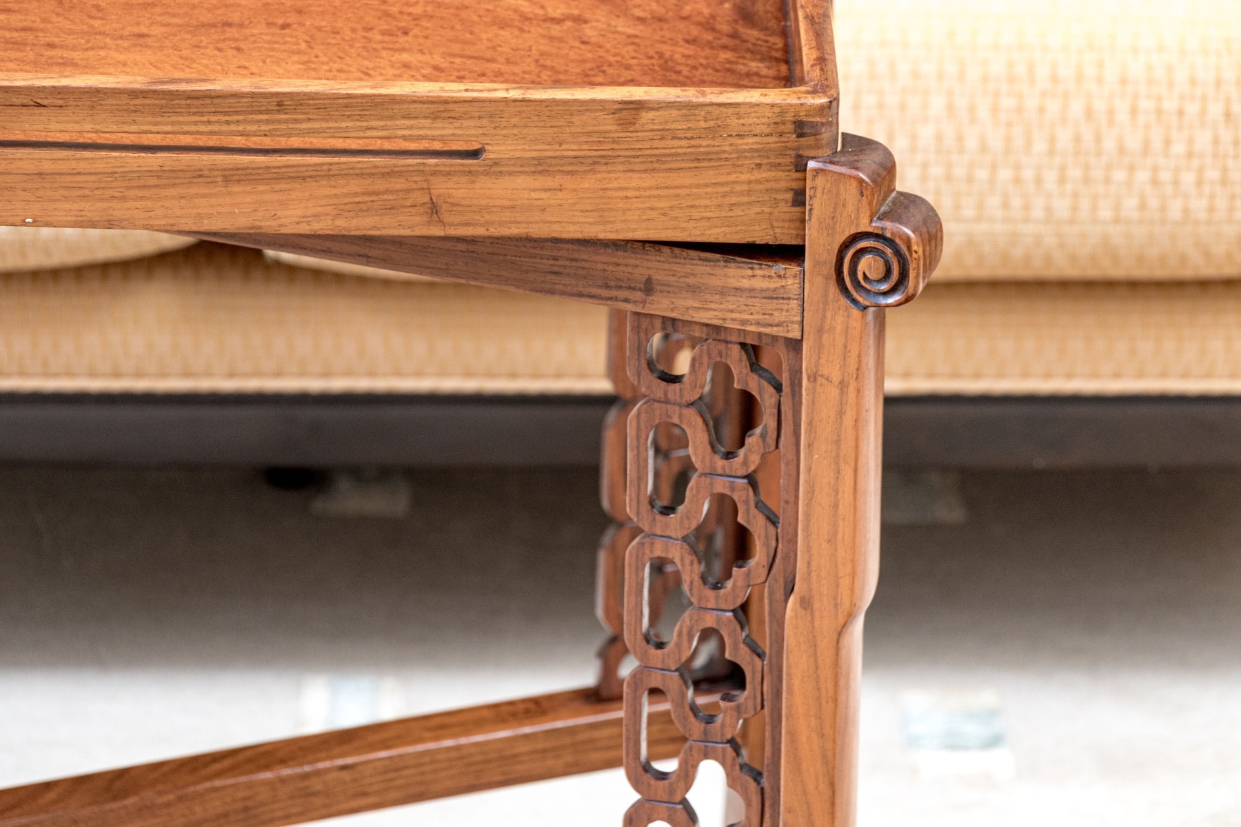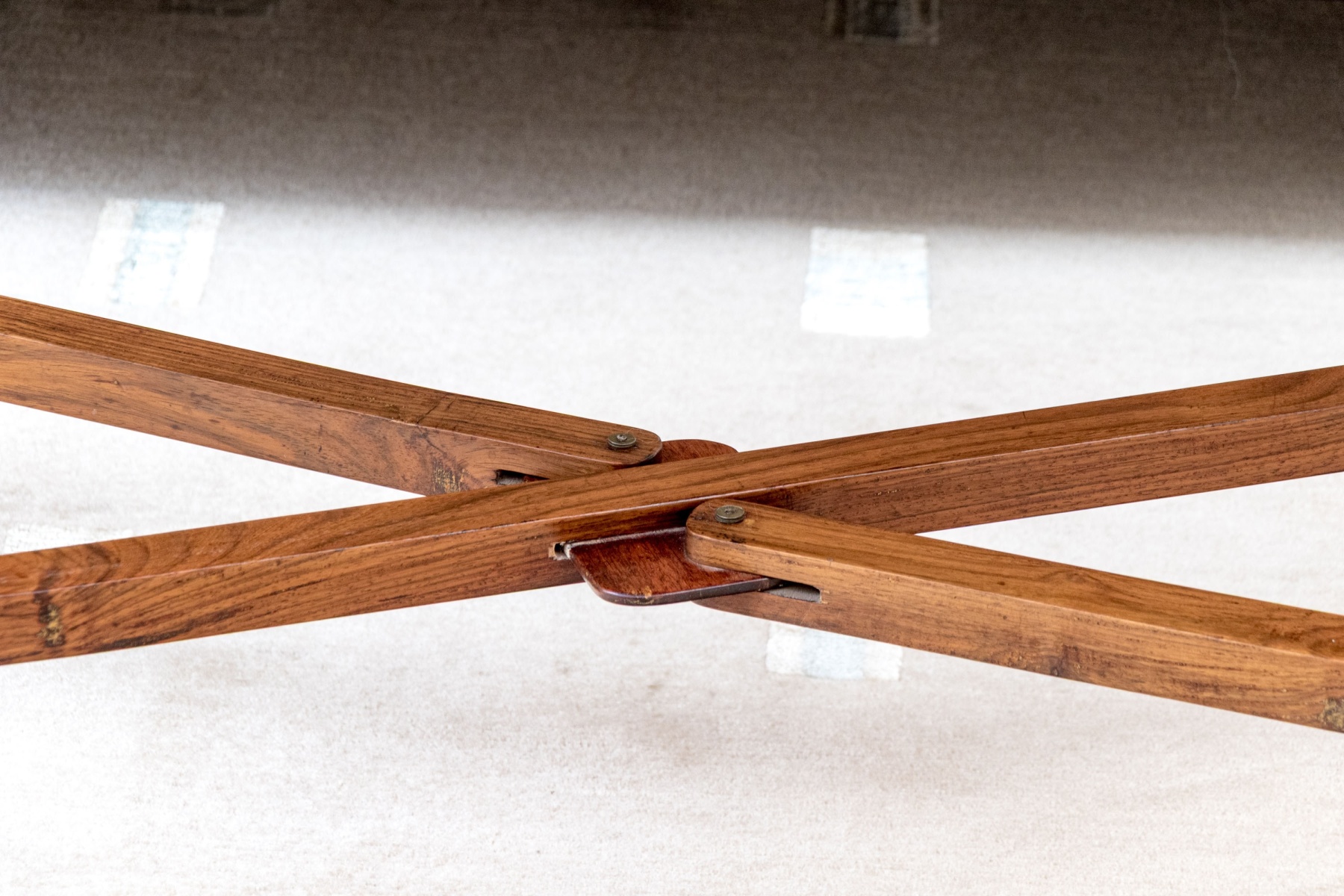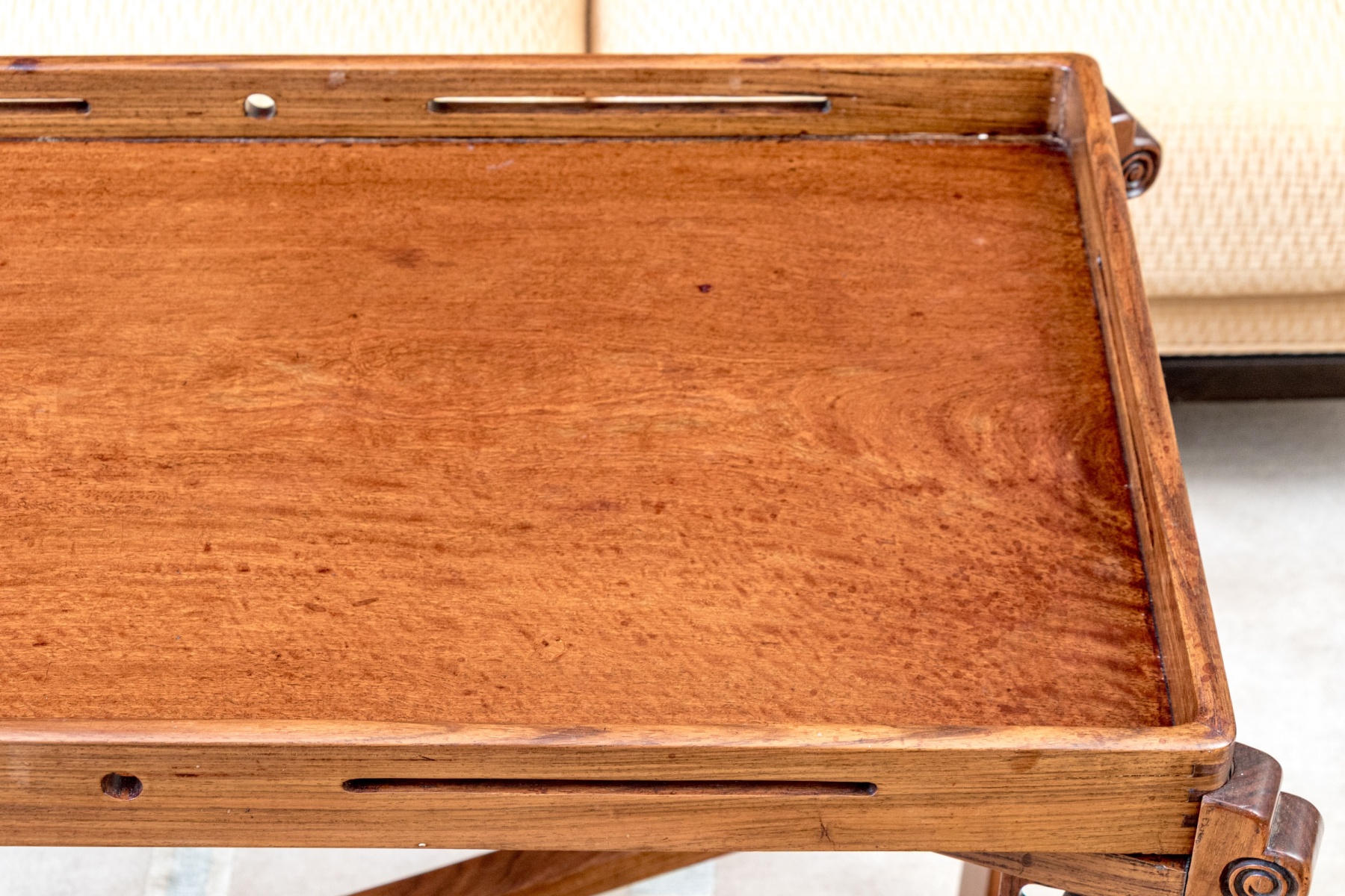 A fabulous Chinese tray table showcasing a generous rectangular tray top with a pierced gallery set atop a folding base with openwork pierced trefoil panels along the sides and carved scrolled motifs at the tops of gently bracketed legs supported by an X form stretcher.