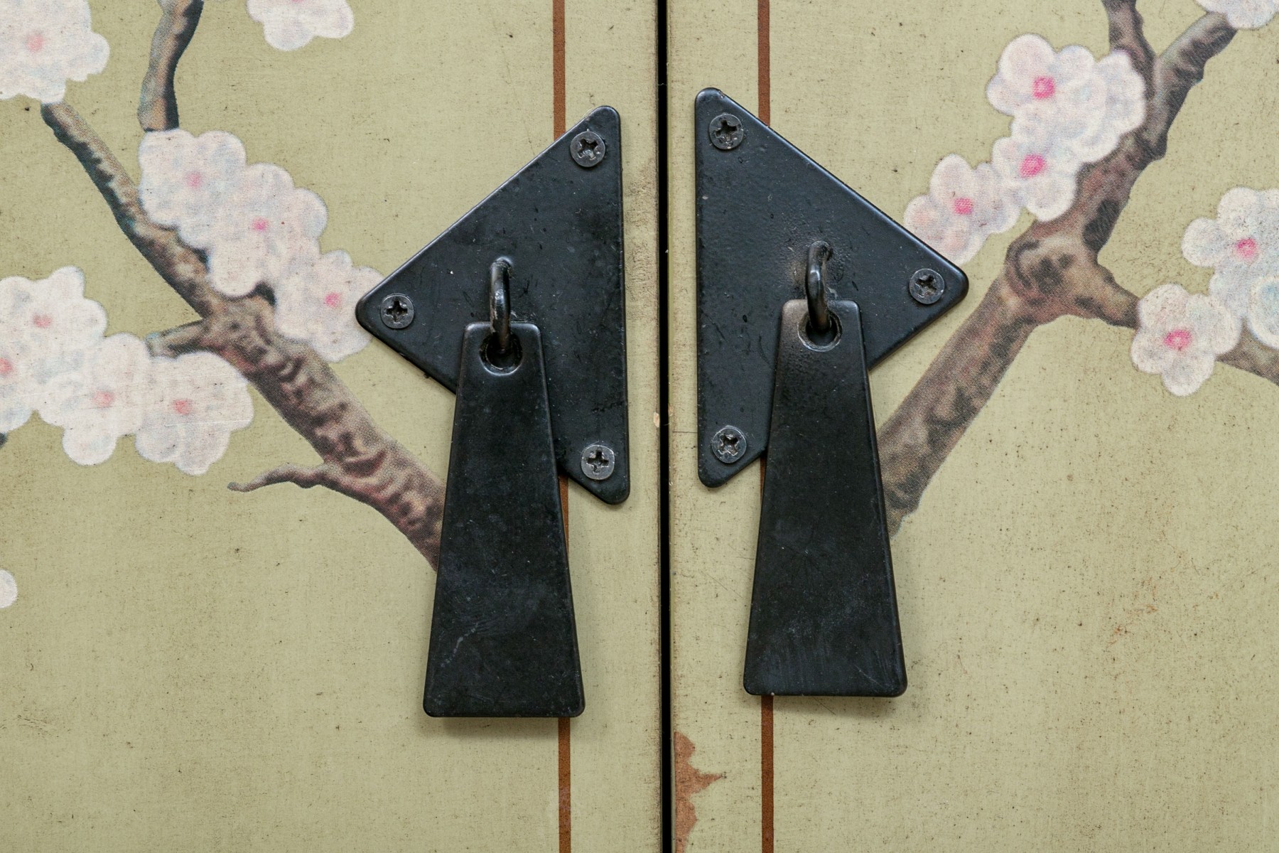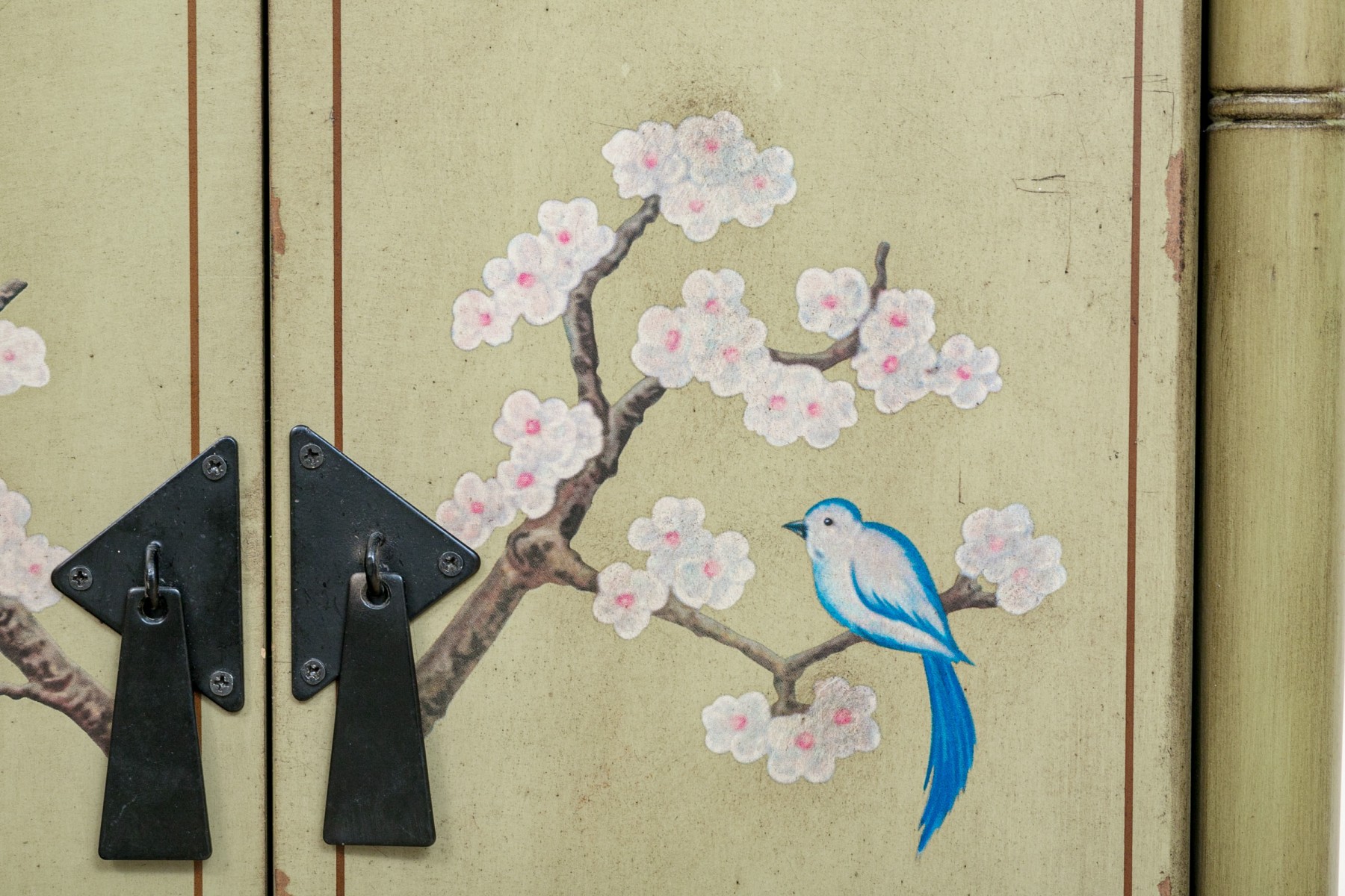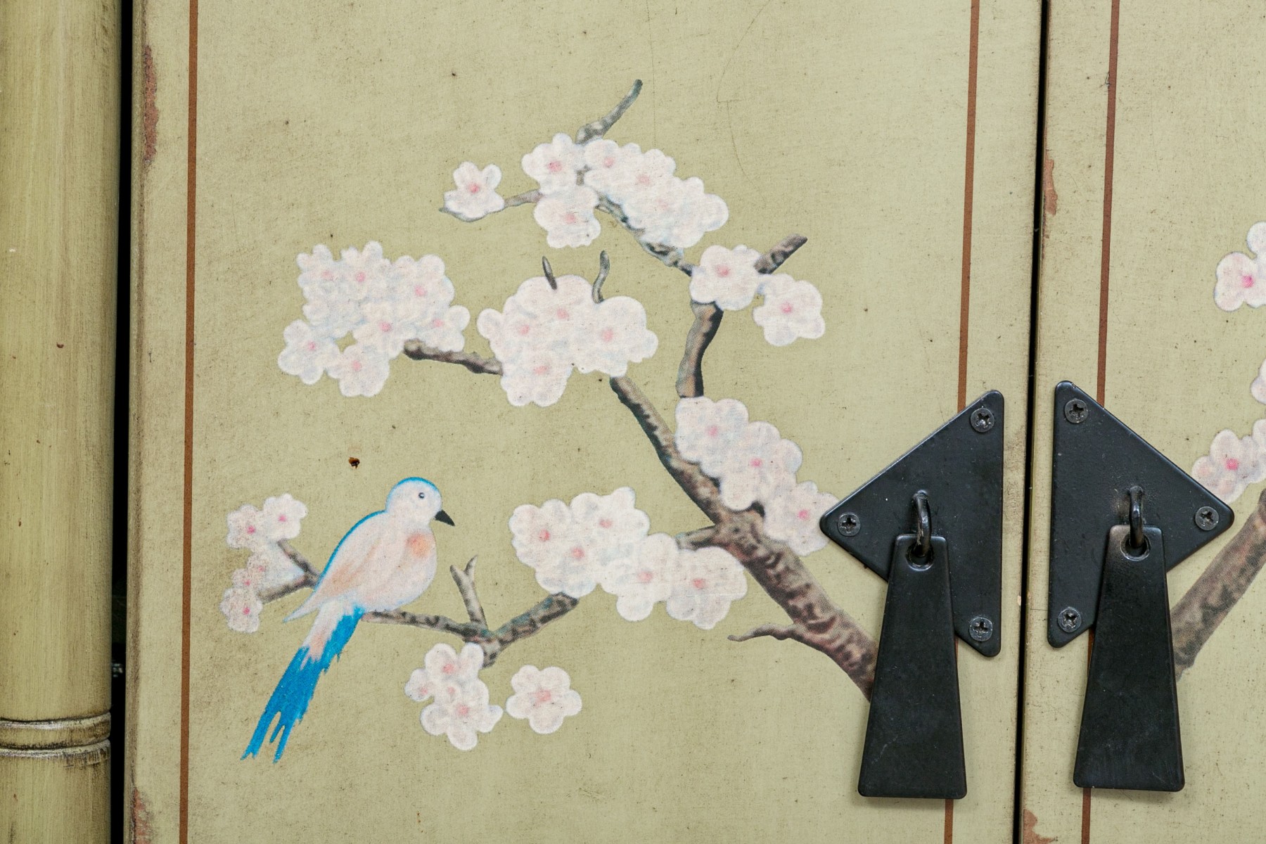 Double doors with painted depicting birds perched upon cherry blossom branches.