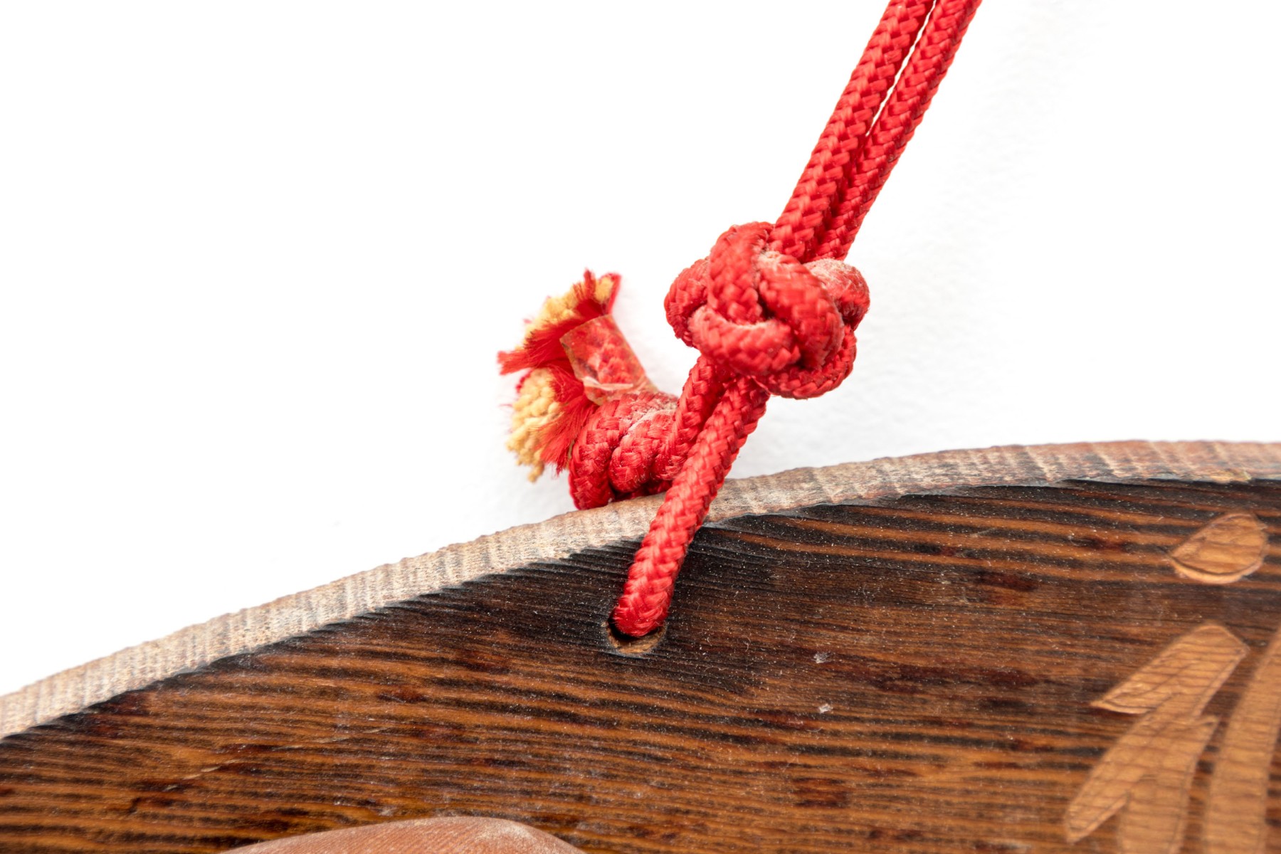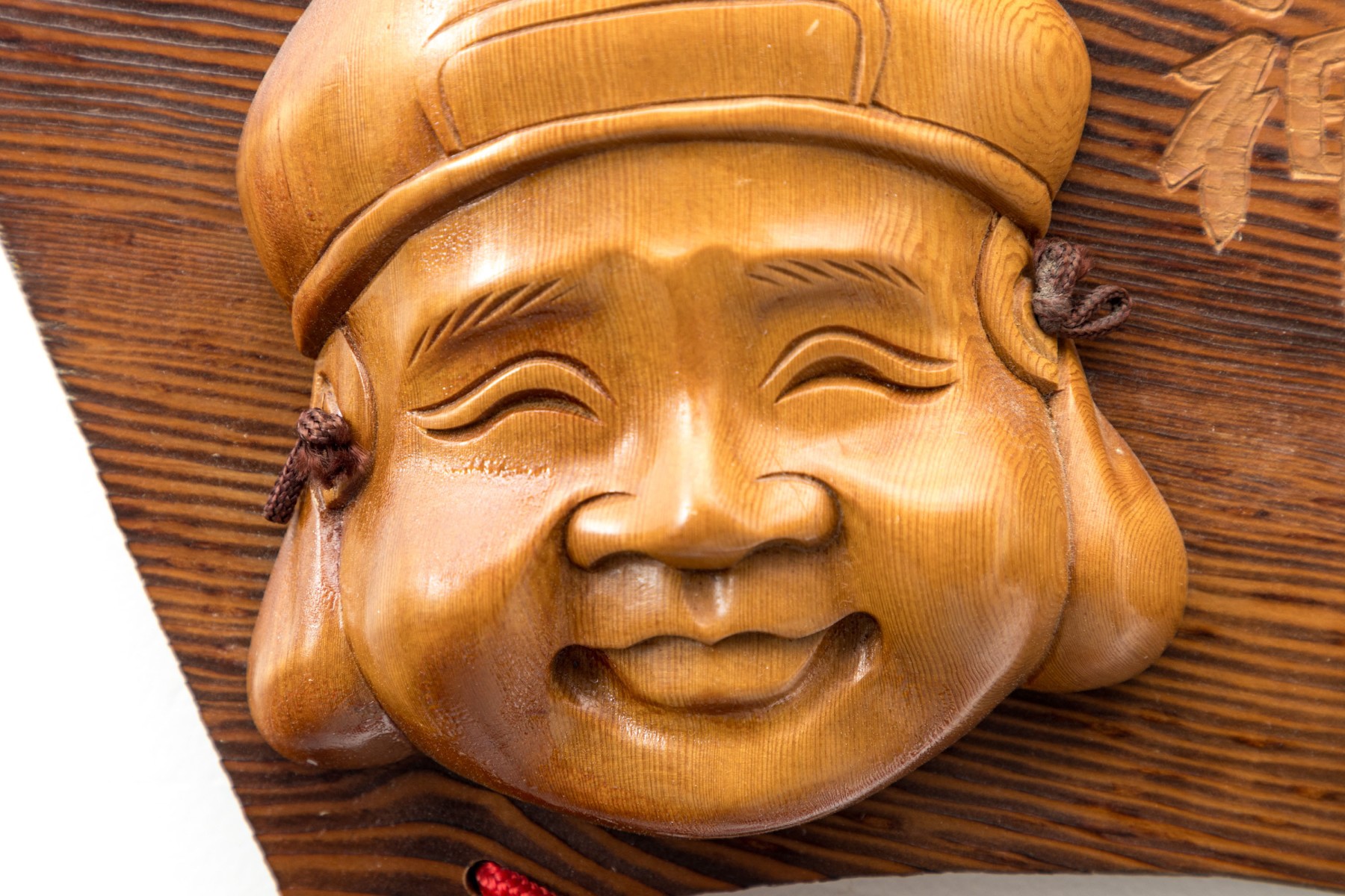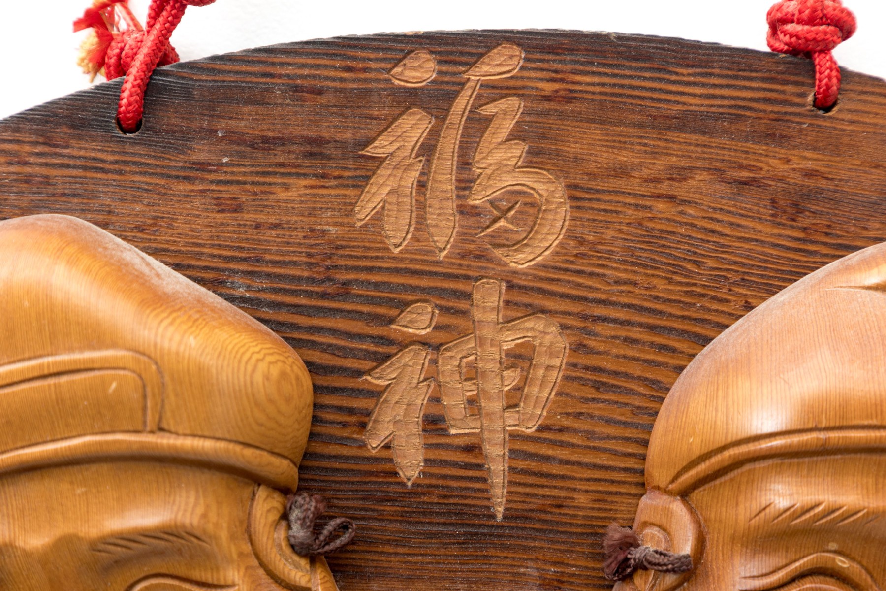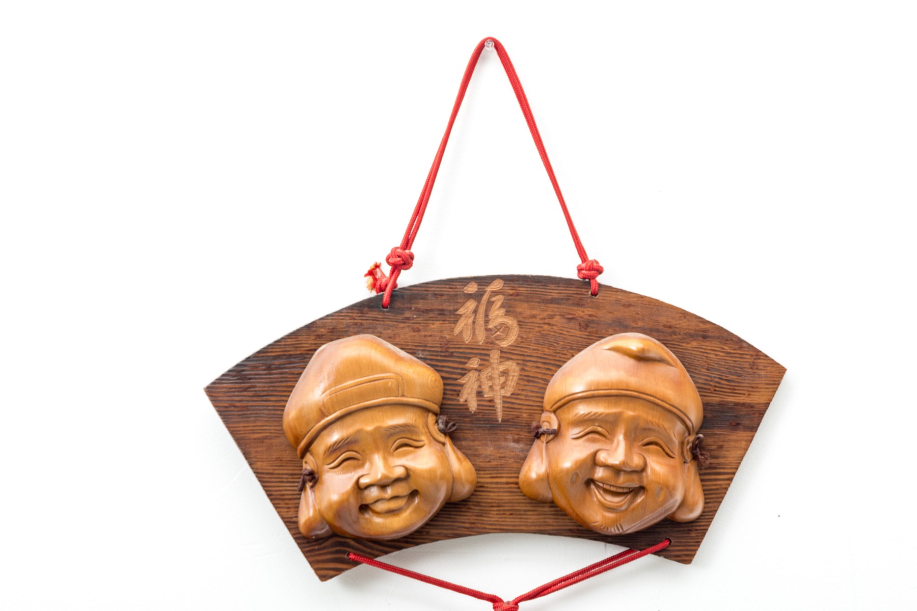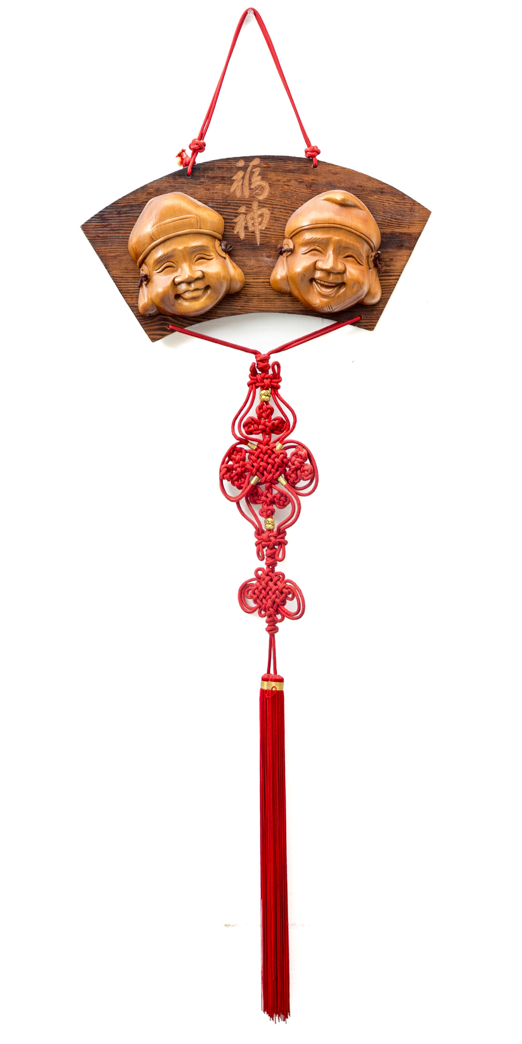A wood-carved Chinese ornamental wall plaque presumably representing Caishen, the god of luck and fortune — strung together with red cord and decorative tassles.