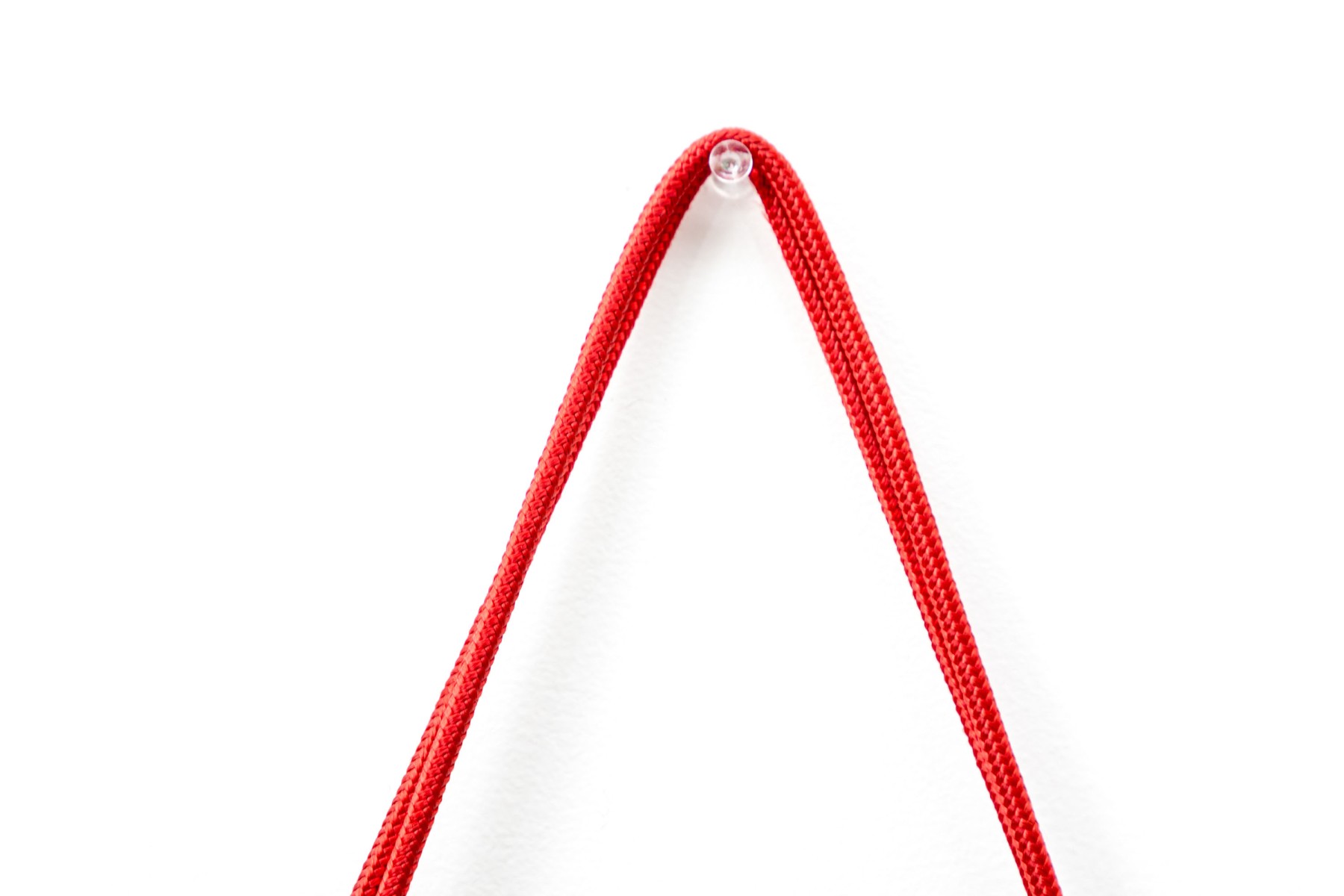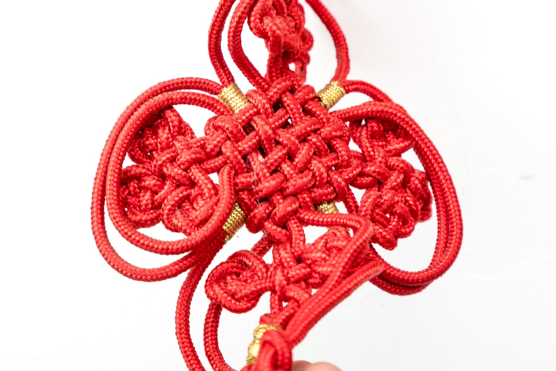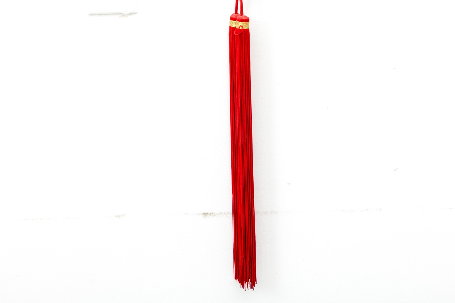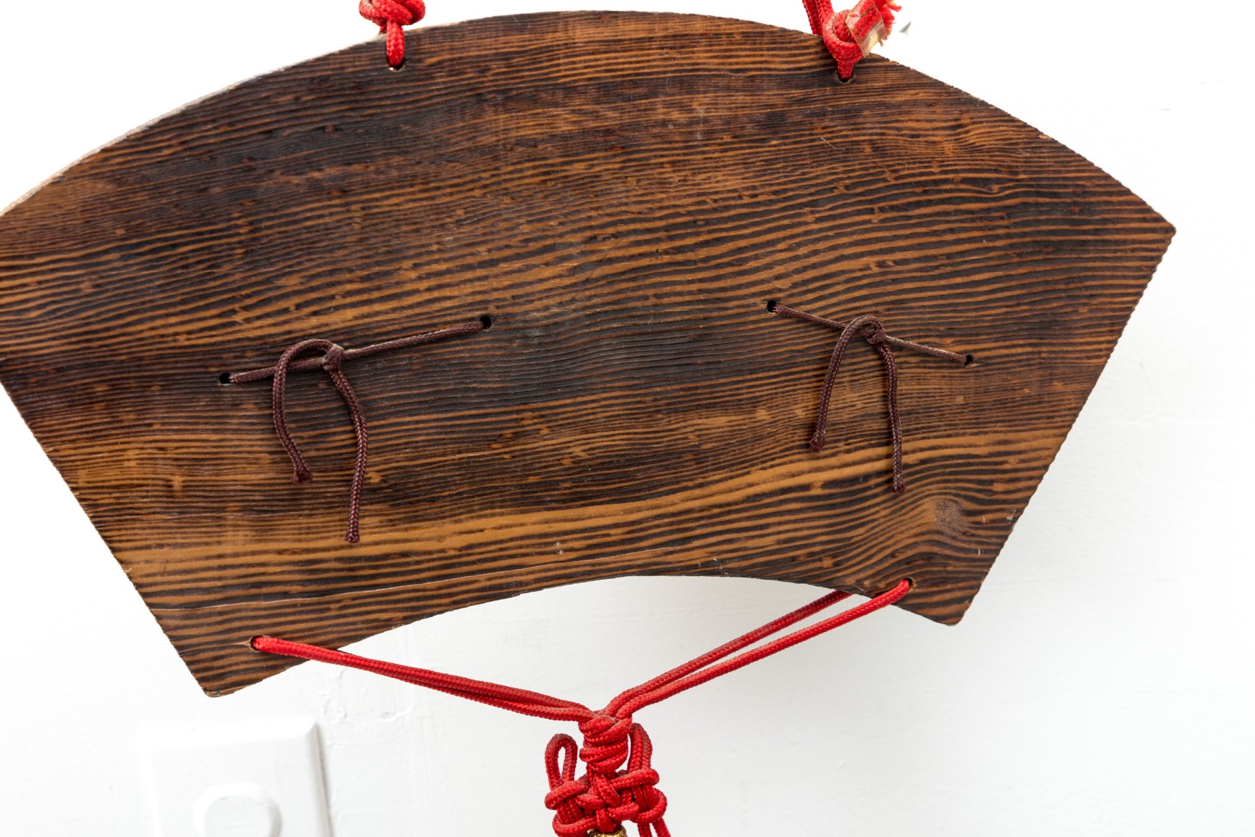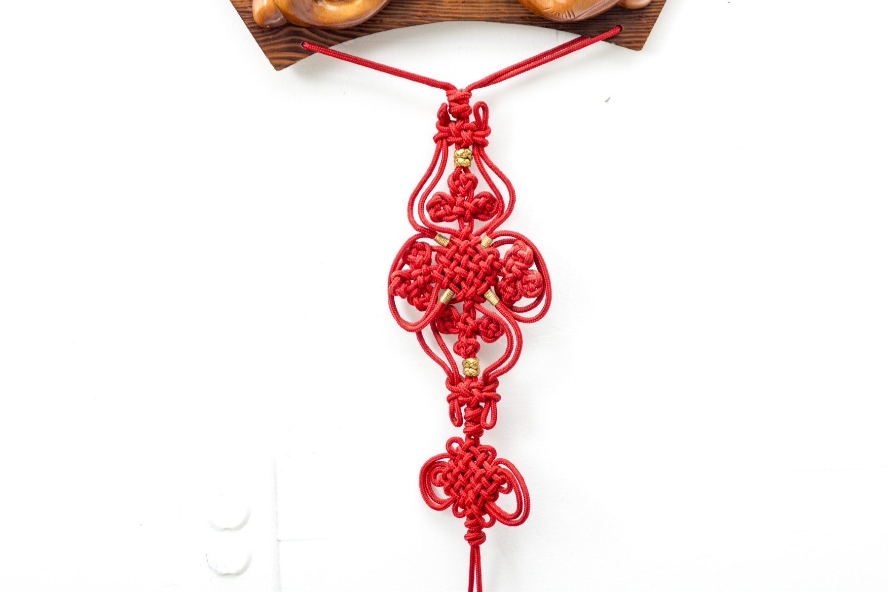 A wood-carved Chinese ornamental wall plaque presumably representing Caishen, the god of luck and fortune — strung together with red cord and decorative tassles.