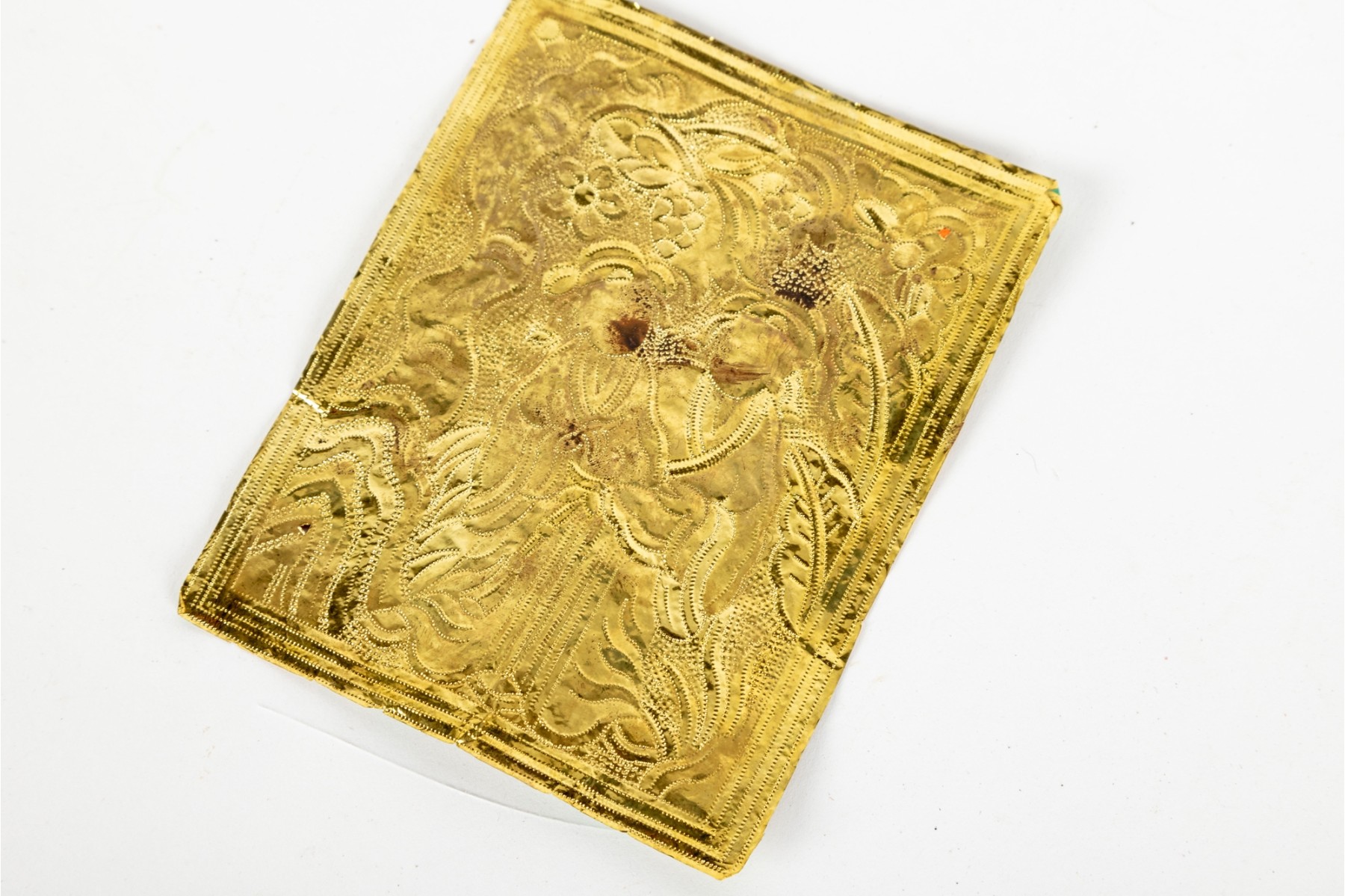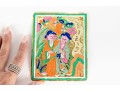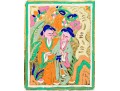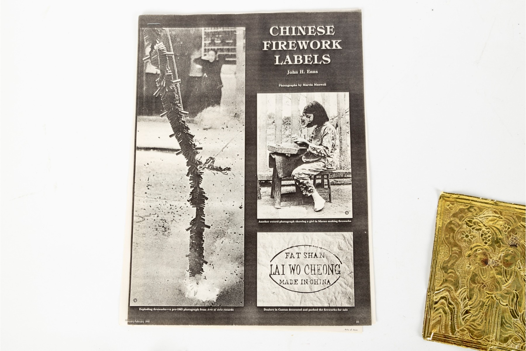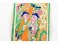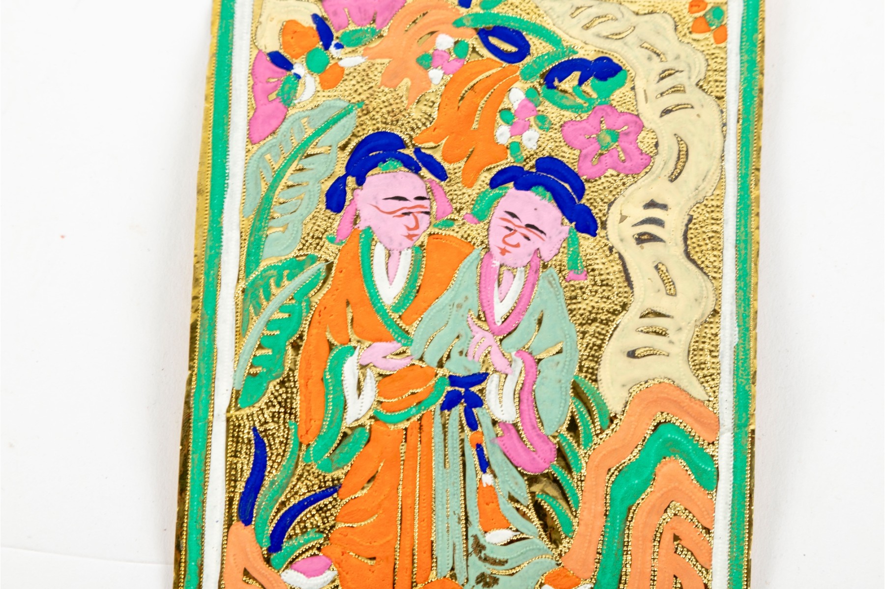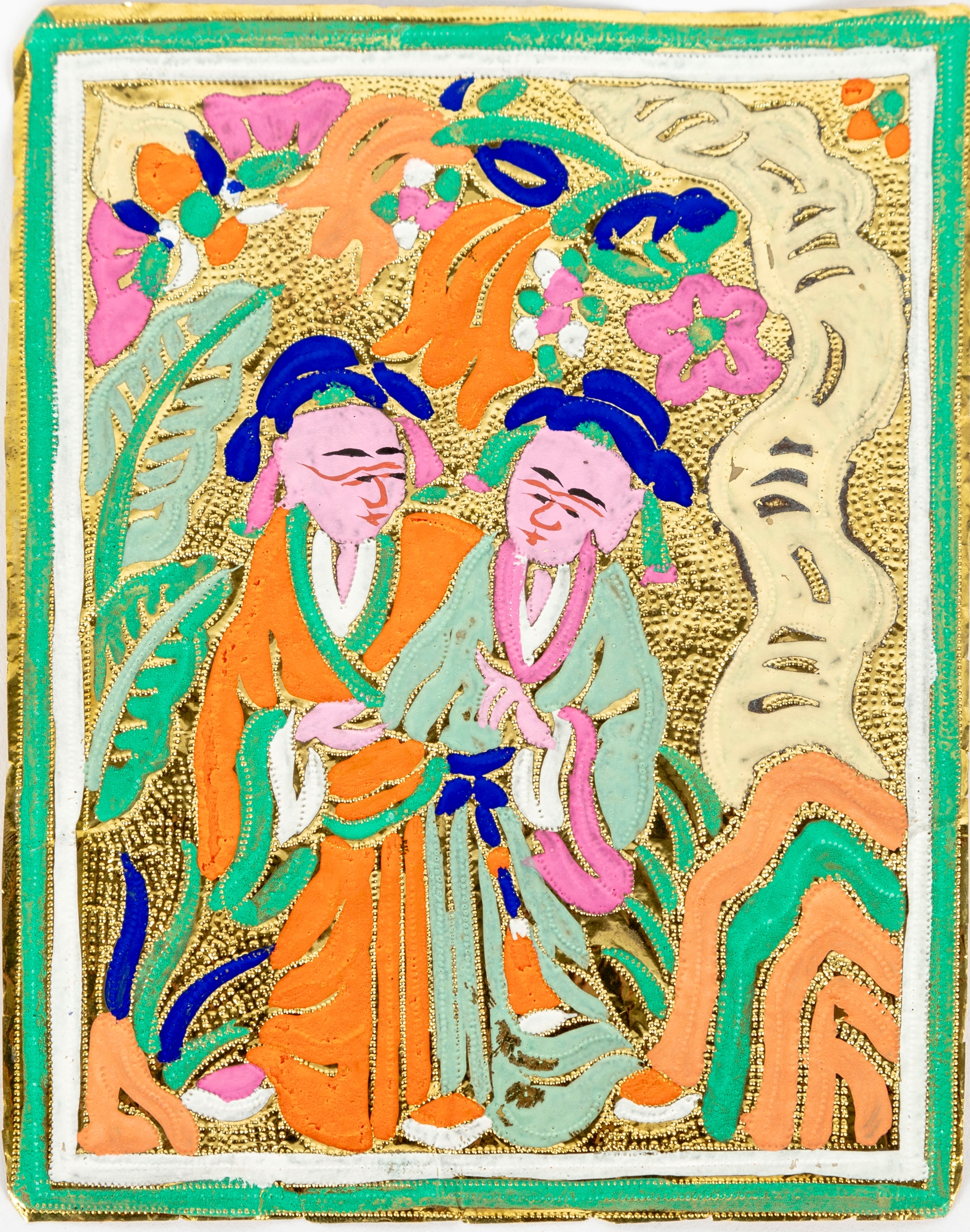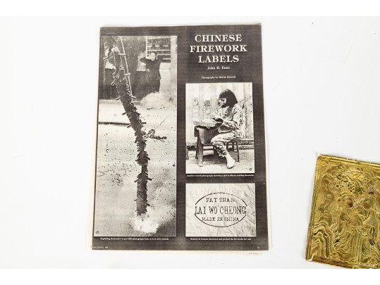 A wonderful first quarter 20th century Chinese gold foil firework label hand-painted with a scene of two figures surrounded by nature in vibrant orange, green, blue, and pink. Accompanied by a printout of "Chinese Firework Labels" by John H. Enns.