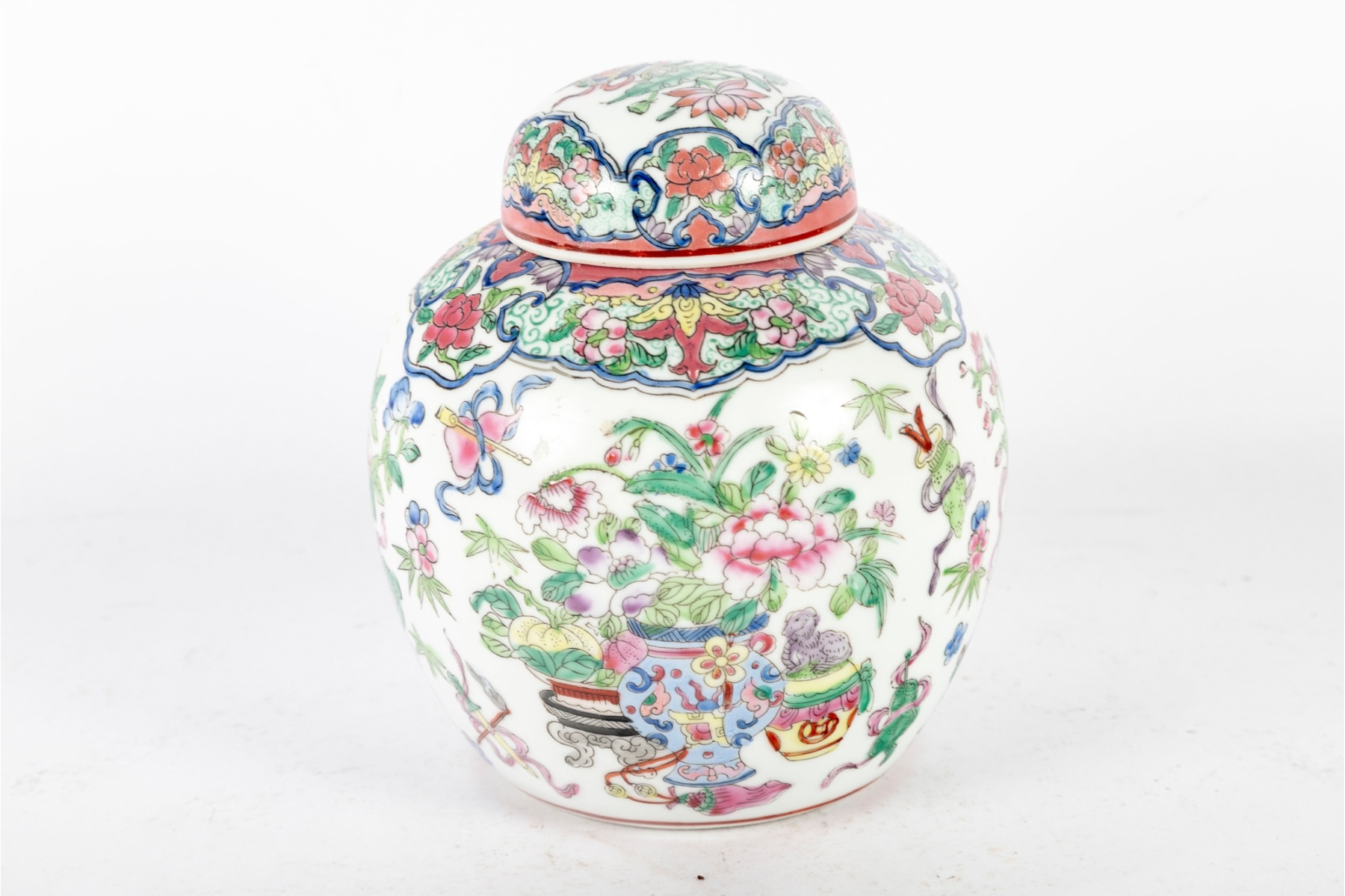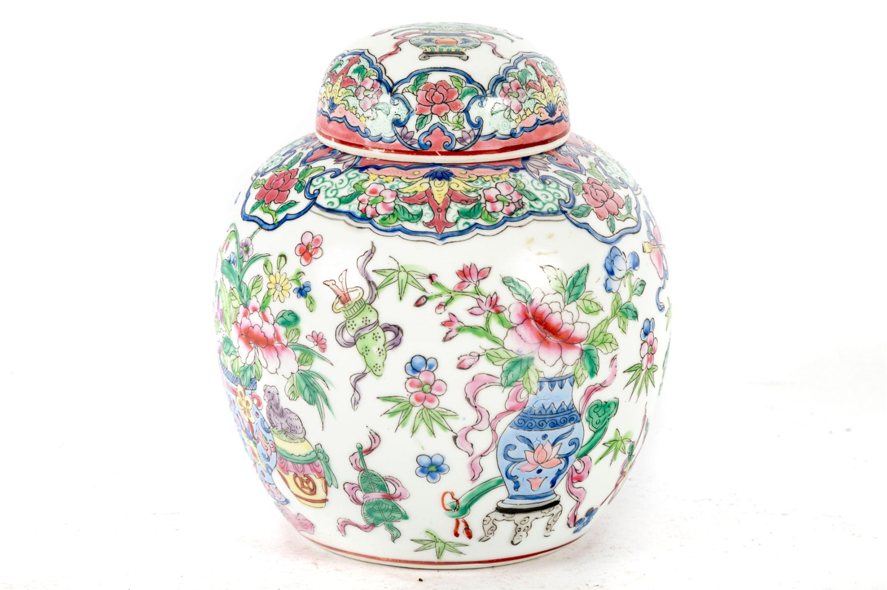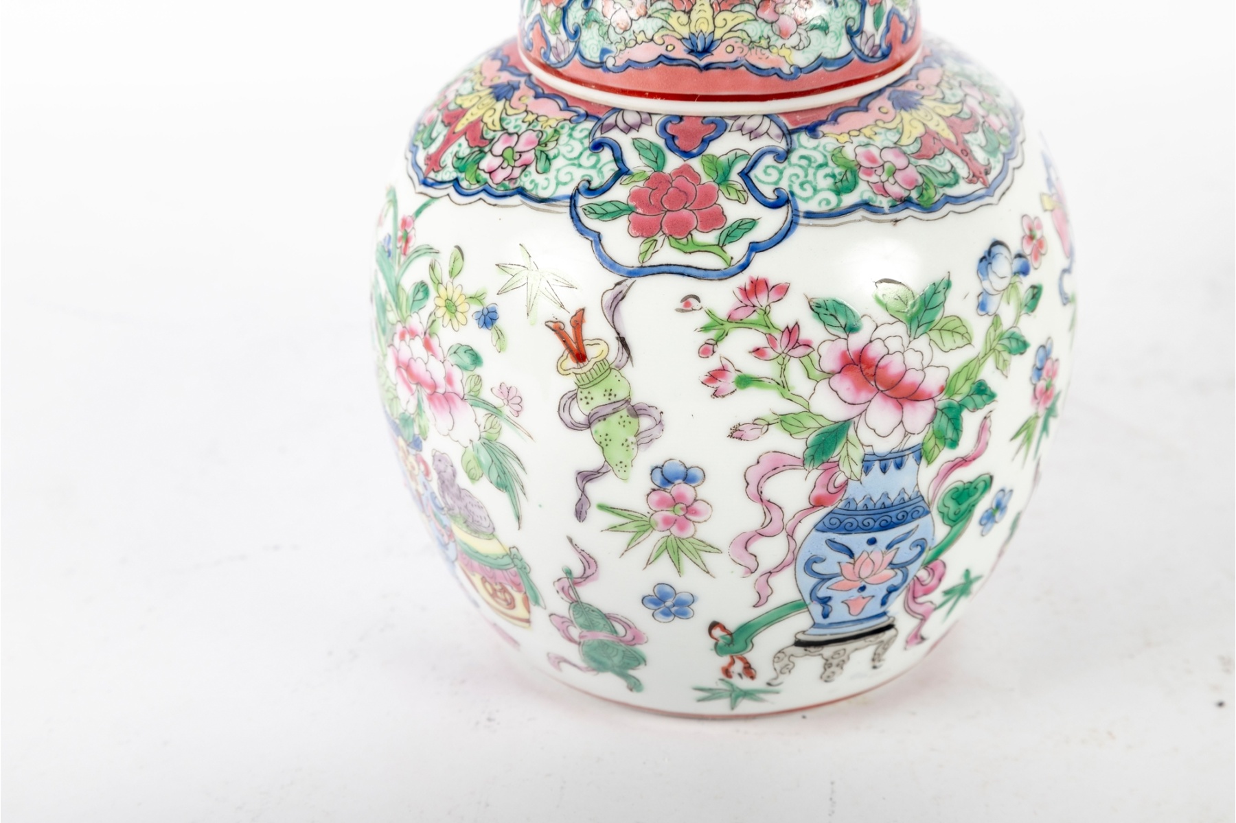 A beautifully hand-painted enamel on porcelain lidded ginger jar, made in Macau, China and displaying potted flower motifs. Reign mark located at the base.