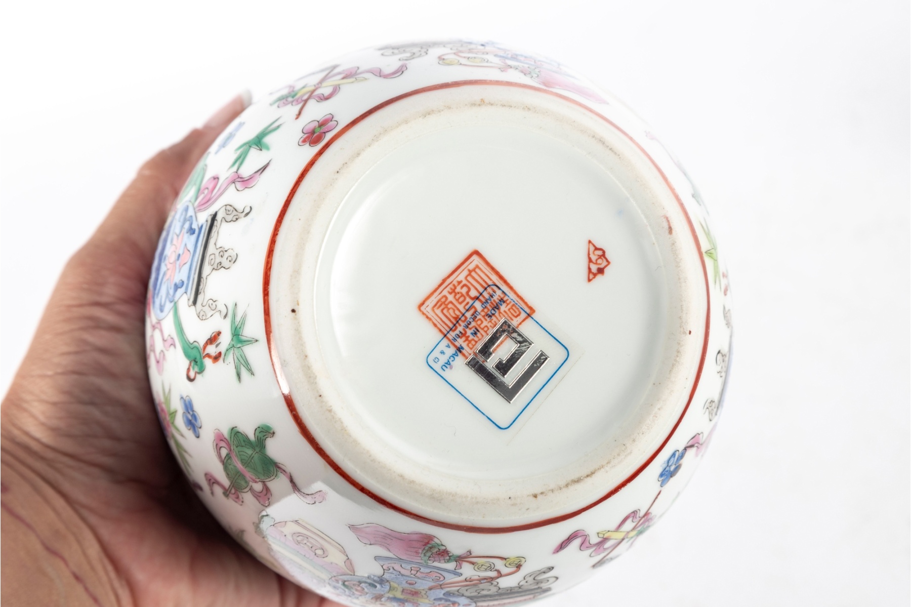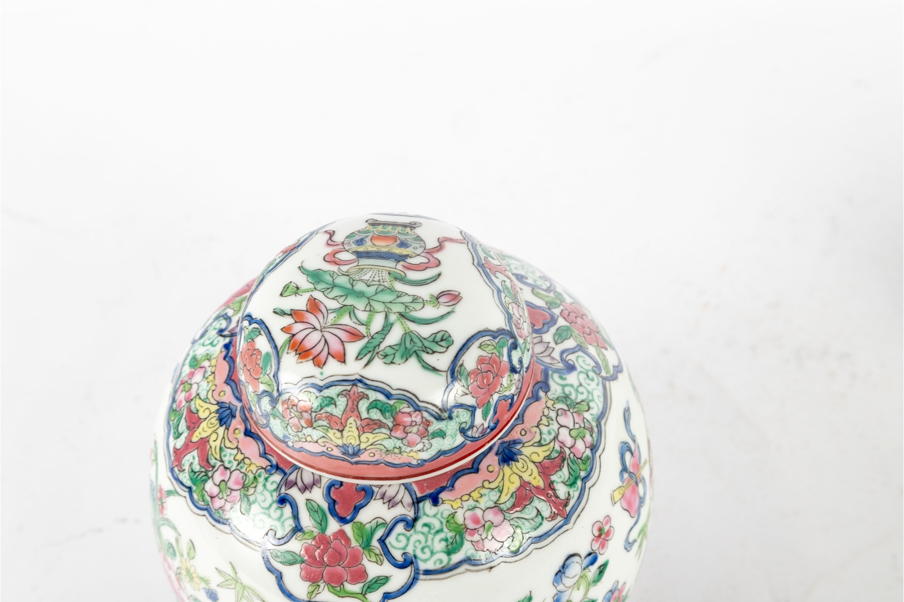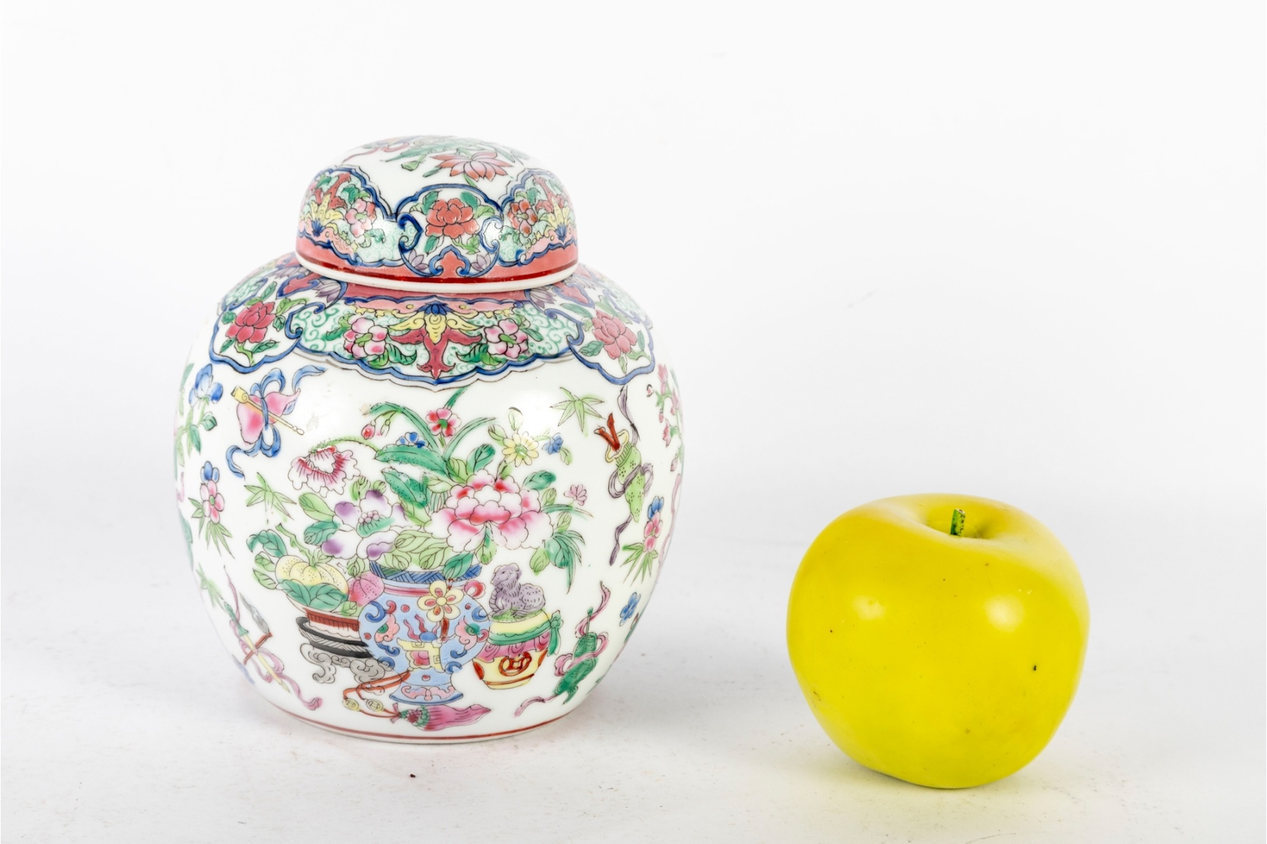 A beautifully hand-painted enamel on porcelain lidded ginger jar, made in Macau, China and displaying potted flower motifs. Reign mark located at the base.
