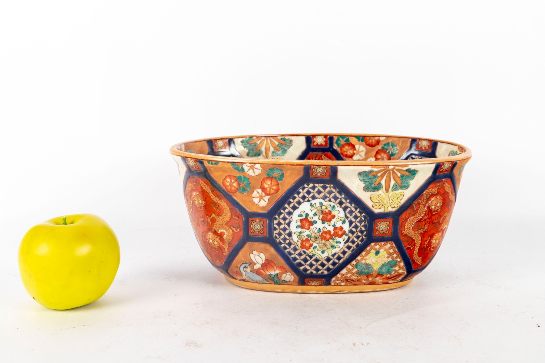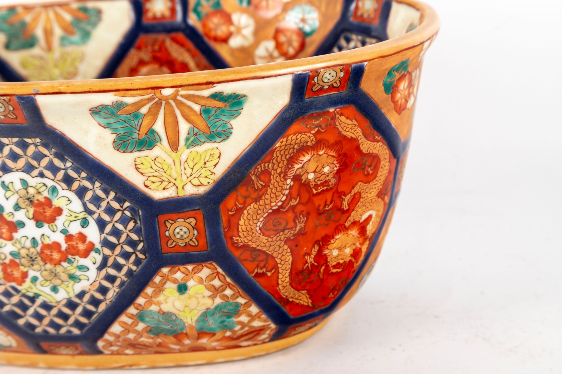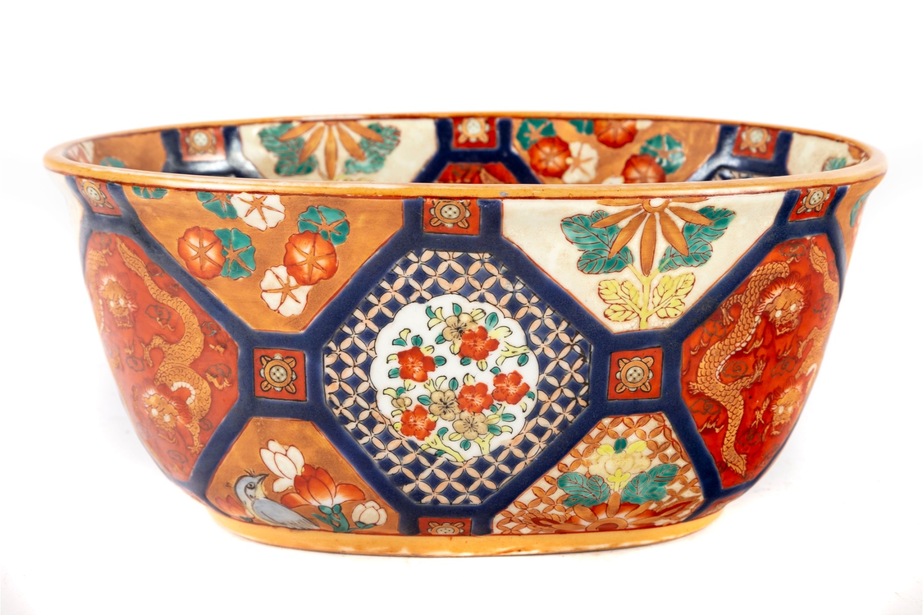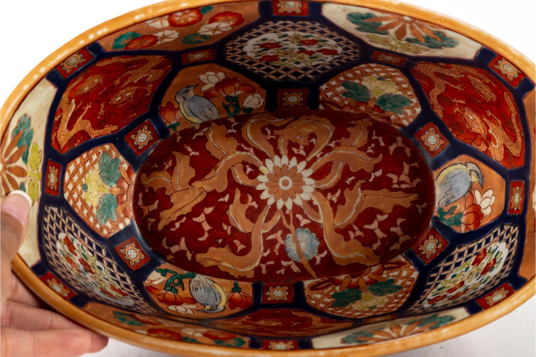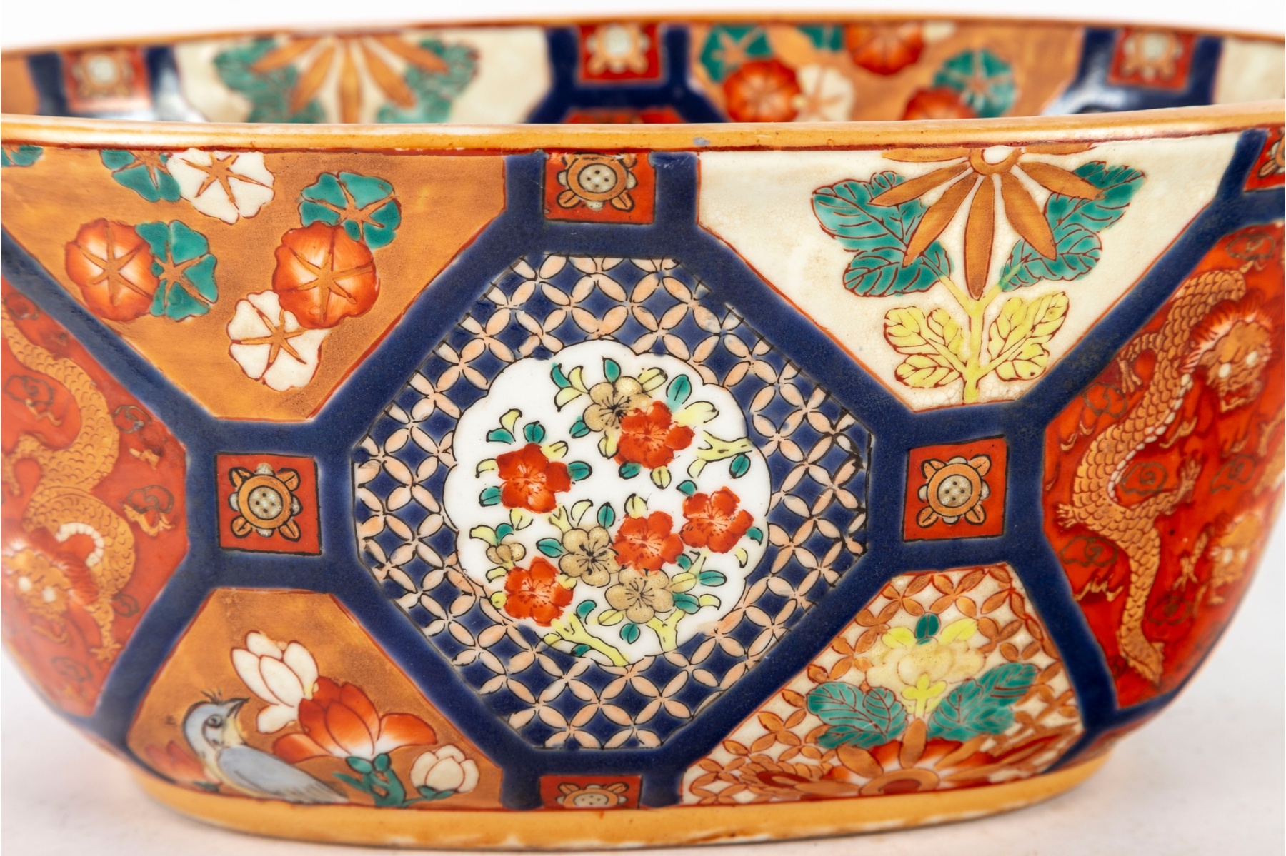 Vibrant Chinese Imari-style porcelain bowl richly decorated with alternating panels of dragons, birds, and floral medallions in tones of iron red, cobalt blue, green, and gilt highlights. The interior features an elaborate central floral medallion surrounded by geometric latticework and stylized botanical motifs.