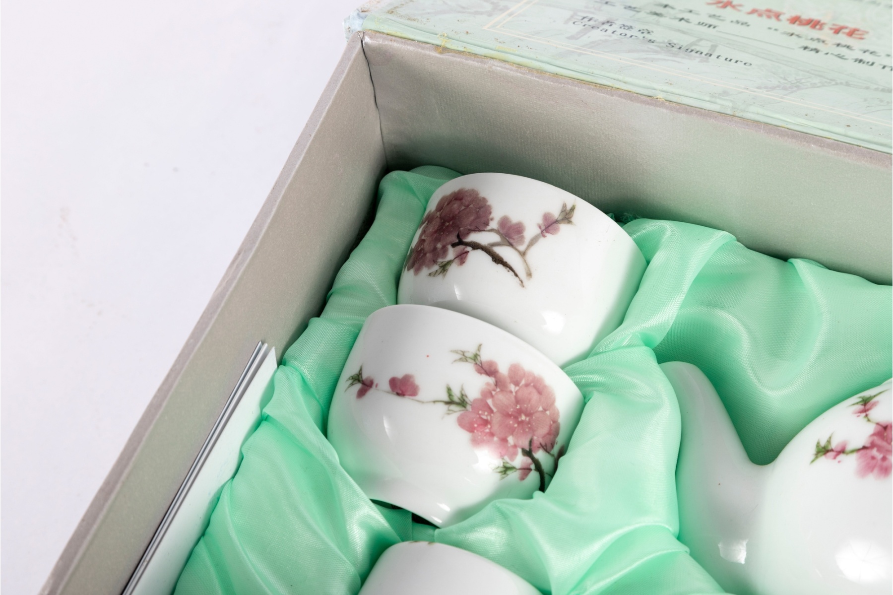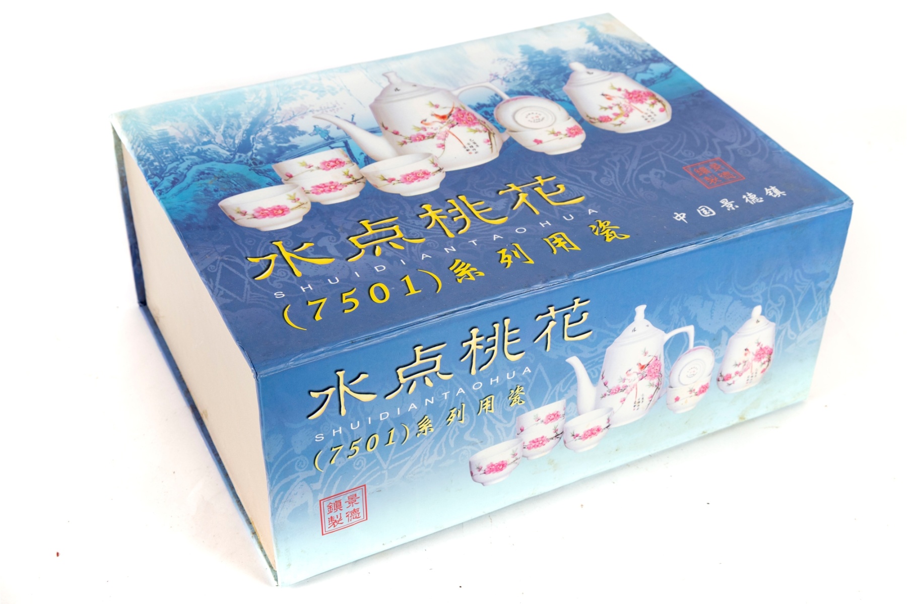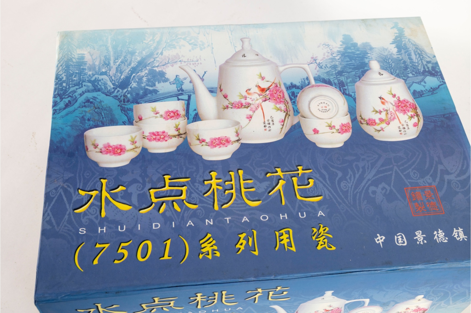 Beautiful boxed Chinese porcelain tea set titled Shuidian Taohua (7501) from Jingdezhen, featuring delicate hand-painted pink cherry blossoms and birds on white porcelain. The set includes a teapot, lidded sugar jar, and six teacups, all presented in a fitted satin-lined gift box with accompanying certificate and documentation.