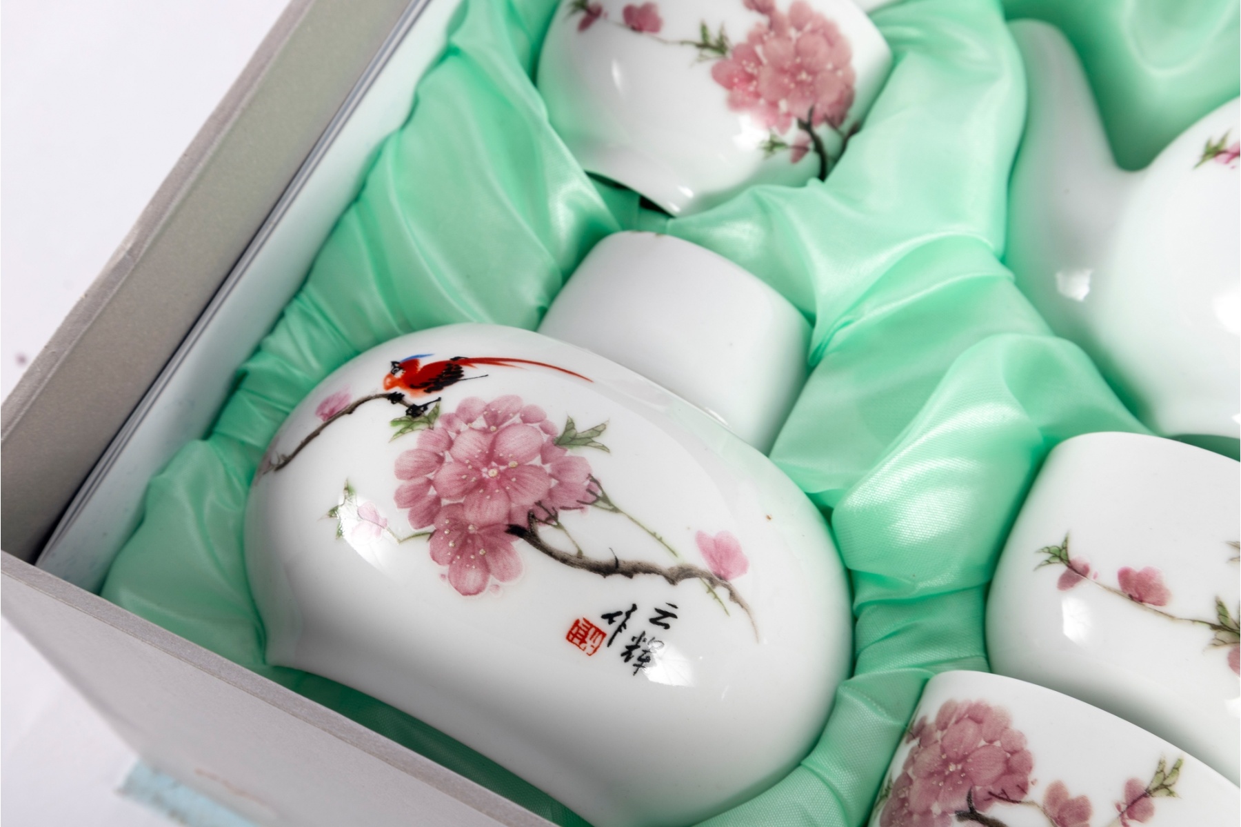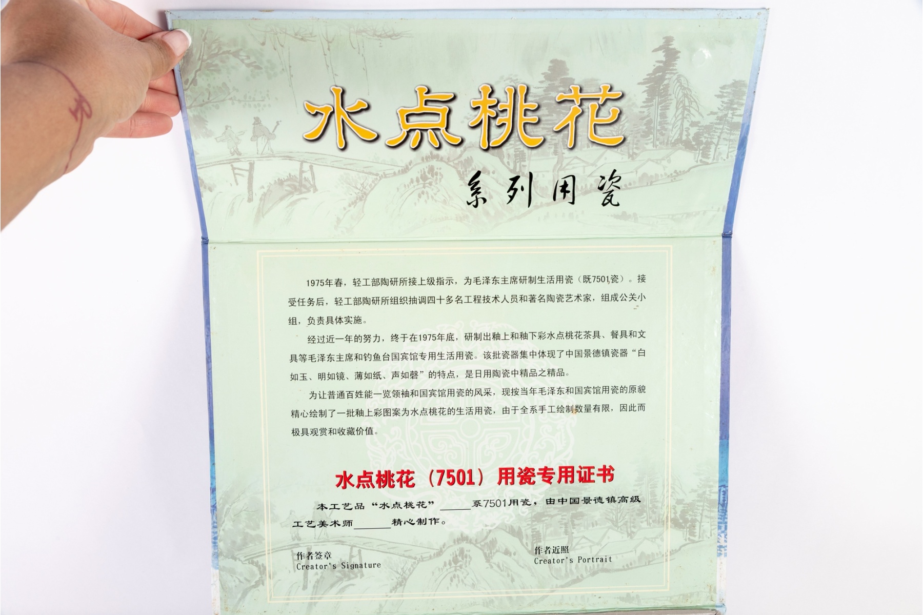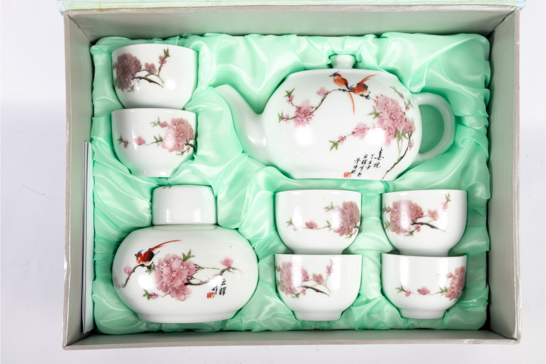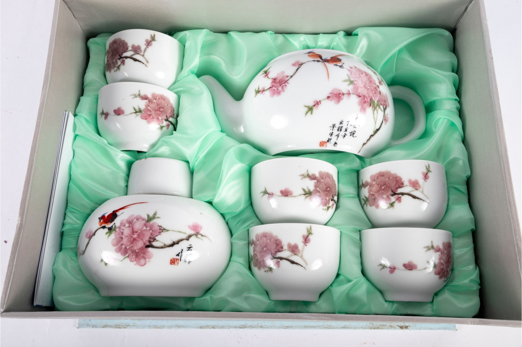 Beautiful boxed Chinese porcelain tea set titled Shuidian Taohua (7501) from Jingdezhen, featuring delicate hand-painted pink cherry blossoms and birds on white porcelain. The set includes a teapot, lidded sugar jar, and six teacups, all presented in a fitted satin-lined gift box with accompanying certificate and documentation.