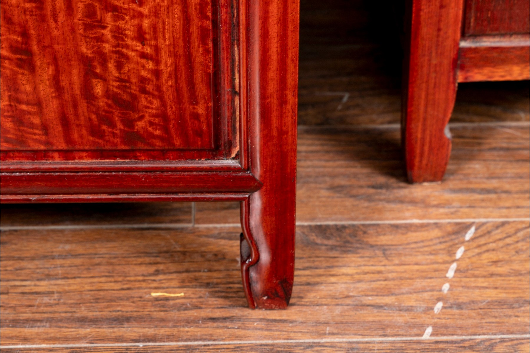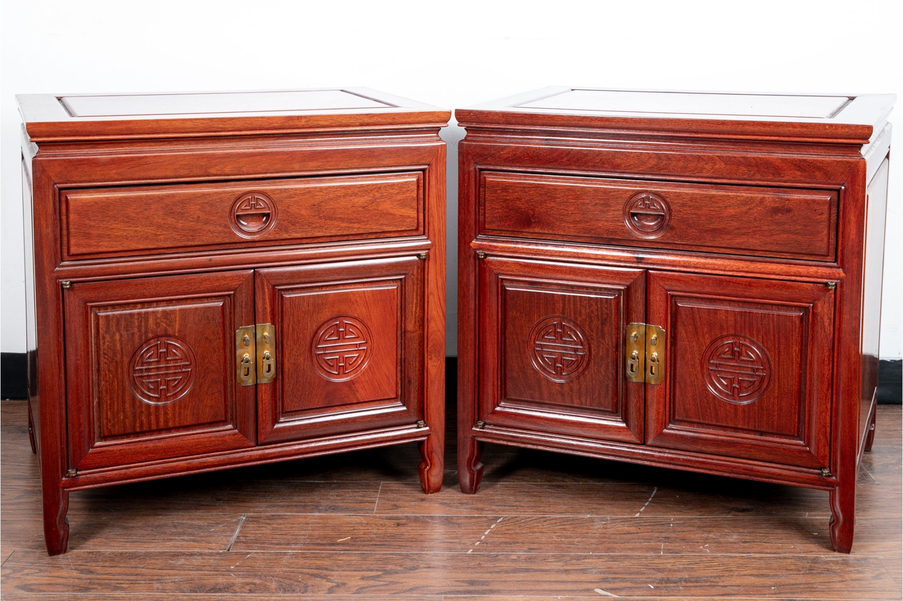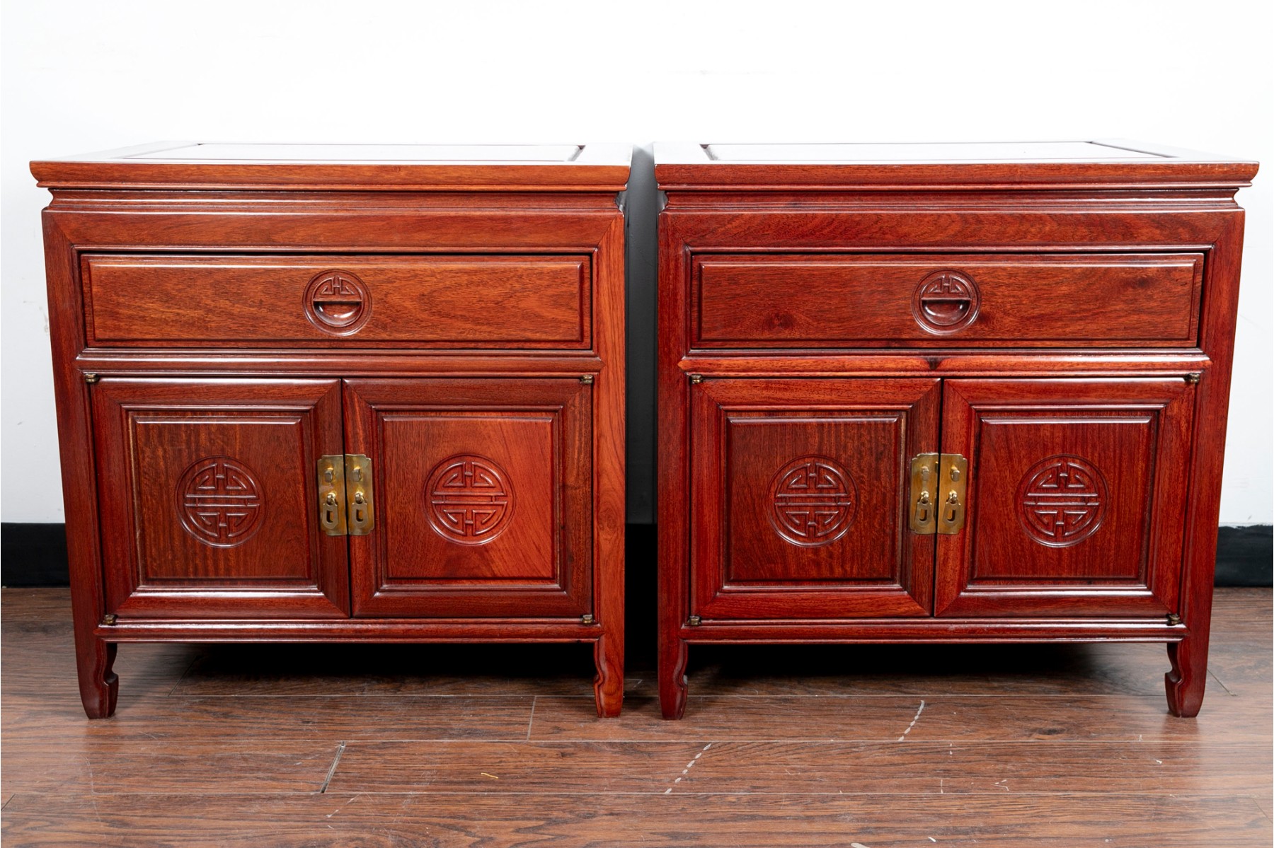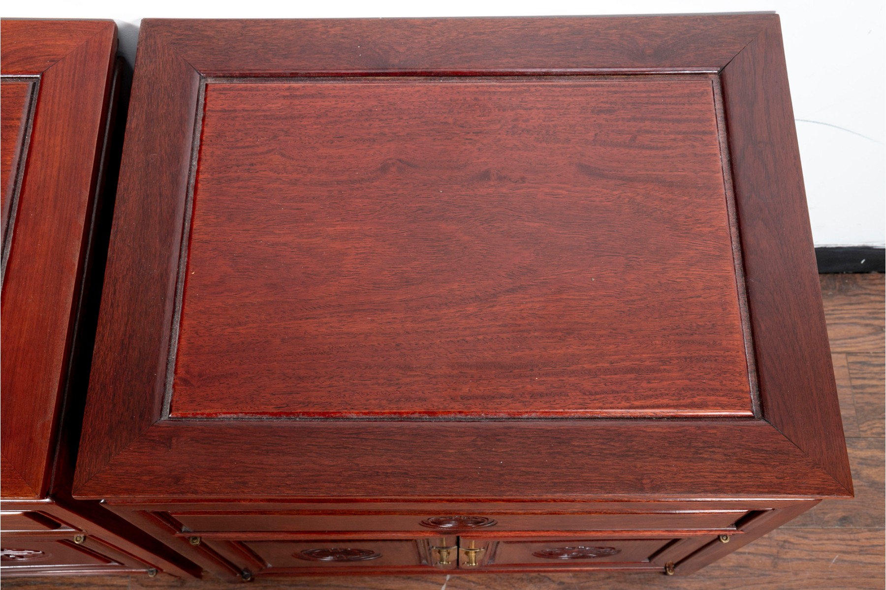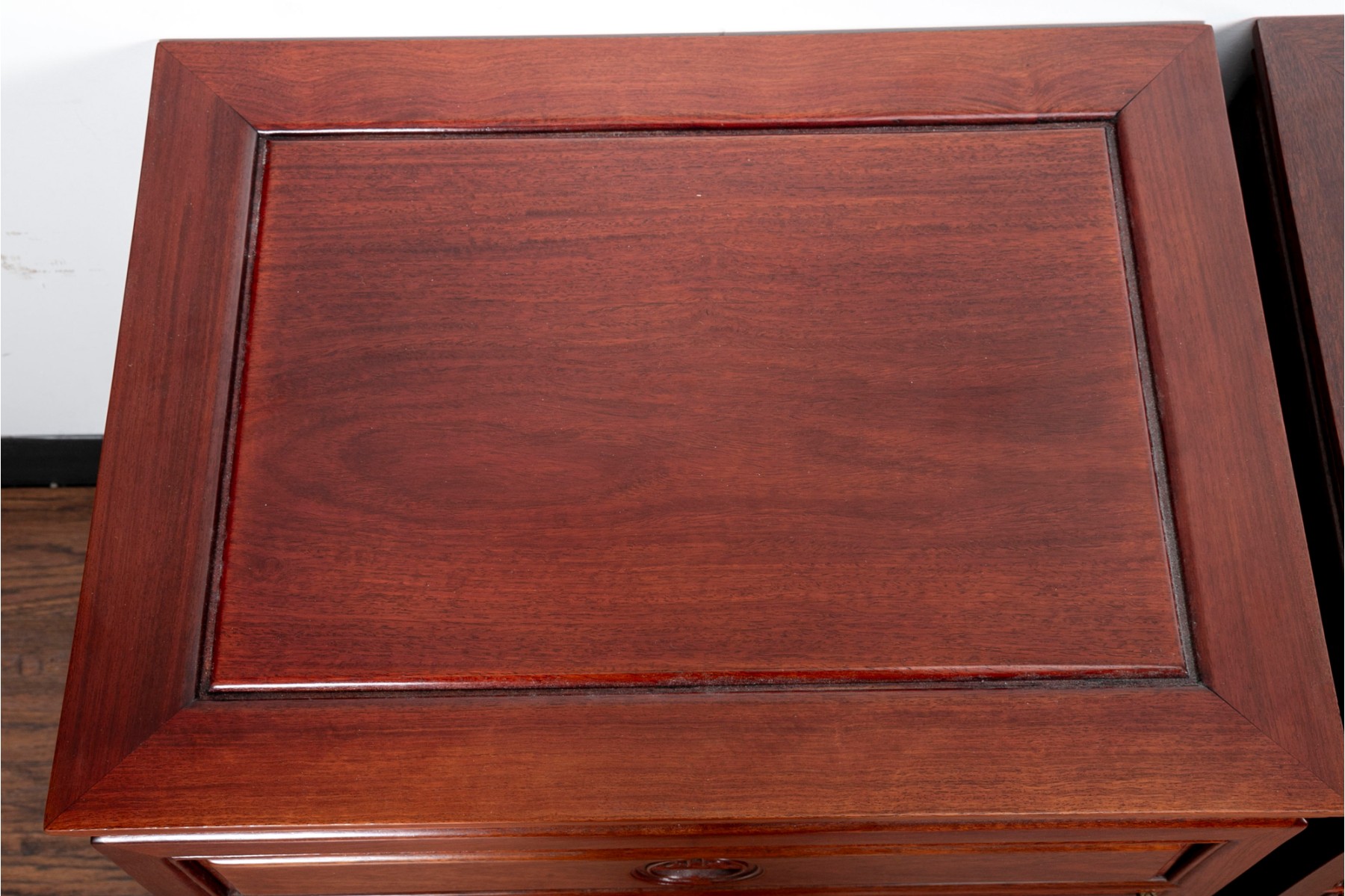 A pair of Chinese night stands in a gorgeous rosewood finish, displaying recessed borders on rectangular tops leading to single drawers over double-door cabinets with spacious interiors.