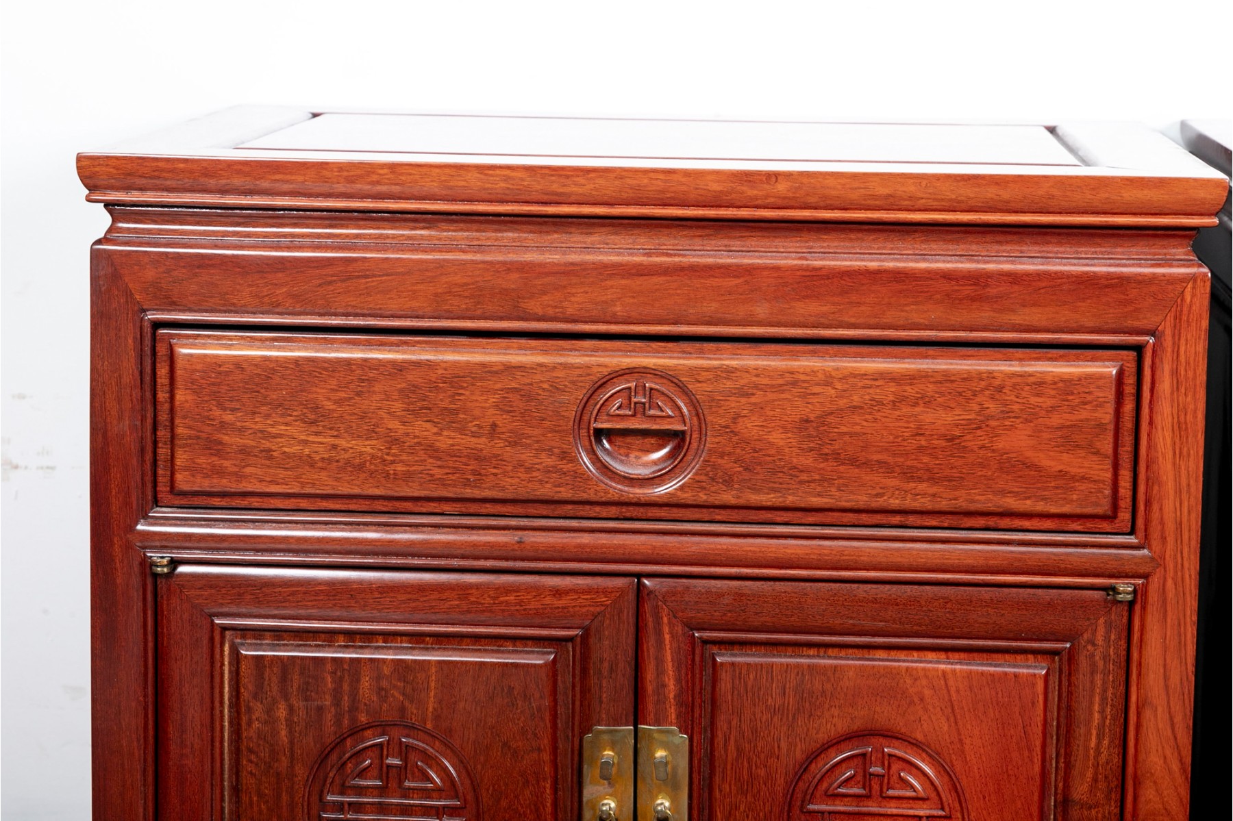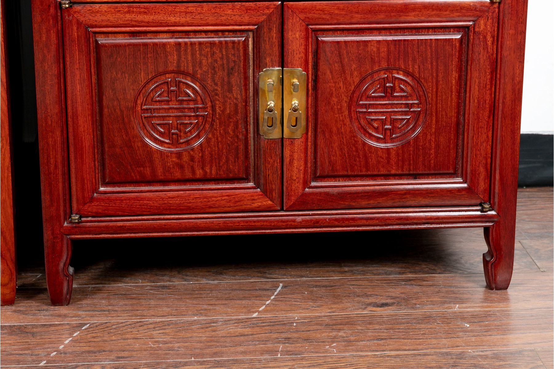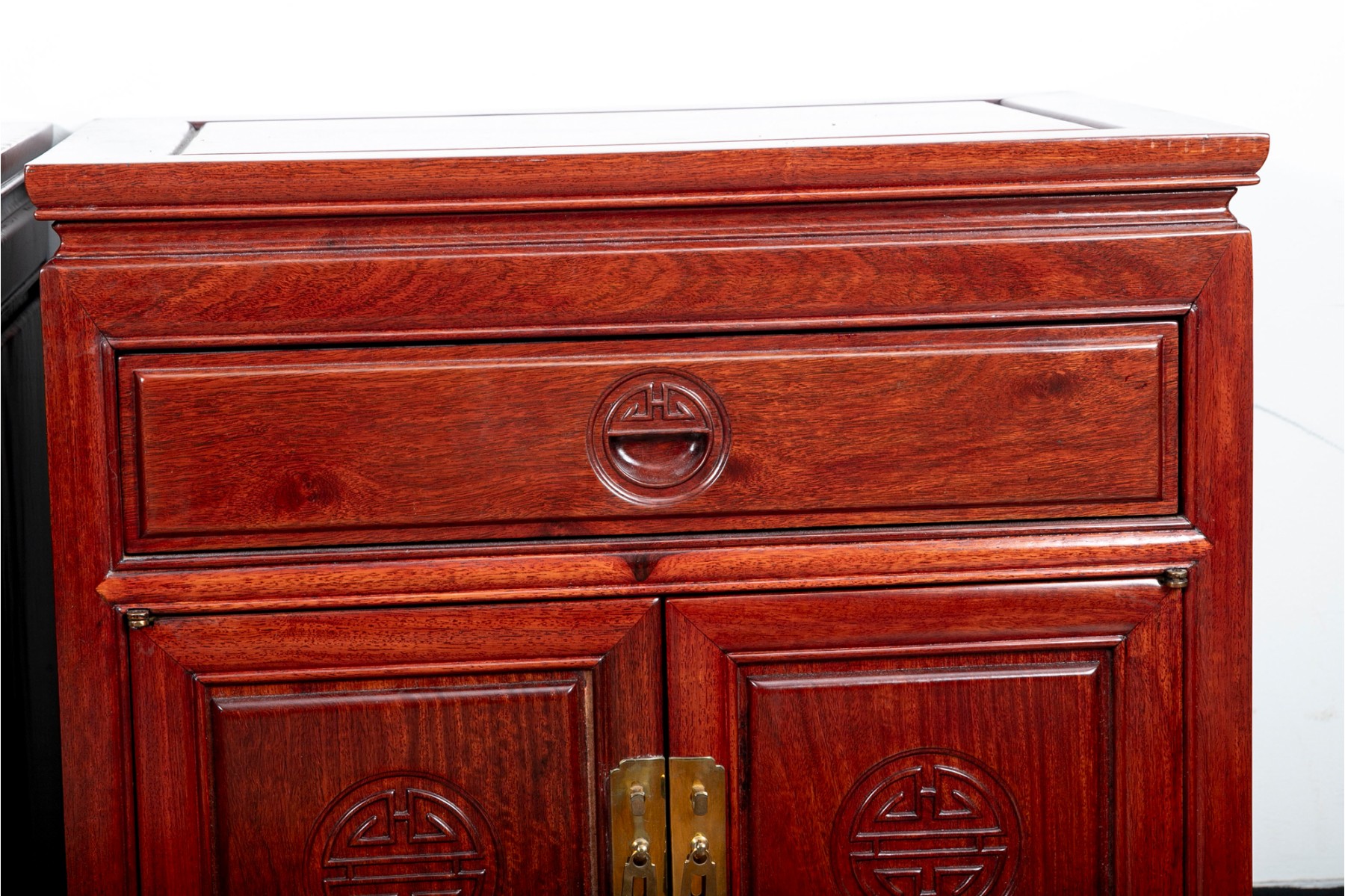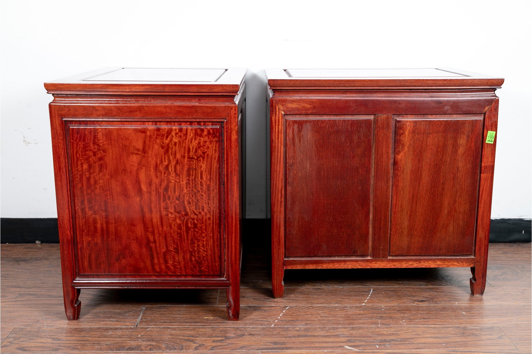 A pair of Chinese night stands in a gorgeous rosewood finish, displaying recessed borders on rectangular tops leading to single drawers over double-door cabinets with spacious interiors.