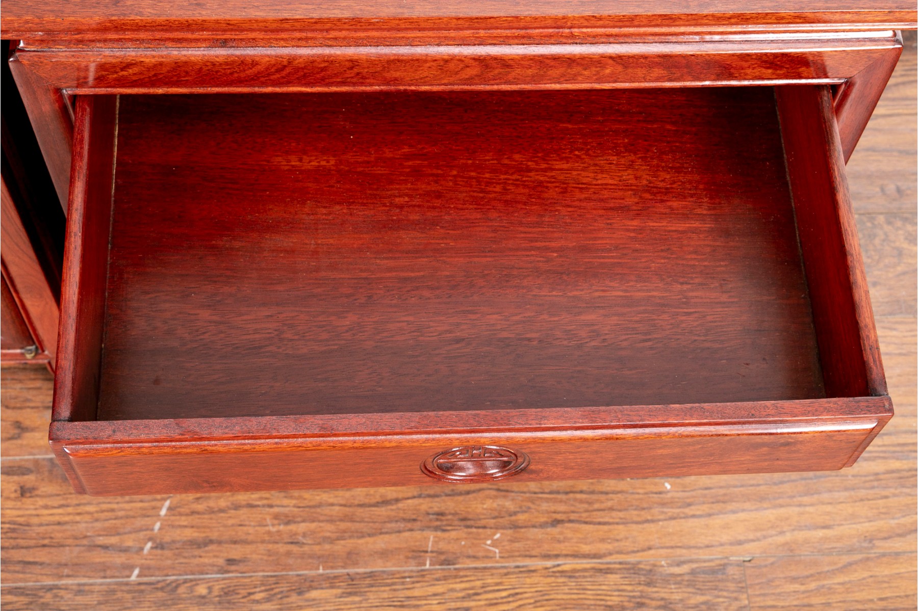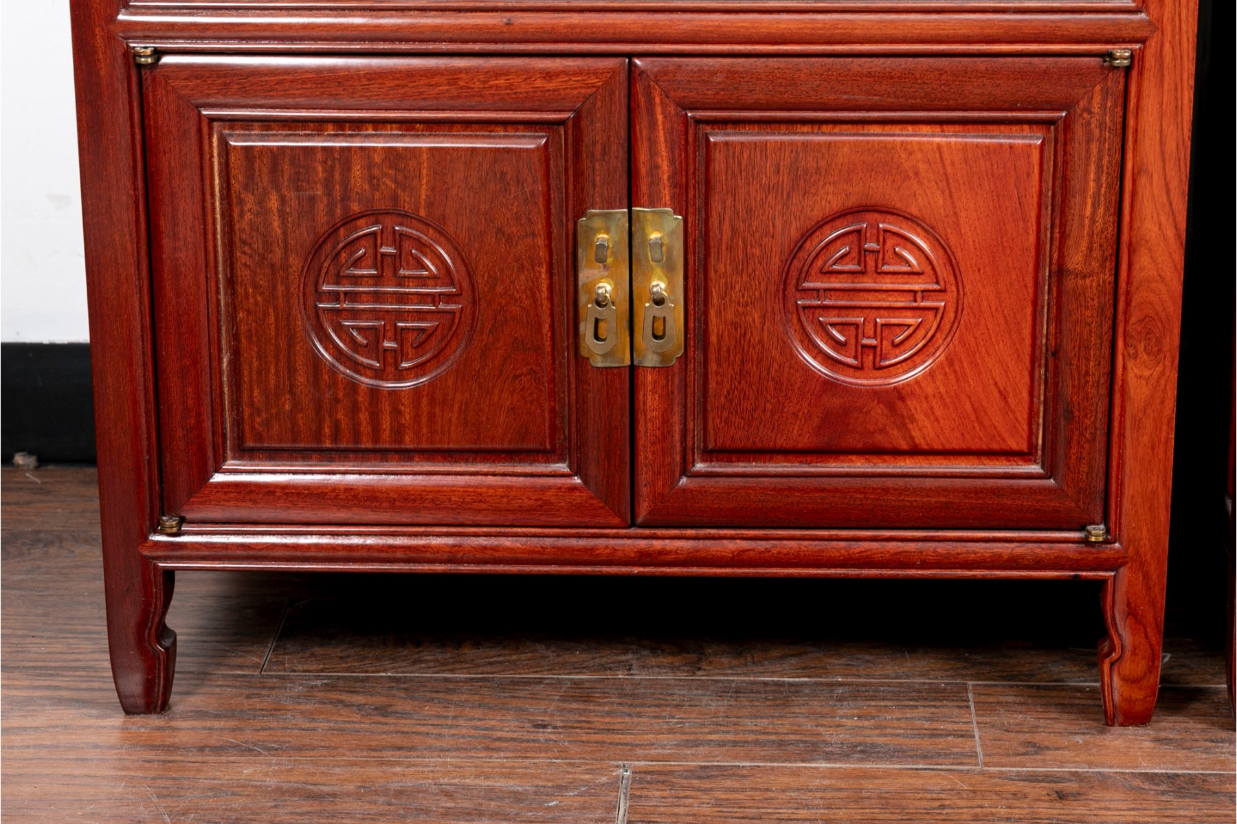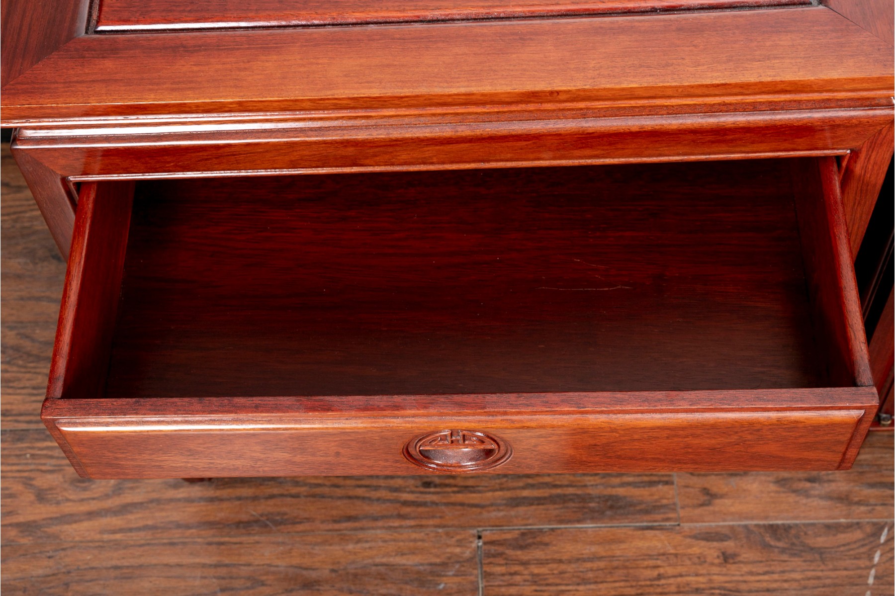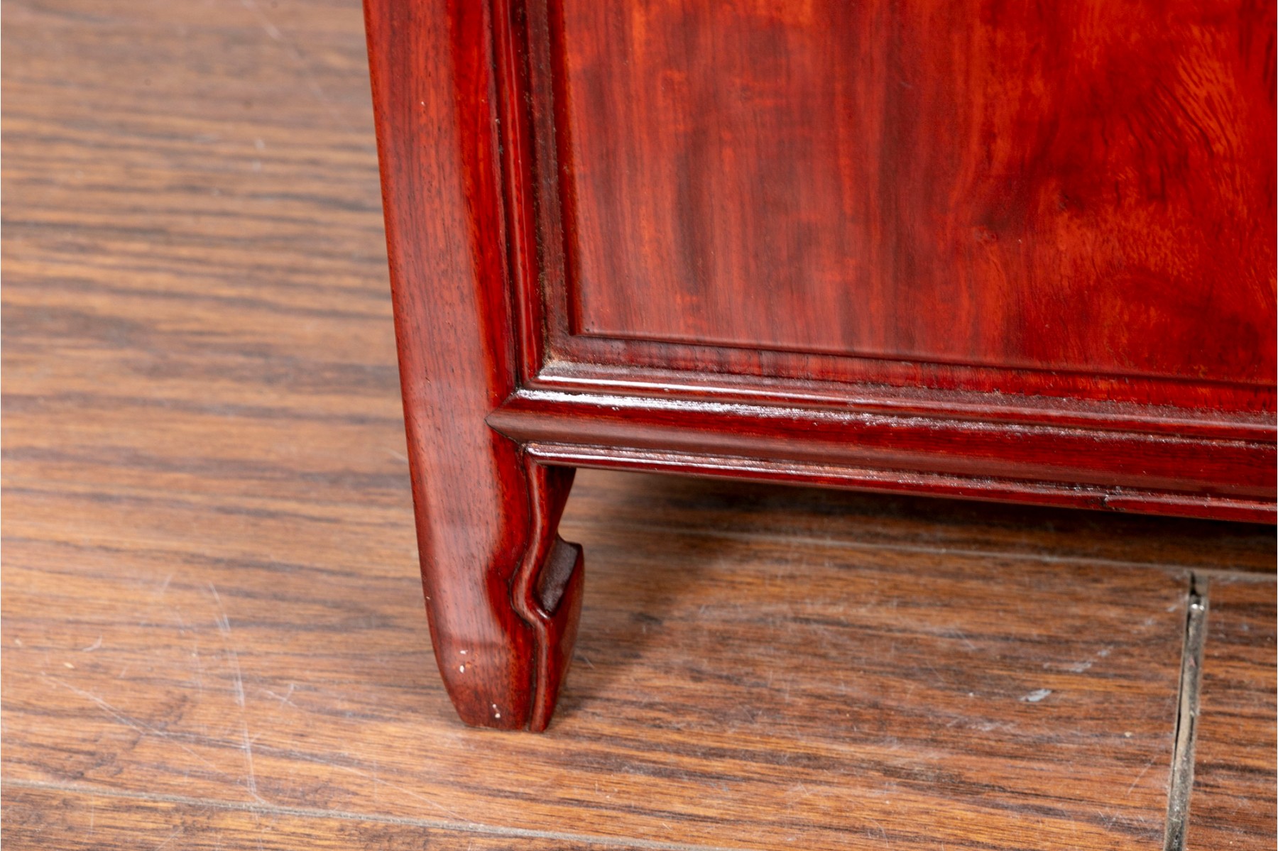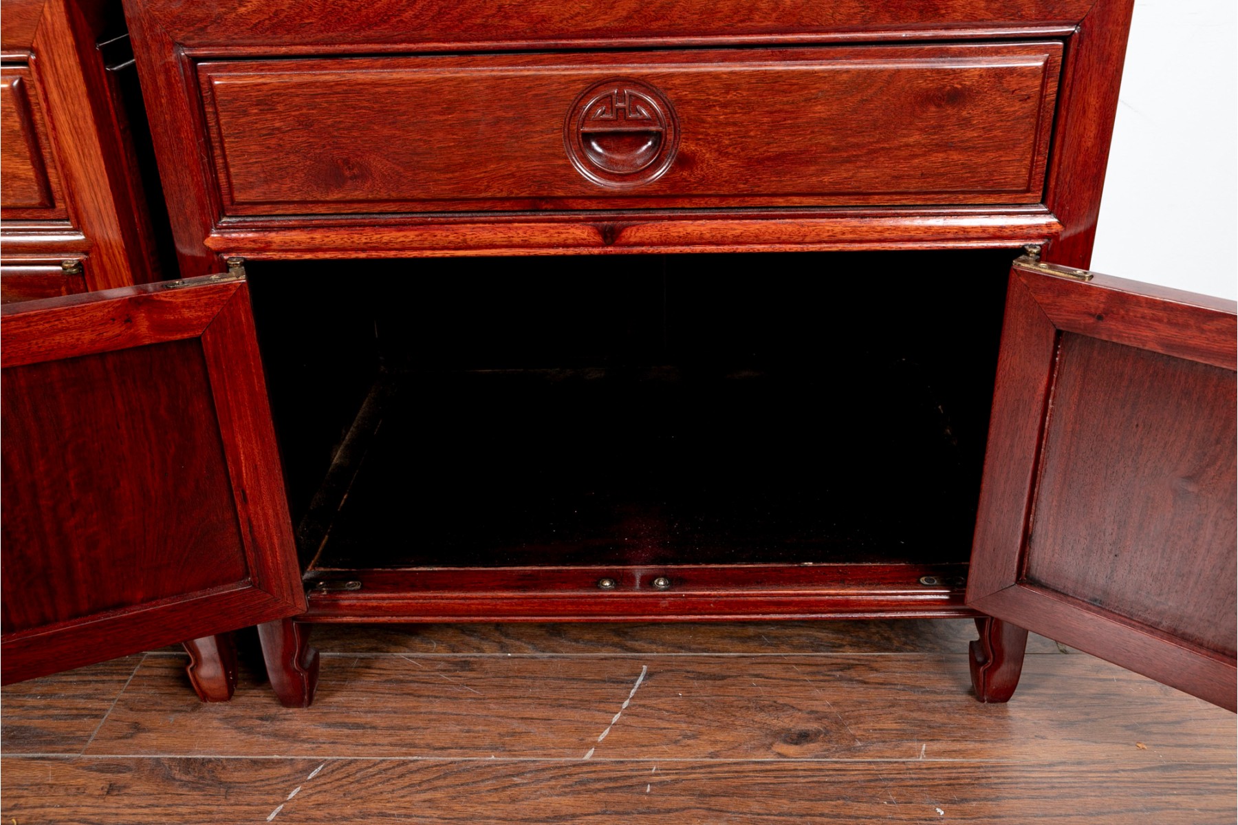 A pair of Chinese night stands in a gorgeous rosewood finish, displaying recessed borders on rectangular tops leading to single drawers over double-door cabinets with spacious interiors.