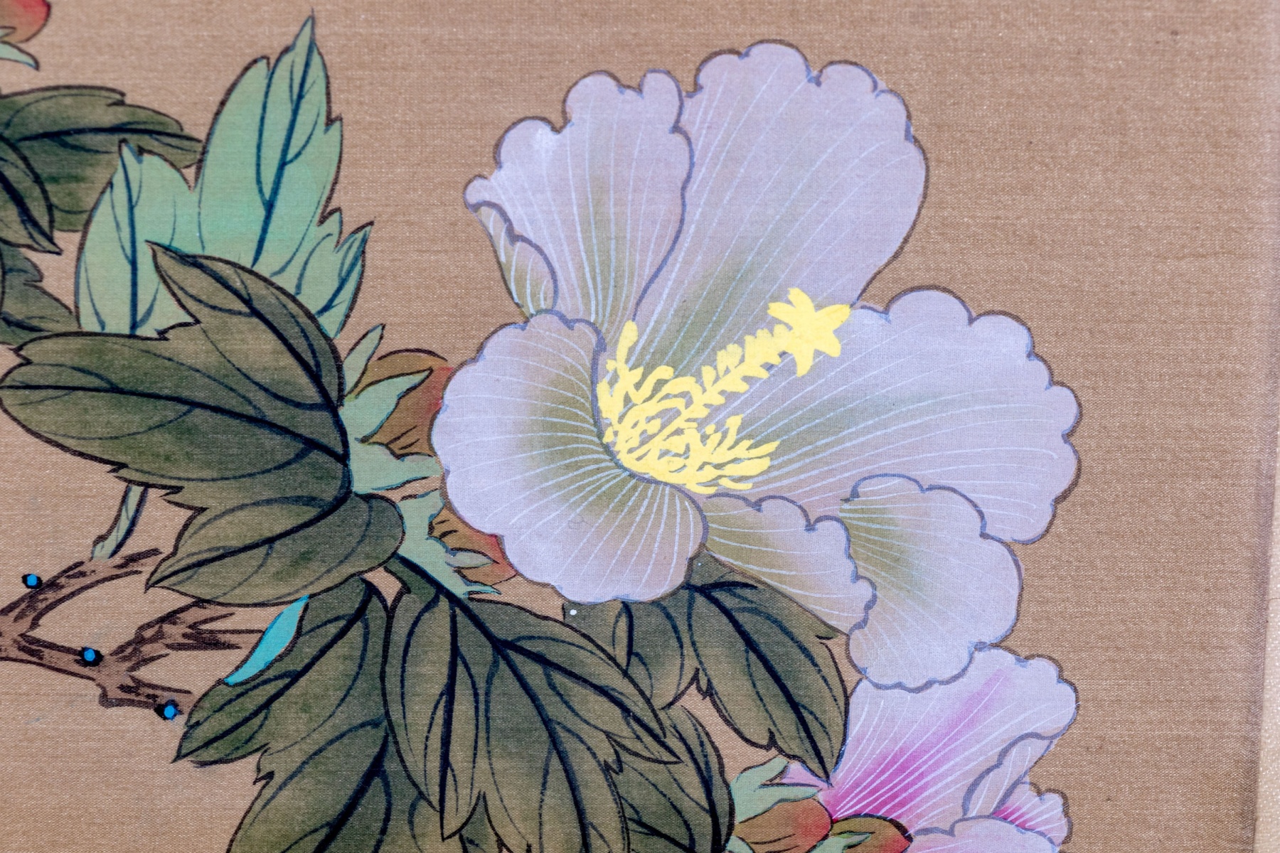 A beautiful Chinese painting on silk depicting a classic bird and flower scene with an impressive, vibrant blue bird with a mint green head and black wings perched on a lush branch of pink and white flowers with green leaves surrounded by small insects. Inscription and seal at the upper left.