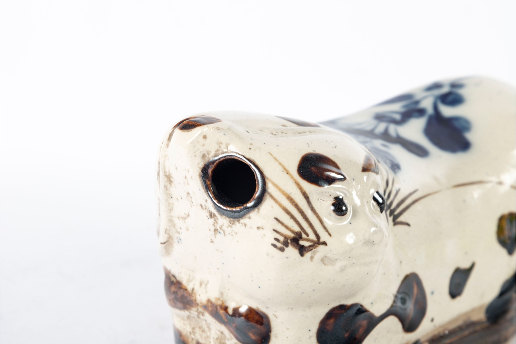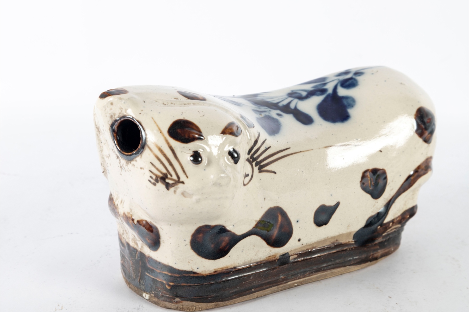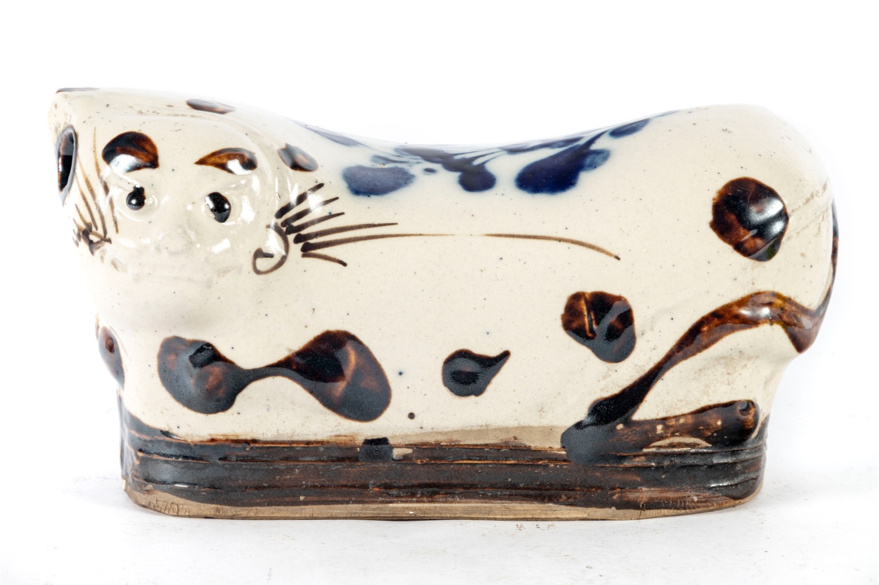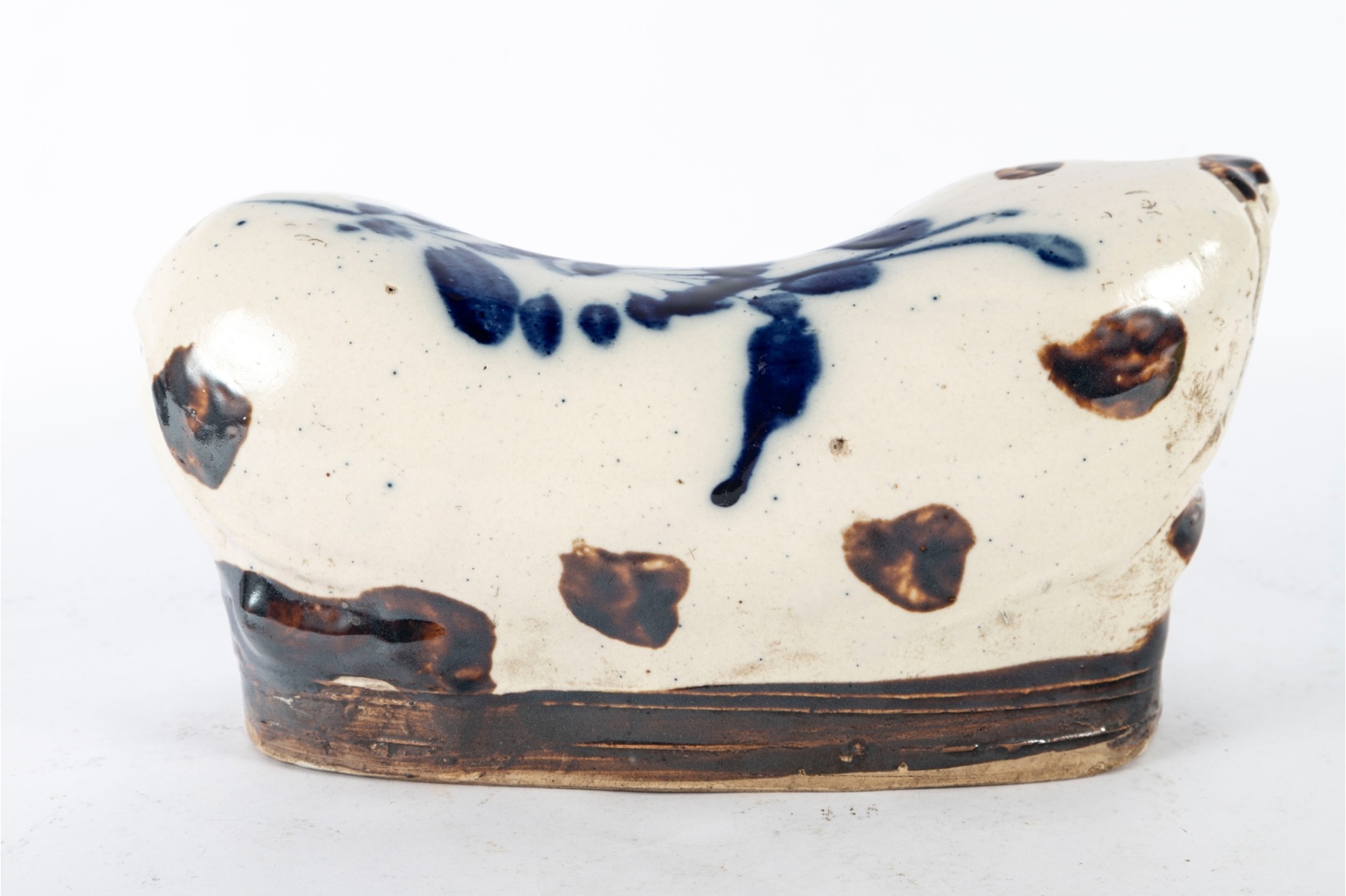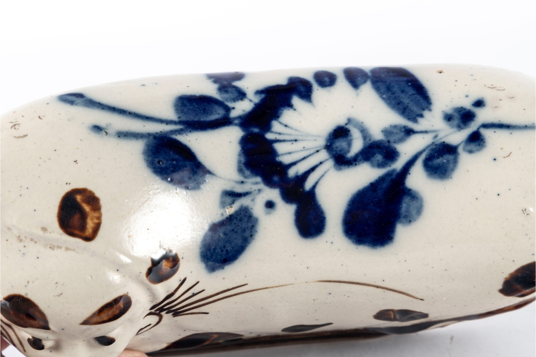 Charming hand-crafted porcelain cat pillow, dating to the early 20th century. This traditional Chinese headrest features a whimsical reclining cat form, decorated in a white glaze with brown and cobalt blue painted accents. The piece exhibits fine hand-painted detailing to the face and body, typical of folk ceramic artistry.