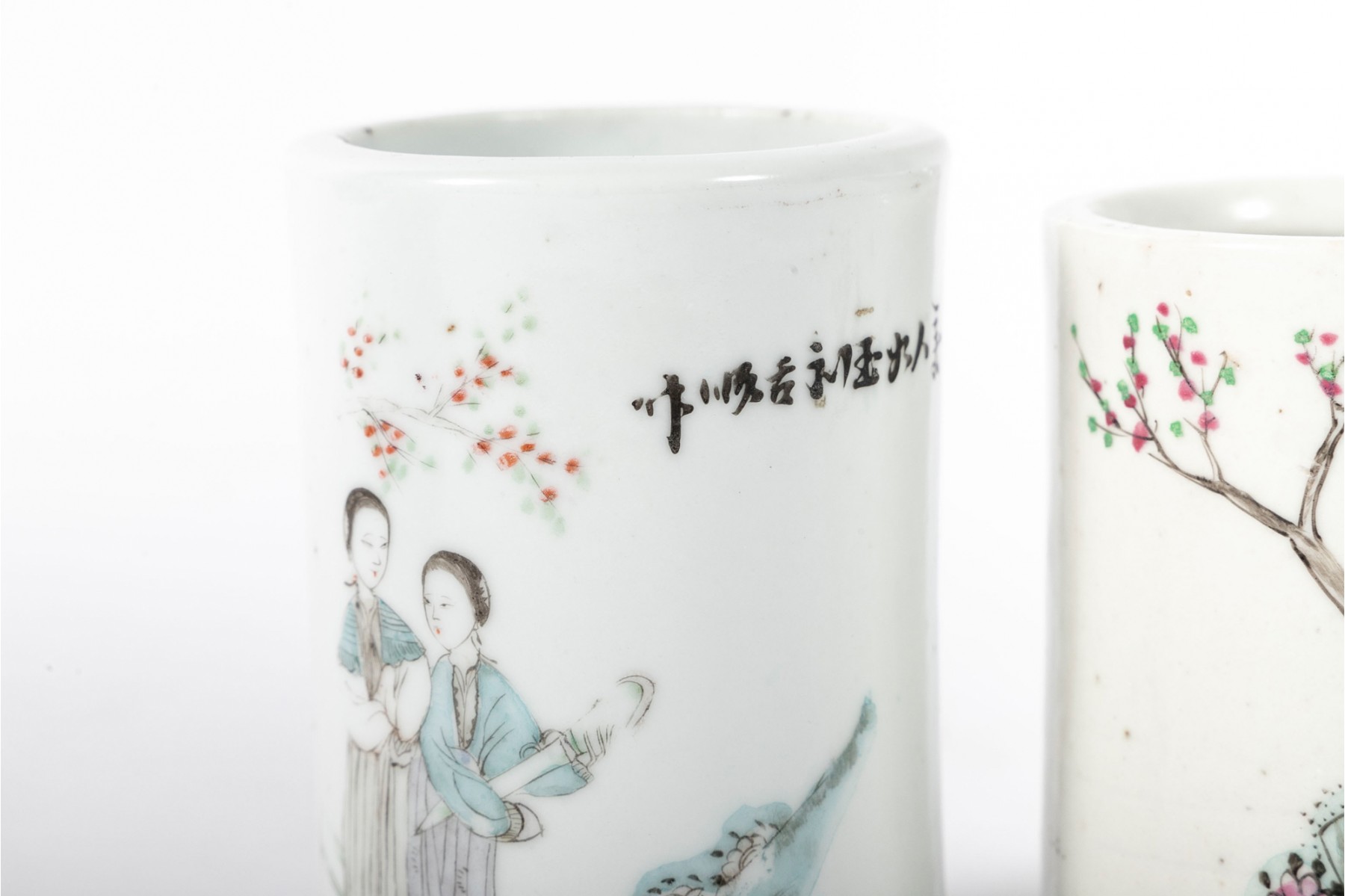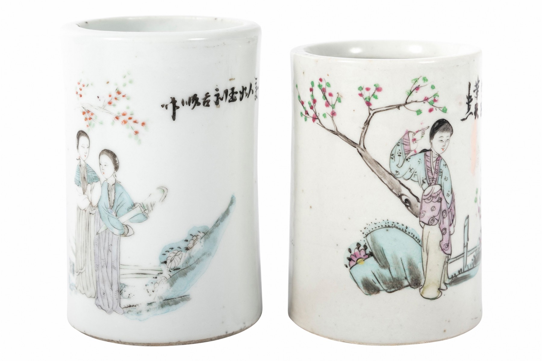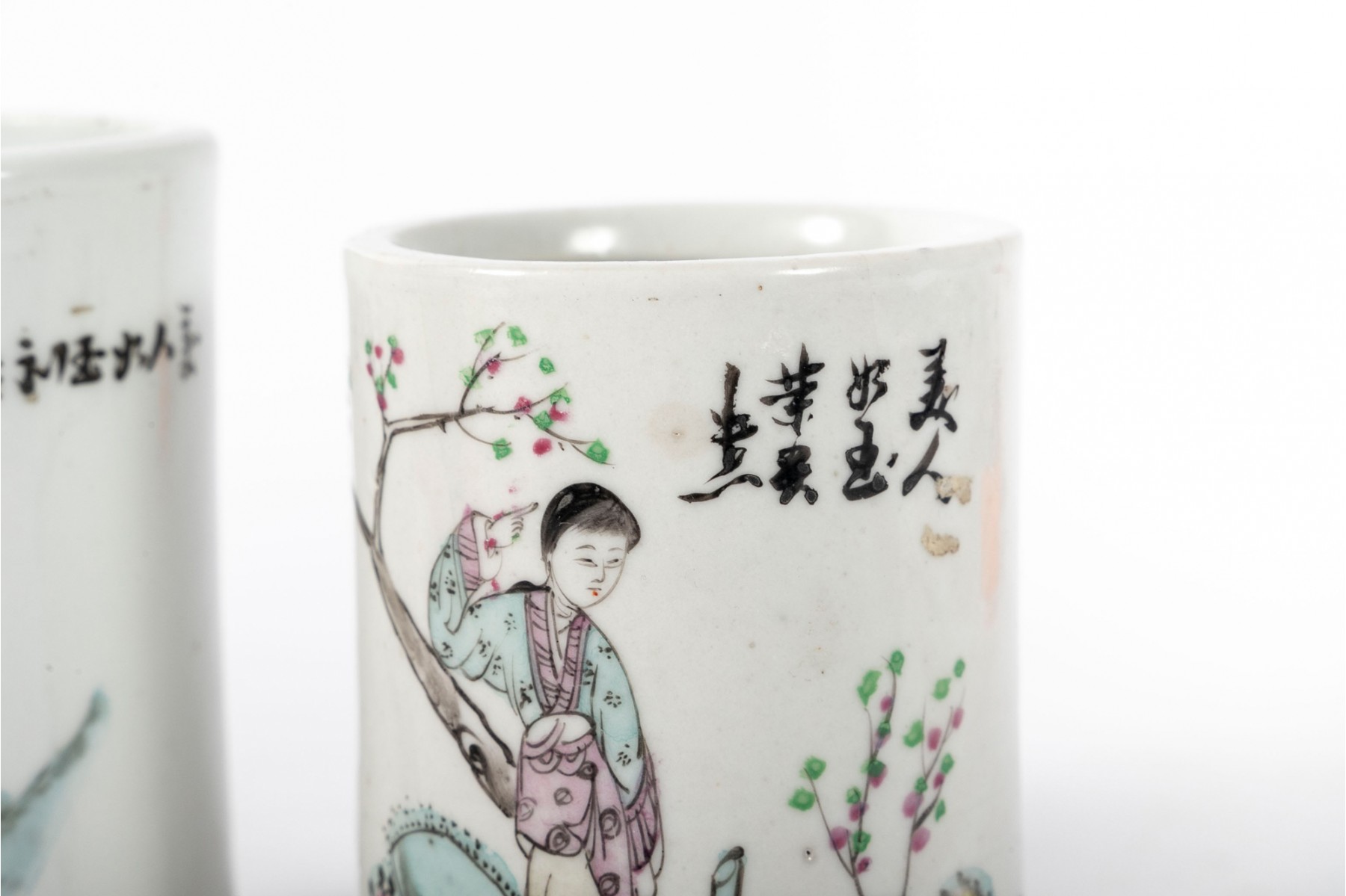 A fabulous duo of Chinese porcelain brush pots or vases in cylindrical form, hand-decorated with famille rose scenes of women in nature. The shorter cup displays a single woman in blue, pink, and yellow; standing under a flowering tree with pale blue rocky outcrops along a bamboo fence. The taller cup features two women enjoying time together under a flowering tree.