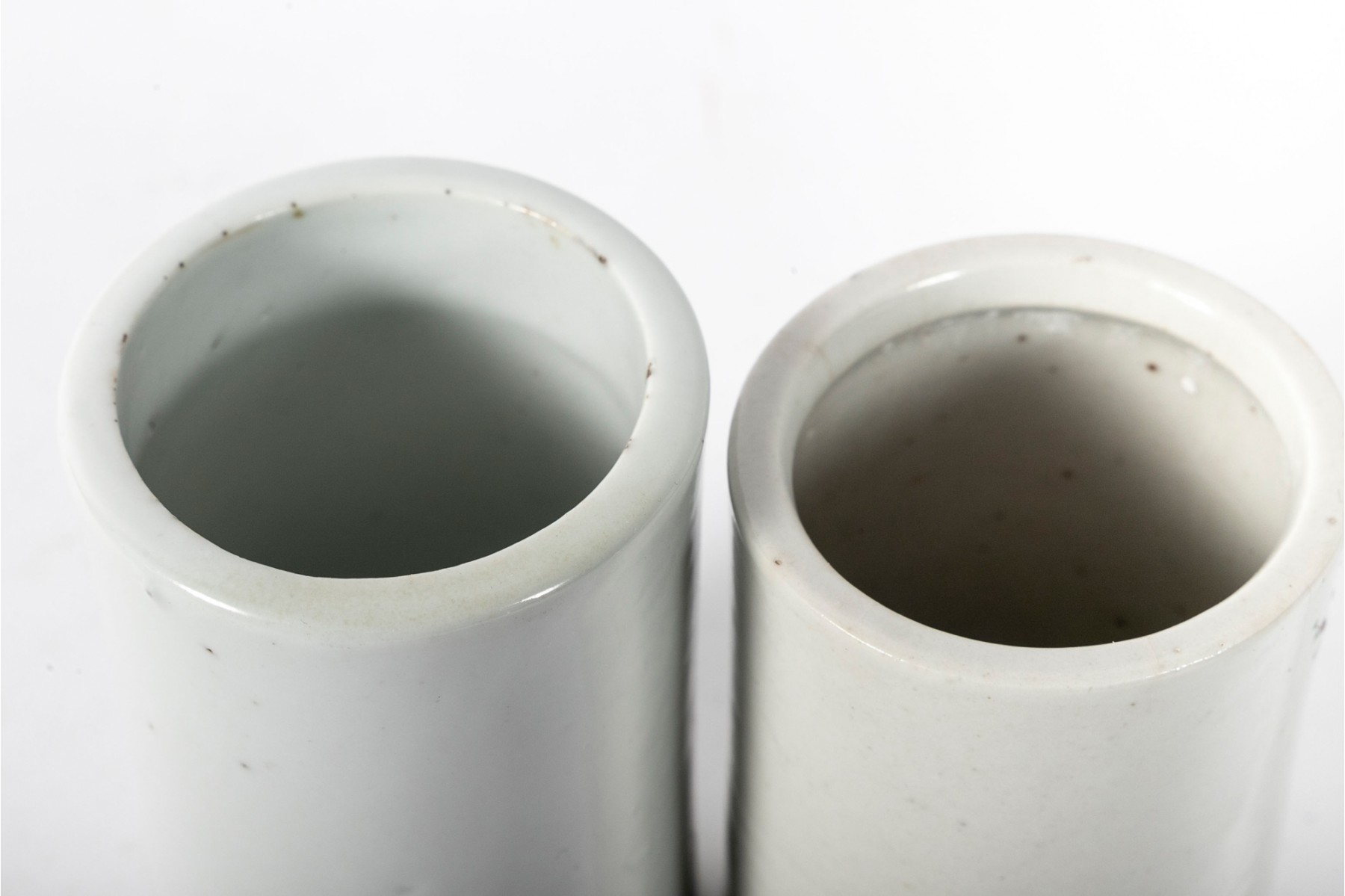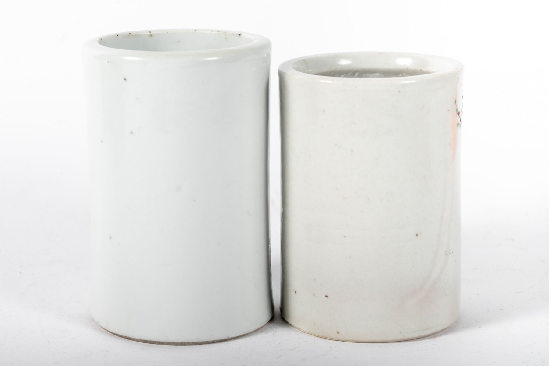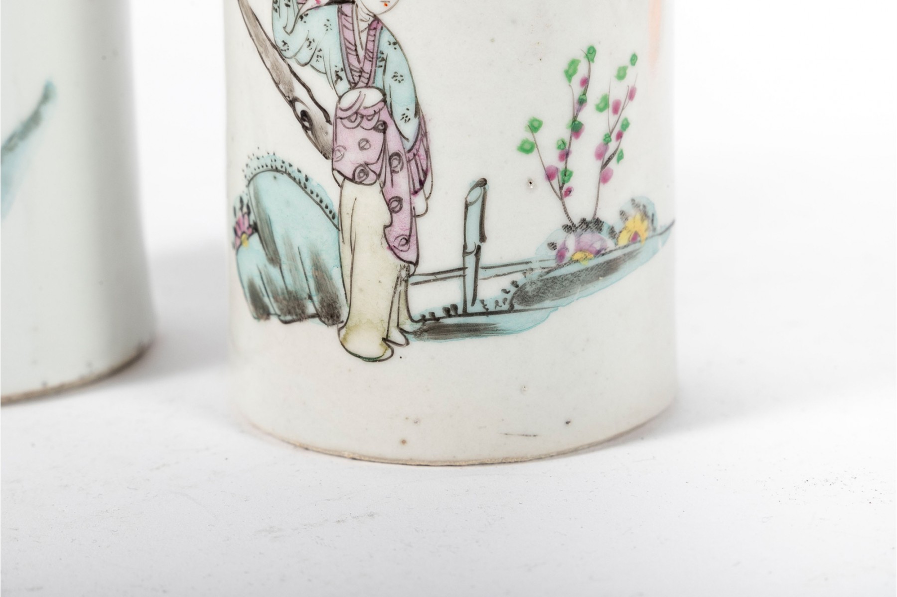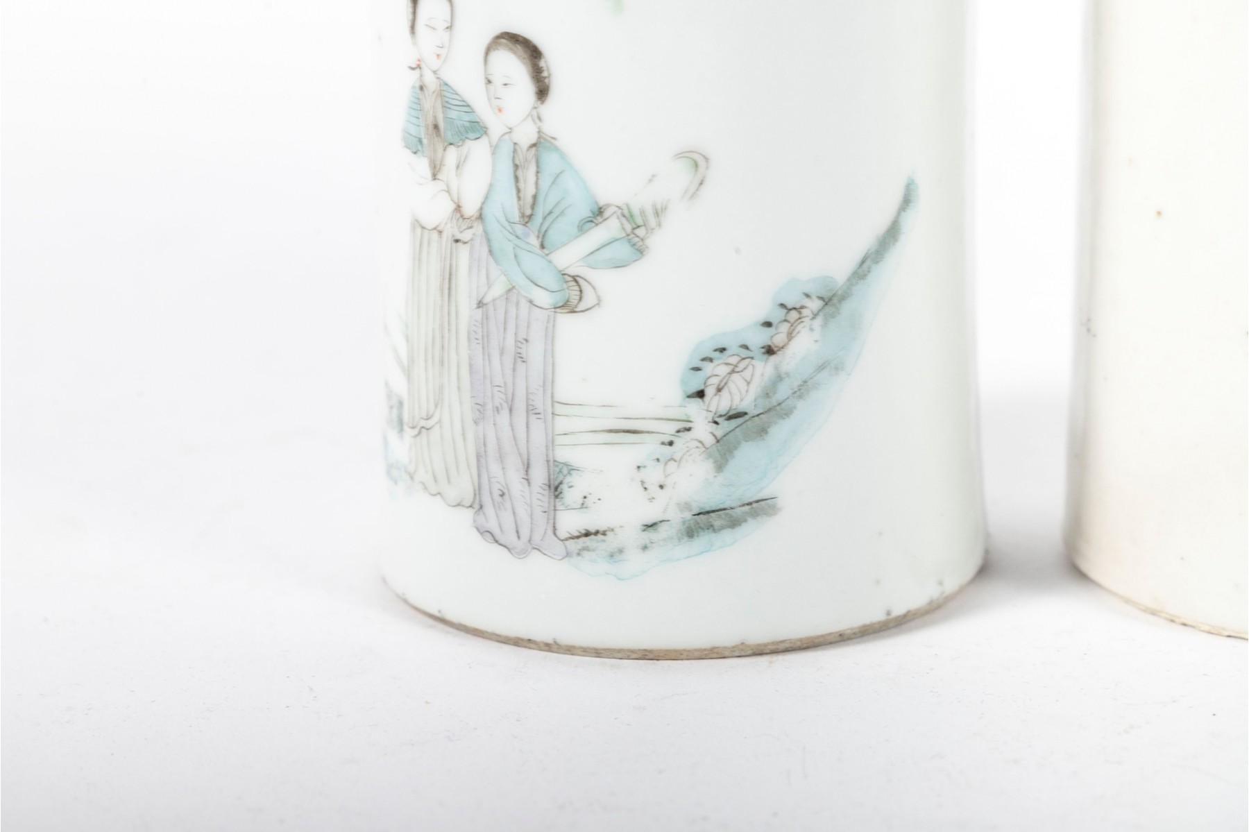 A fabulous duo of Chinese porcelain brush pots or vases in cylindrical form, hand-decorated with famille rose scenes of women in nature. The shorter cup displays a single woman in blue, pink, and yellow; standing under a flowering tree with pale blue rocky outcrops along a bamboo fence. The taller cup features two women enjoying time together under a flowering tree.