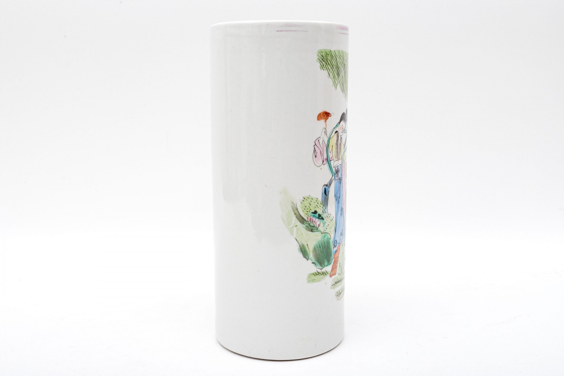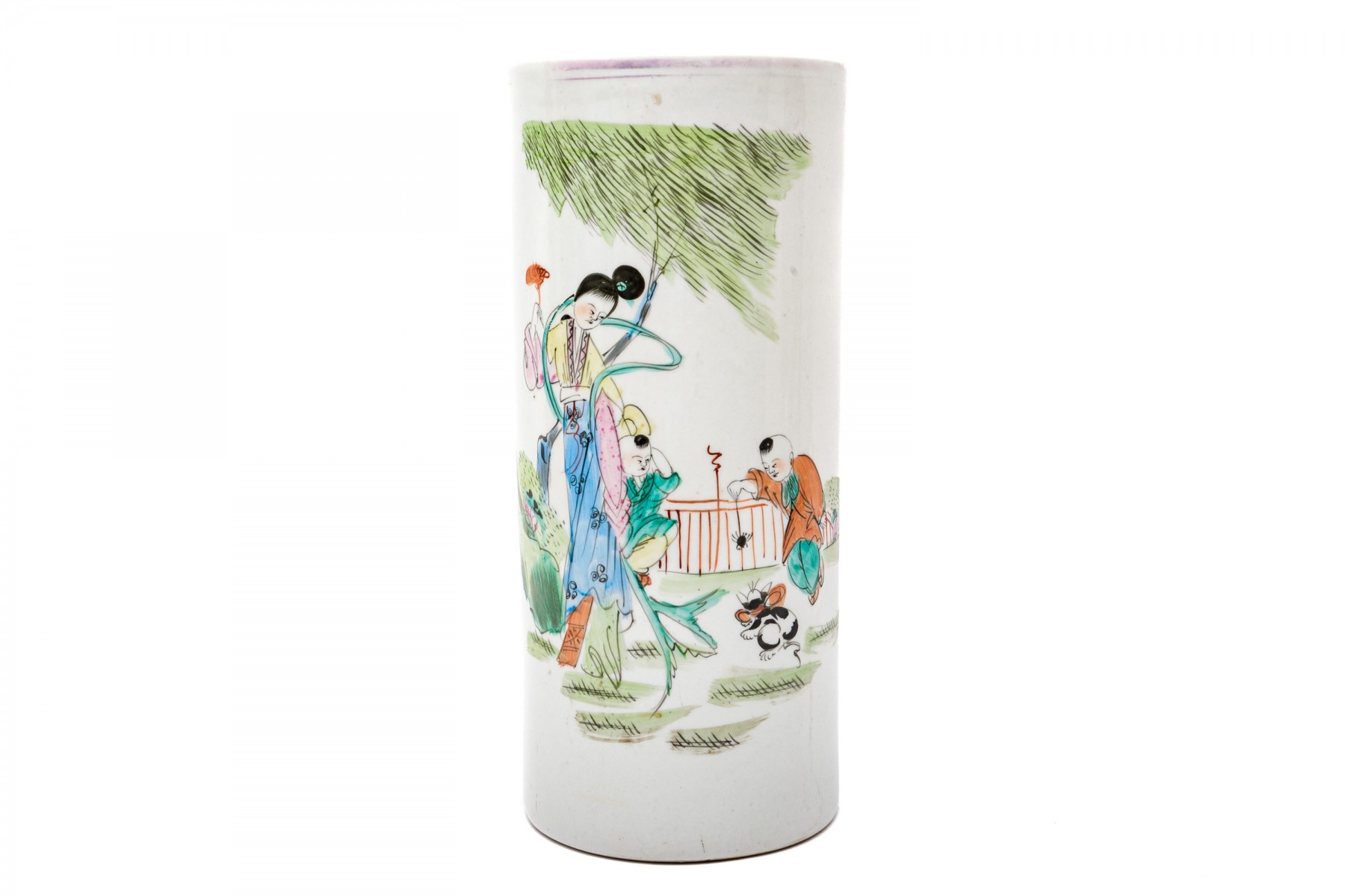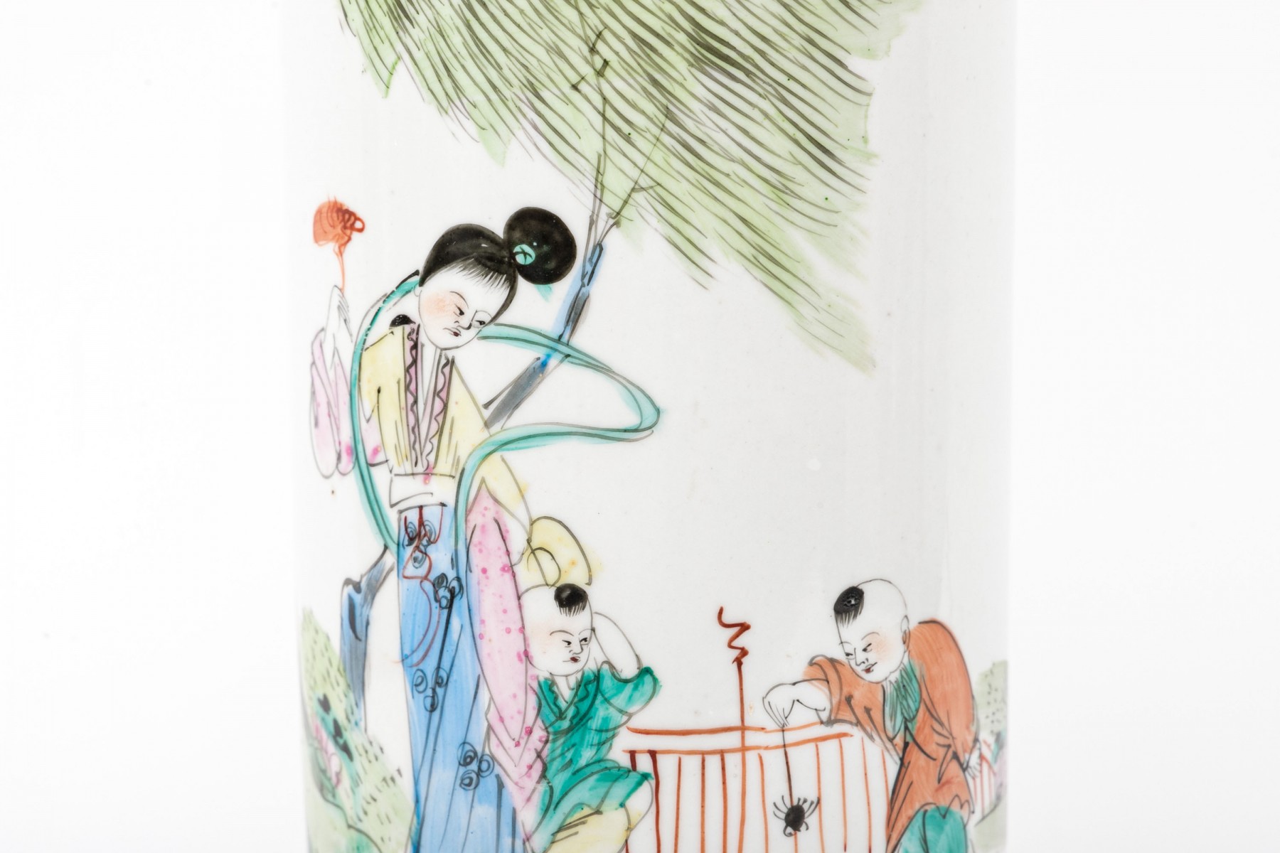 A wonderful Chinese porcelain famille rose vase in cylindrical form, decorated with a scene of a mother and children enjoying nature.