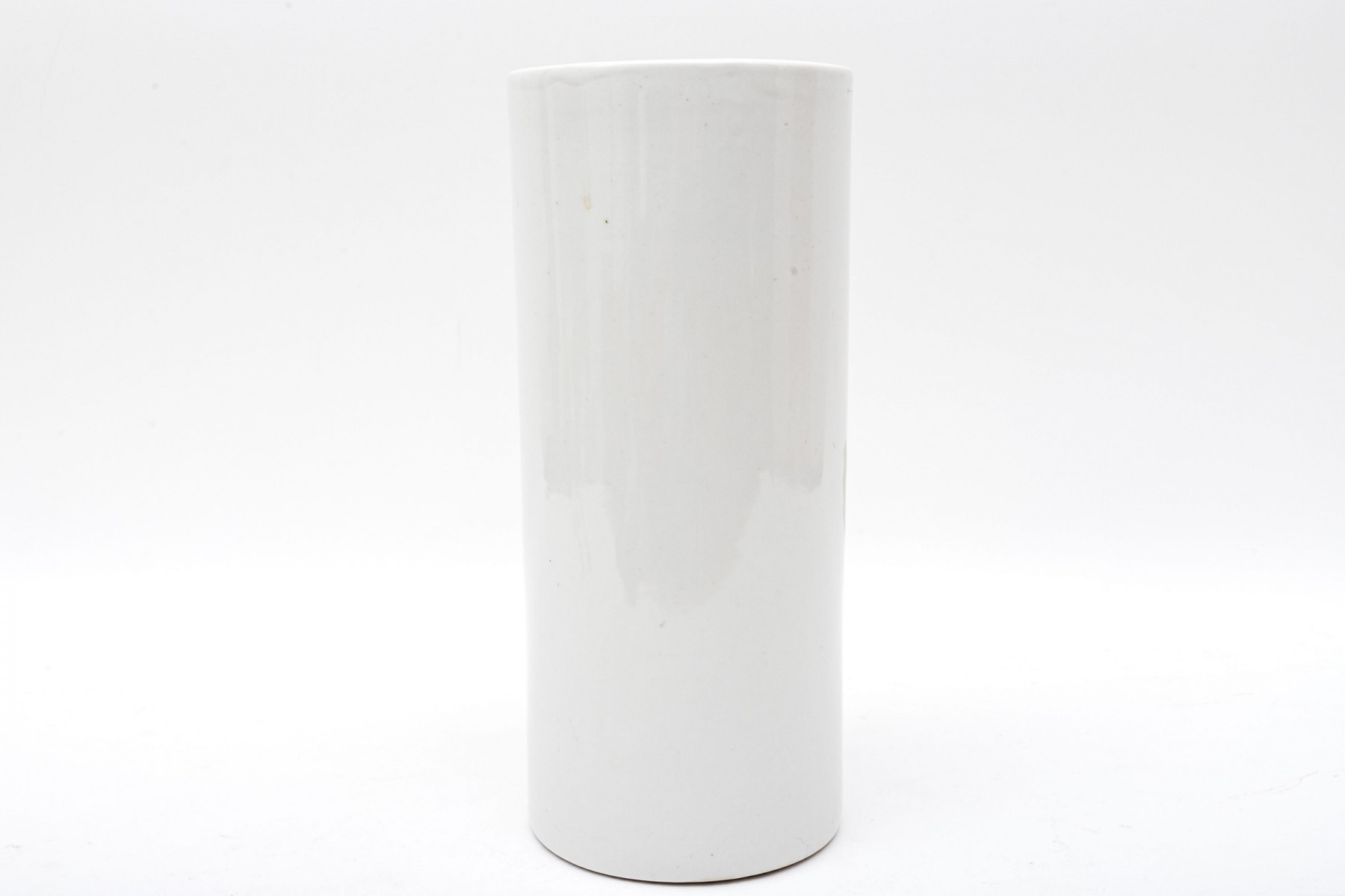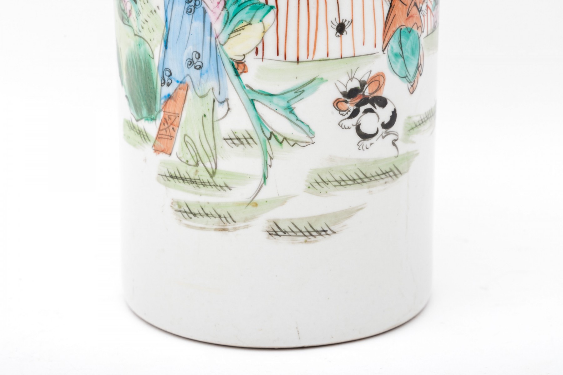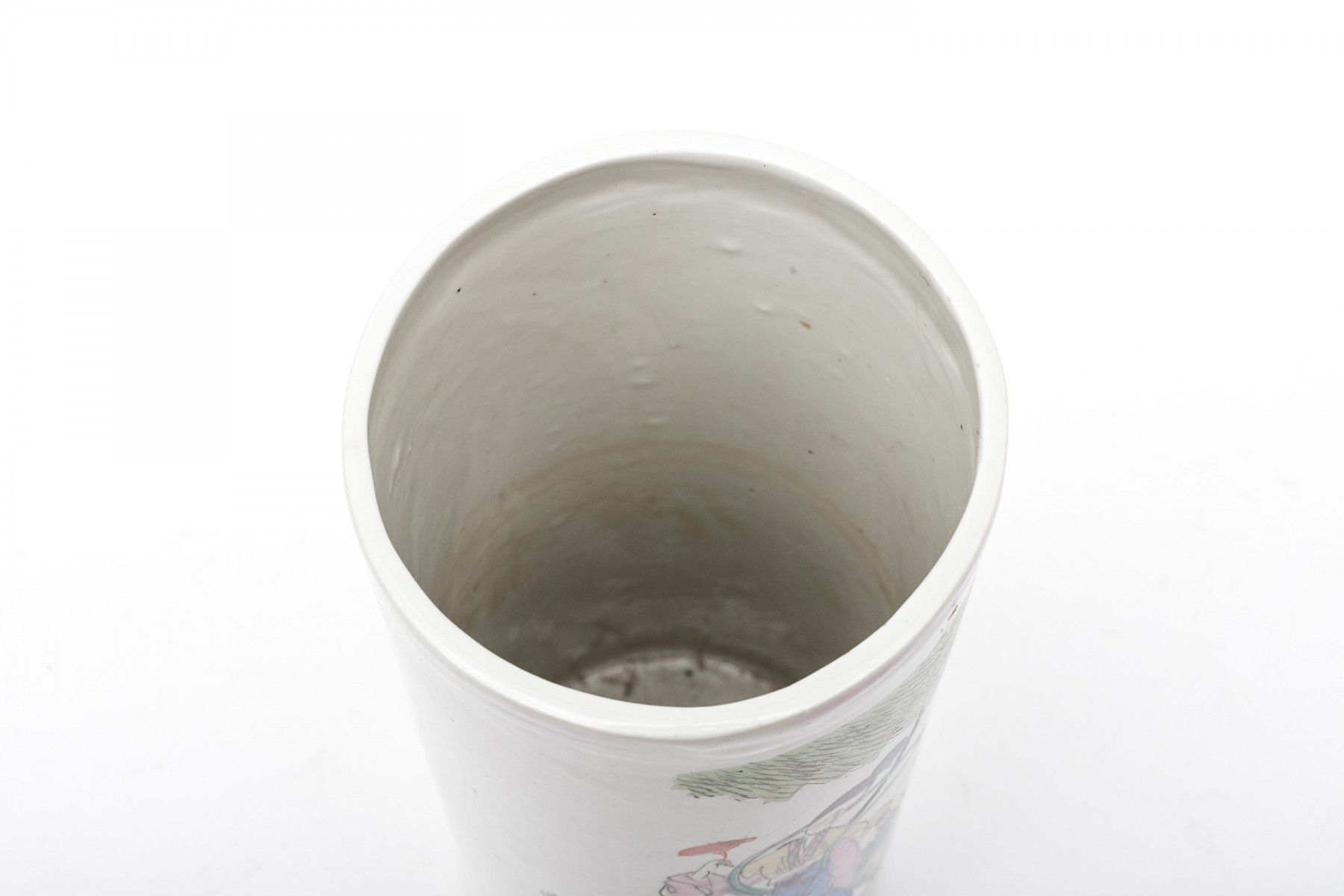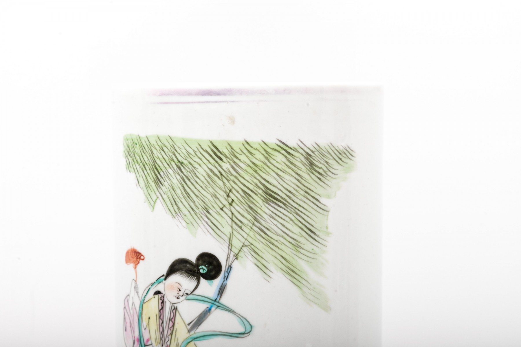 A wonderful Chinese porcelain famille rose vase in cylindrical form, decorated with a scene of a mother and children enjoying nature.